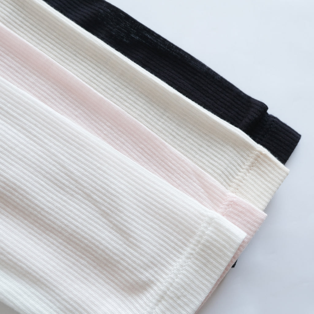 レーヨン糸とストレッチ糸を引き揃えて編み立てたオリジナルのリブ生地。肌触りがとても滑らかで、とろみがある素材です。伸縮性もたっぷり。シワになりづらい生地なので、冷房対策など、コンパクトに丸めて持ち運びもできます。夏らしい透け感と、凹凸が目立ちすぎないフラットなリブにこだわり開発しました。