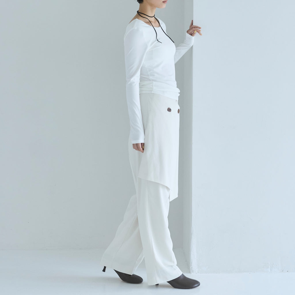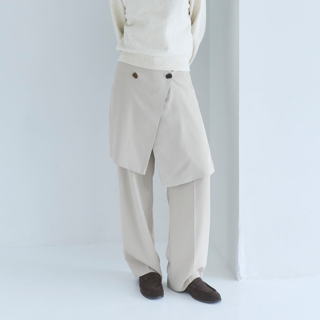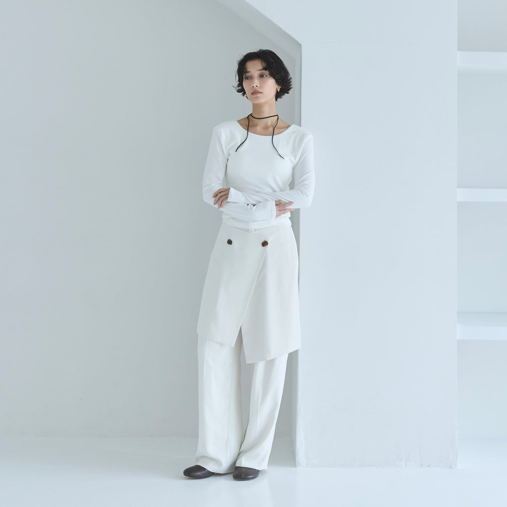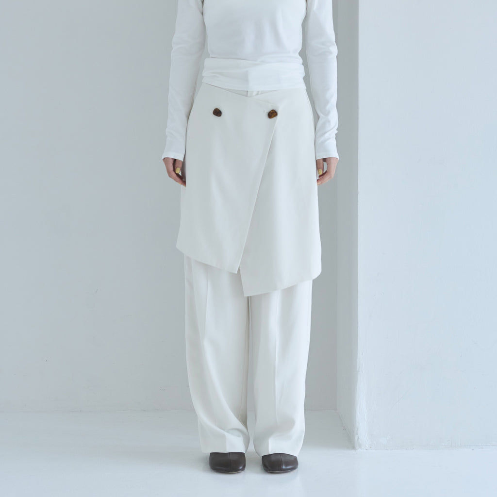 今年のキーワード、レイヤードルックを1本で叶えるテーパードパンツ。ラップスカートをプラスしたようなシティライクなデザインが印象的です。