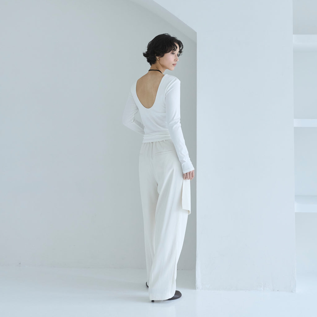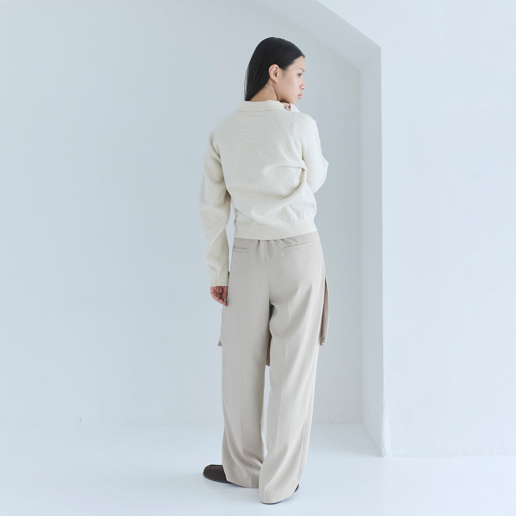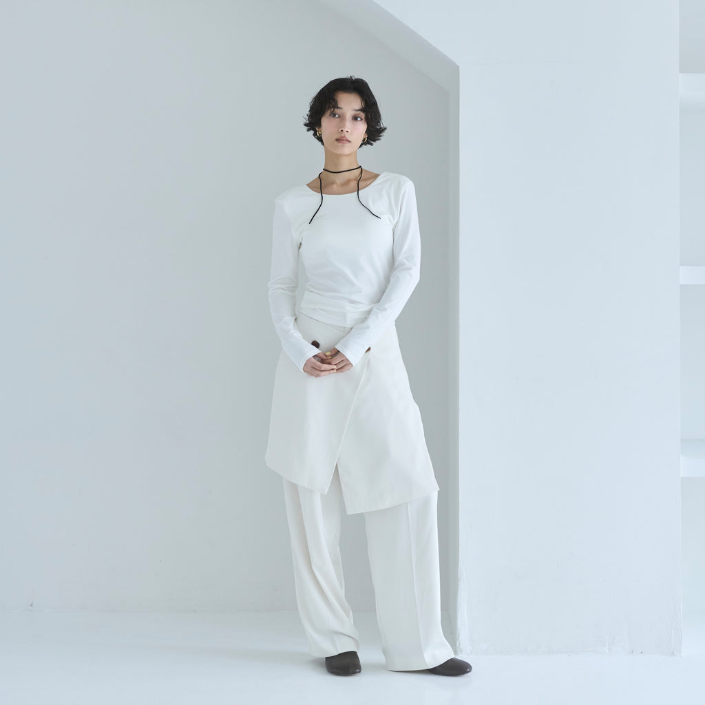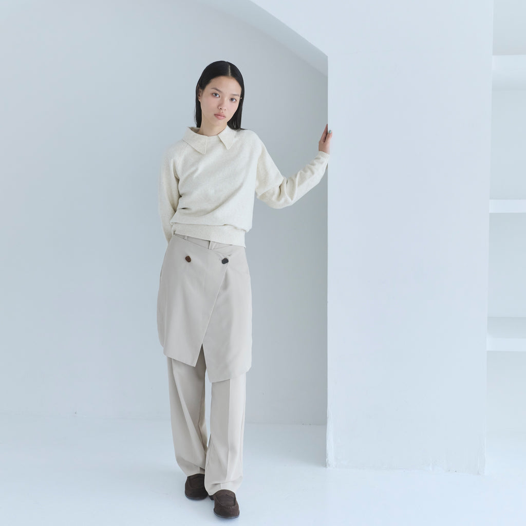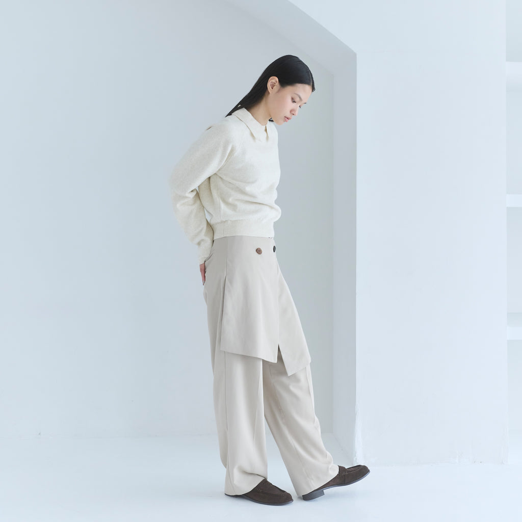 今年のキーワード、レイヤードルックを1本で叶えるテーパードパンツ。ラップスカートをプラスしたようなシティライクなデザインが印象的です。