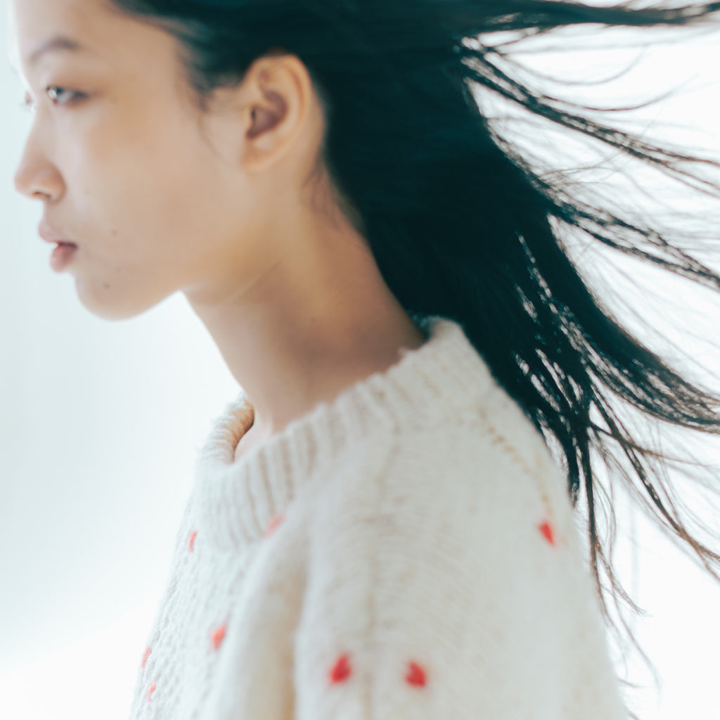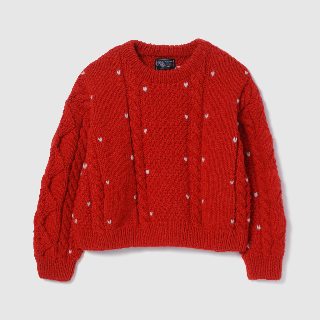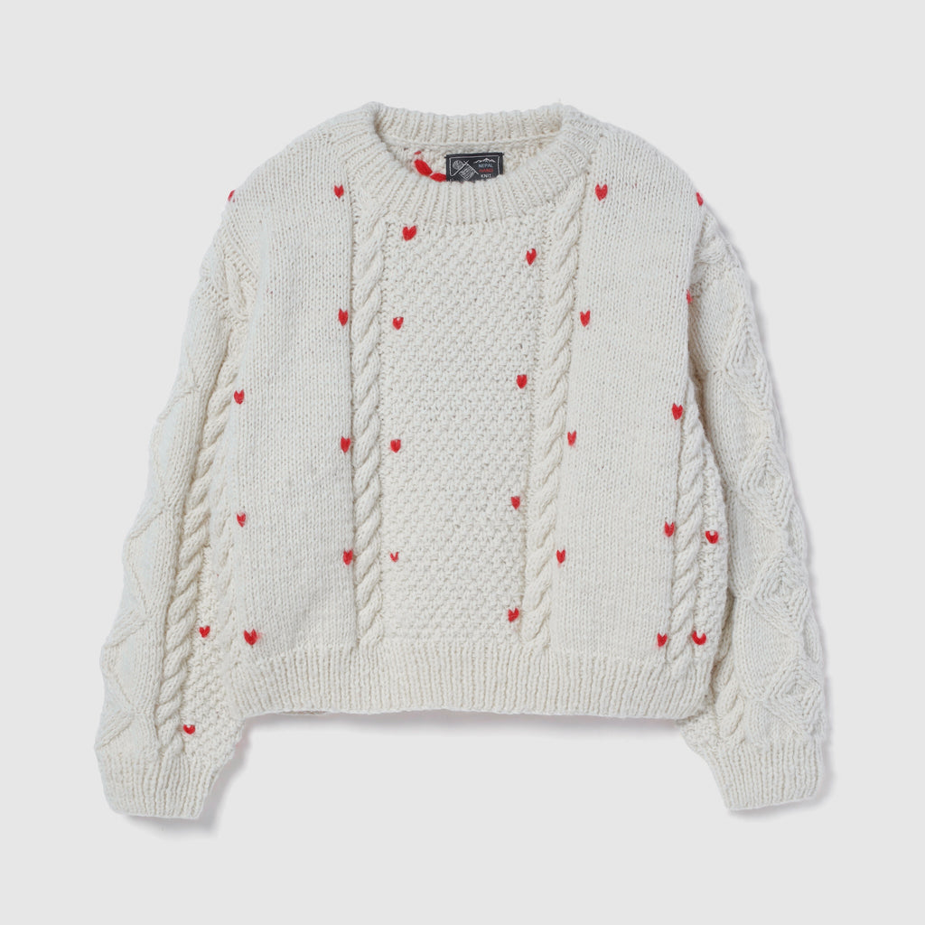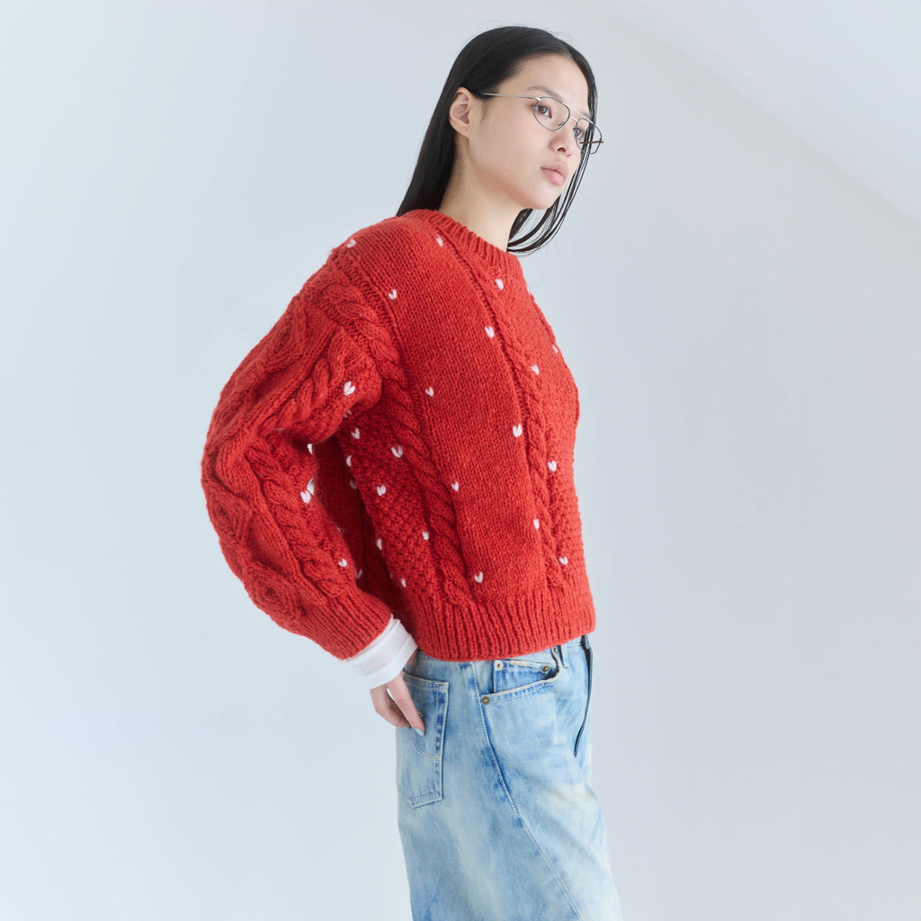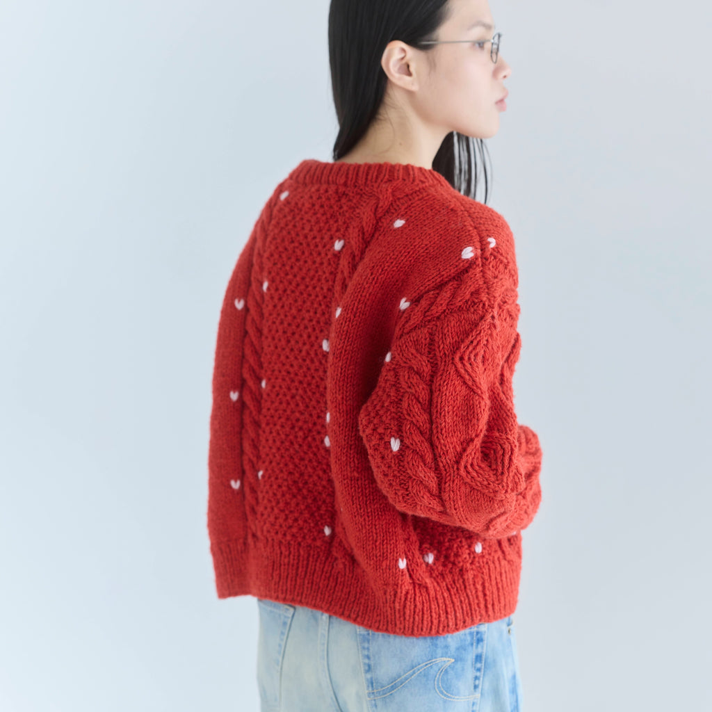 鹿の子編み、ケーブル編み、平編みといった様々な編み地を組み合わせた贅沢なニット。各所に散りばめられたハートはサイズ感、位置、配色までとことんこだわりました。甘すぎず、大人も楽しめるハート柄ニットです。