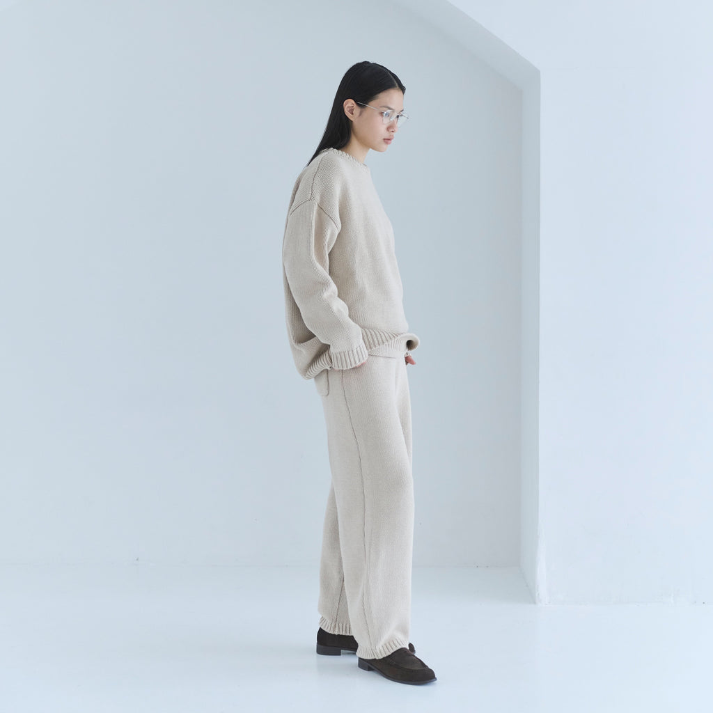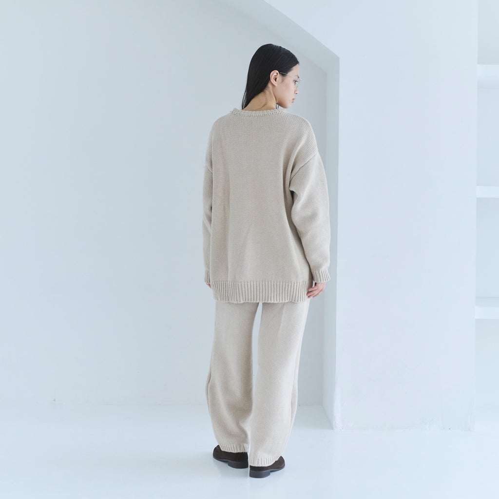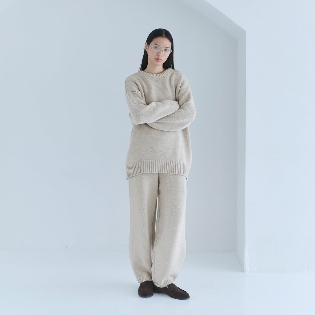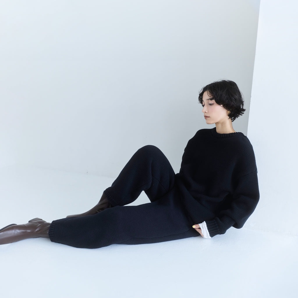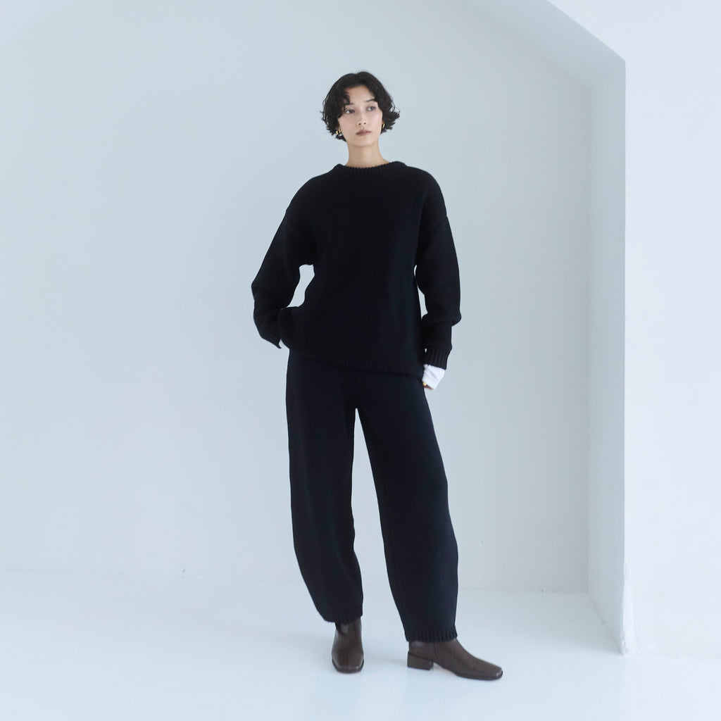〈Heavyコットンボリュームニットパンツ〉と同色展開ですので、セットアップでルーズなスタイリングがお楽しみいただけます。