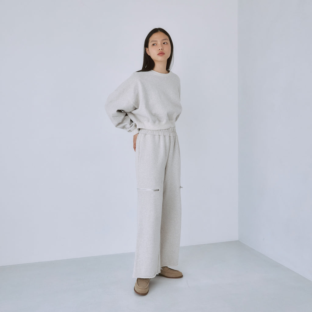 以前登場し大好評だった〈ハイウエストZipカットスウェットパンツ〉と同型。太ももからストンと落ちるストレートシルエットです。