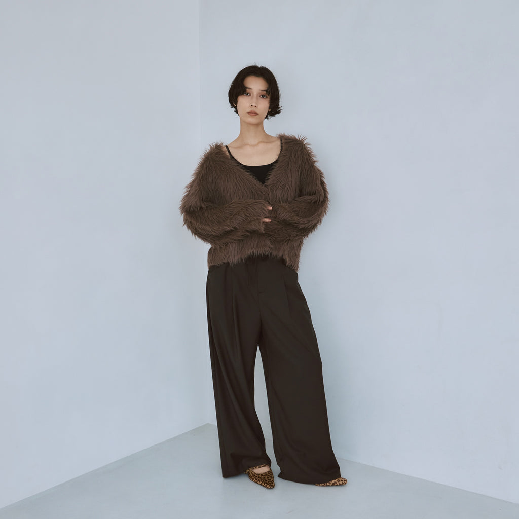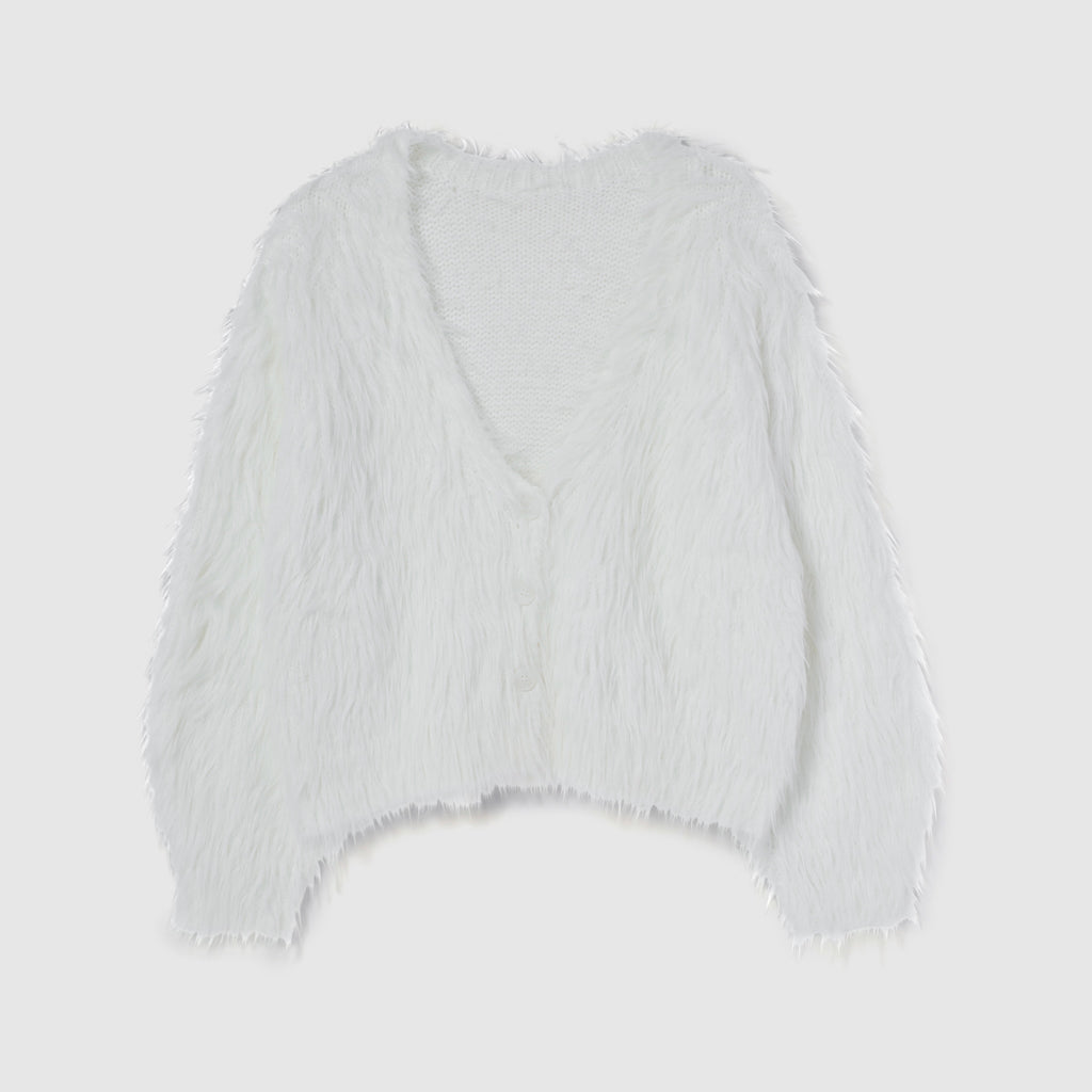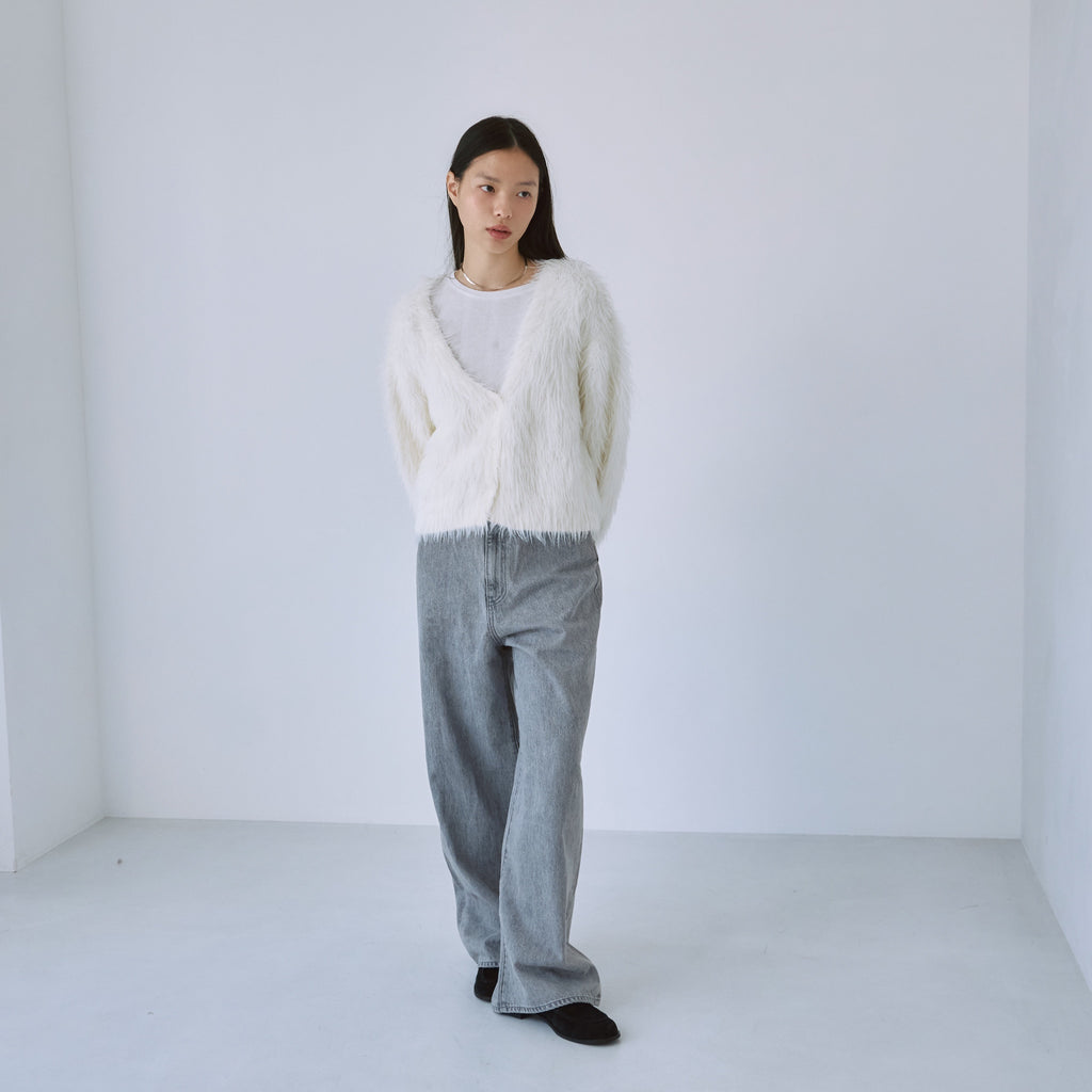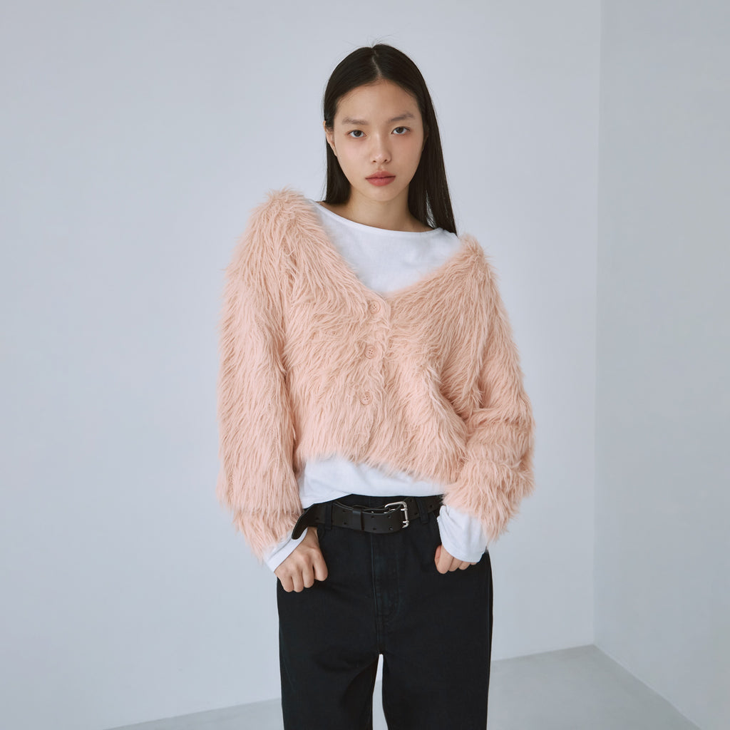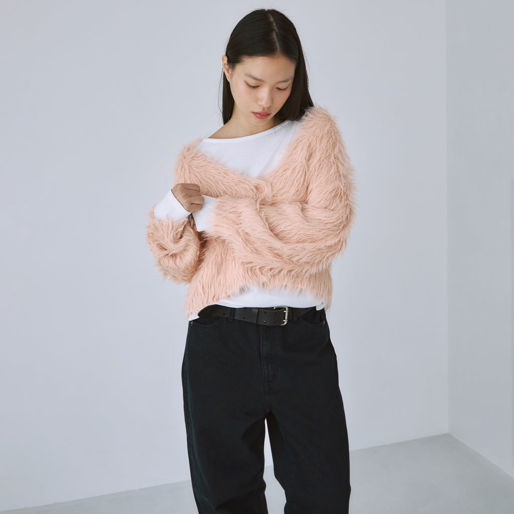 毎年大人気、ふわふわの毛足が可愛い〈ヘアリーシャギー〉シリーズのニット。クロップド丈のコンパクトなVネックカーディガンは初登場となります。重ね着が多様なスタイルを生む、今シーズンマストな1枚。