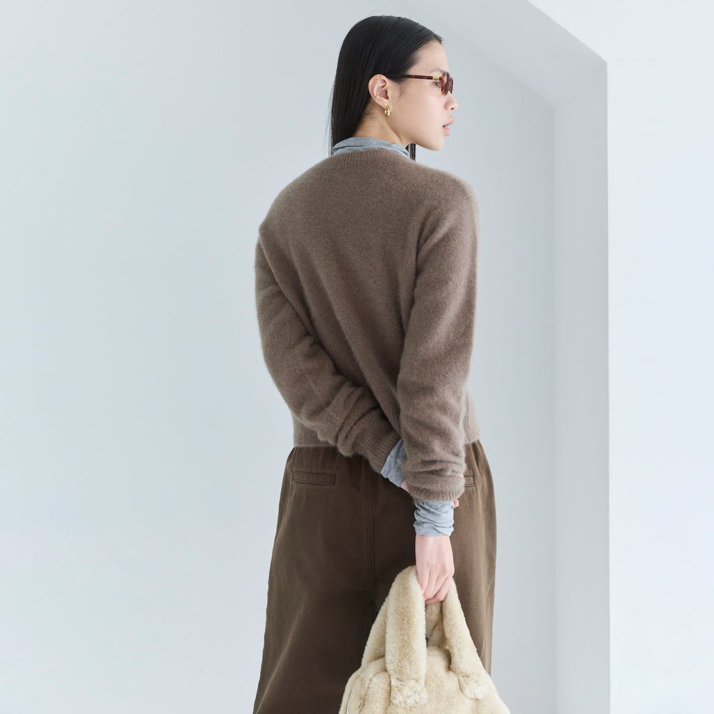 同時再入荷の〈Fox mixベーシッククルーカーディガン〉よりもフォックスとウールをさらに高混率にし、よりリュクスで暖かみのある風合いに仕上げました。