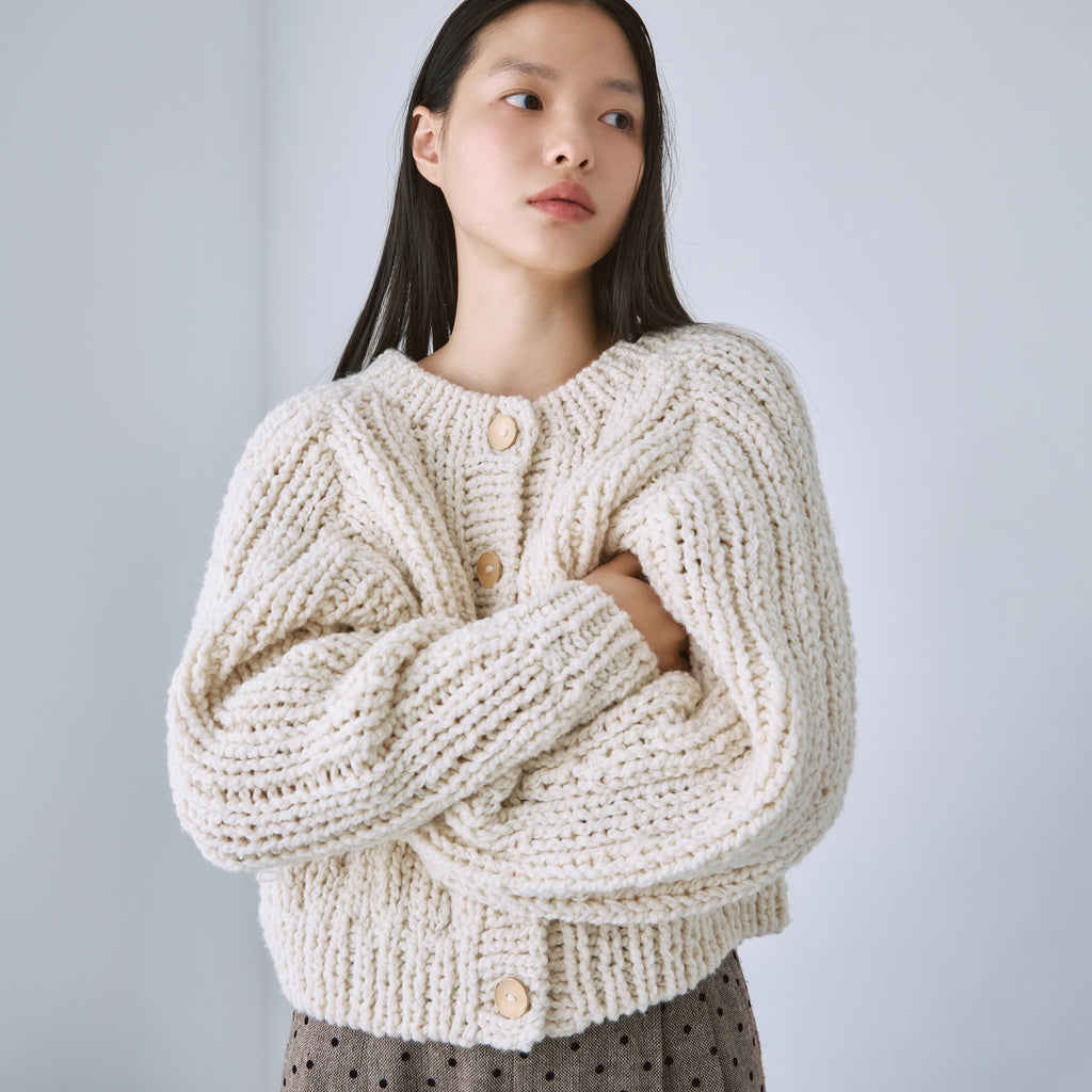 ペルー産ハンドメイドニットらしい太糸と優しい表情が特徴のカーディガン。ウール混素材でアウター感覚の暖かさもあり、季節を問わずレイヤードスタイルを楽しめる万能アイテムです。