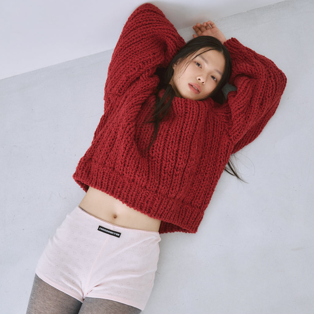 【冬も暖かウール混のブークレニット】太い糸にループ状のブークレ糸を引き揃え、もっちりとしたタッチとさりげない凹凸をプラス。ハンドメイドならではのざっくりとした編み地が、程良いボリューム感と豊かな表情を演出します。