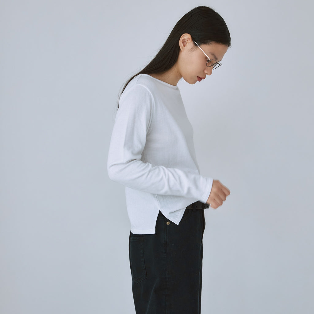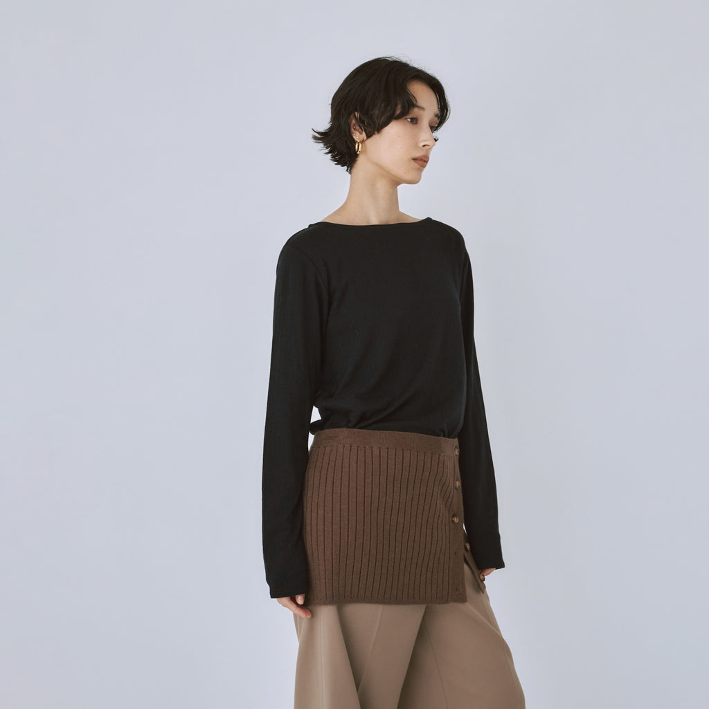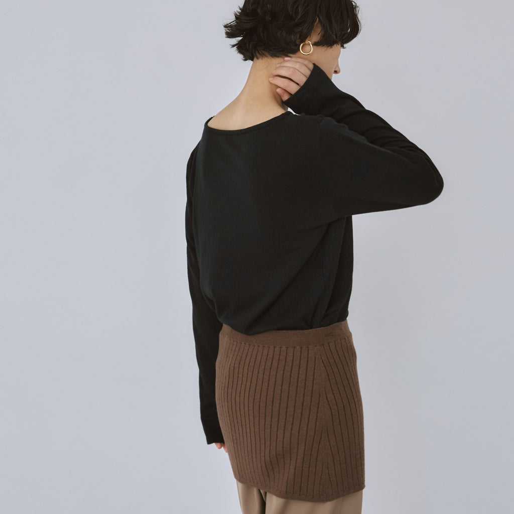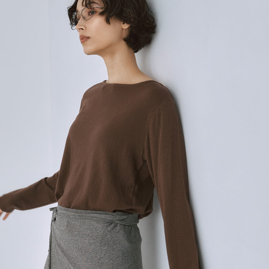 すっきりシンプルなルックスに、首元は女性らしい抜け感のあるボートネックを採用。リブやフライスをあえて付けず、ミニマルに仕上げることで着回しやすさをプラス。