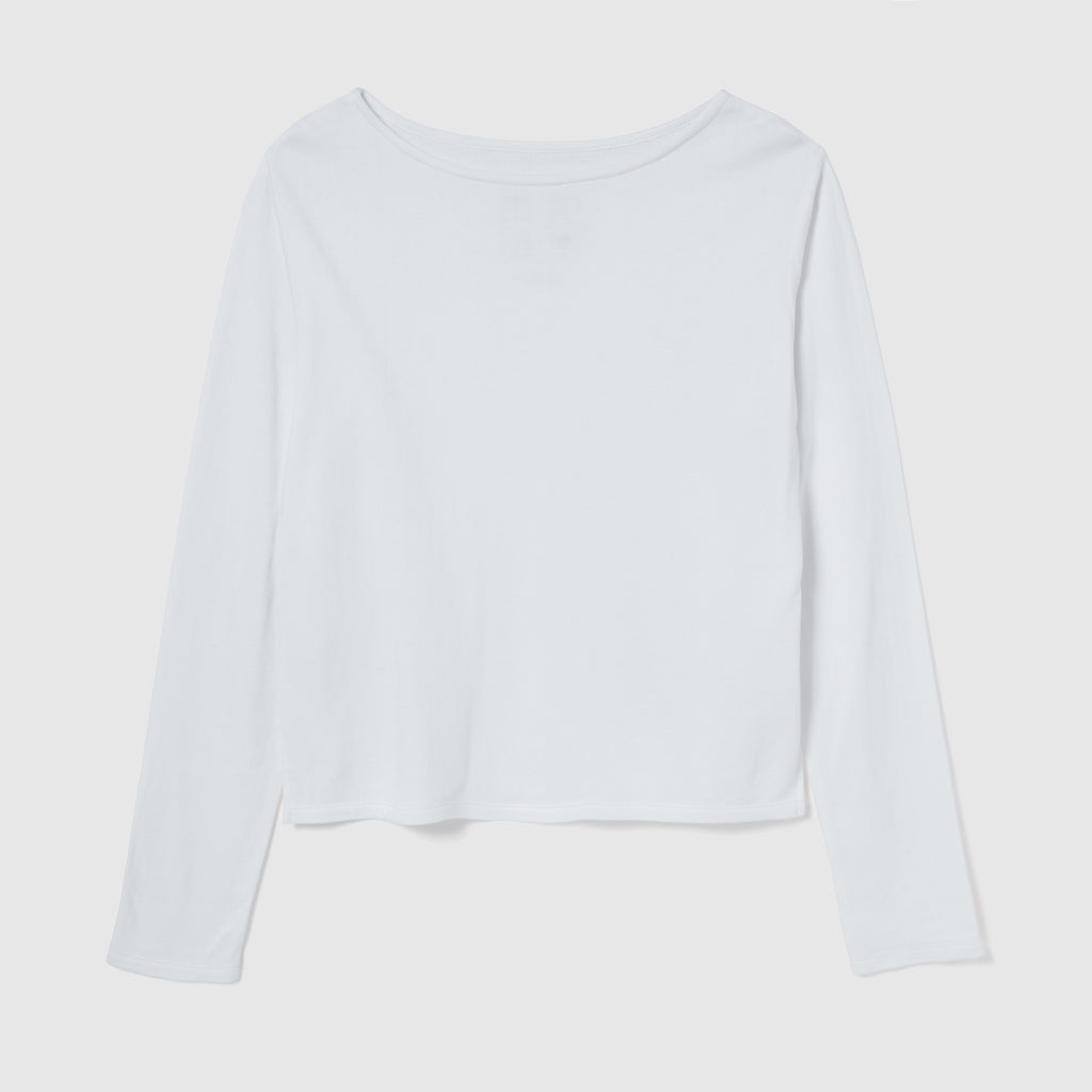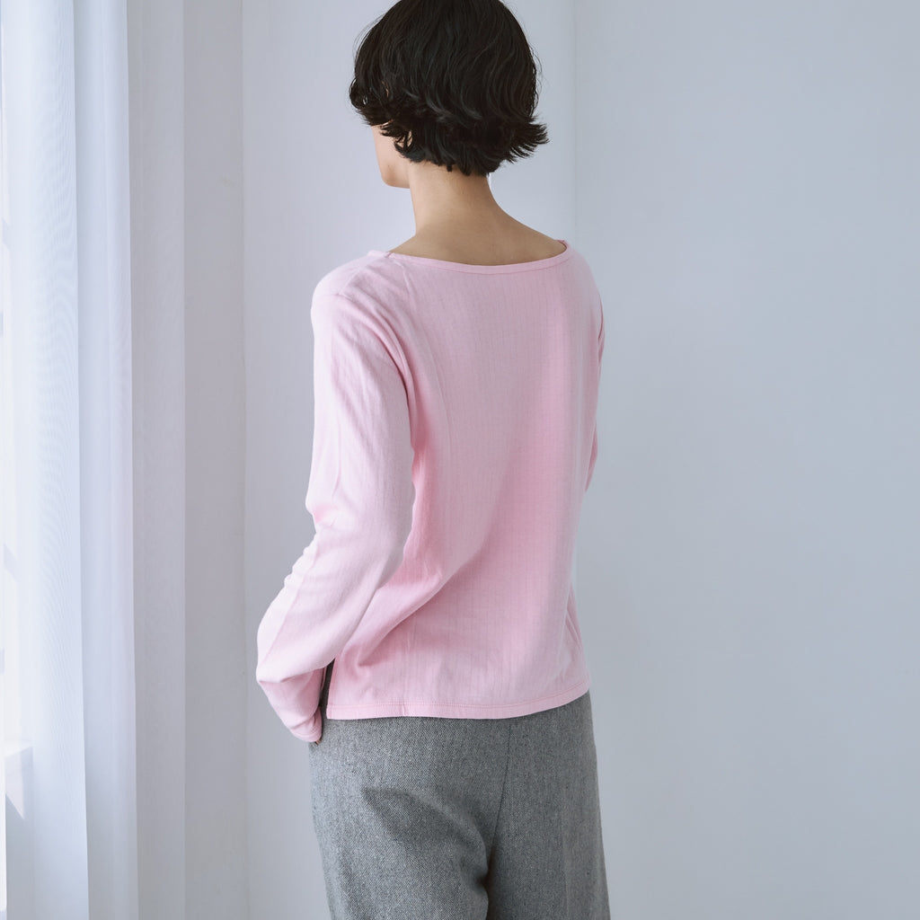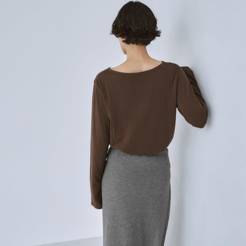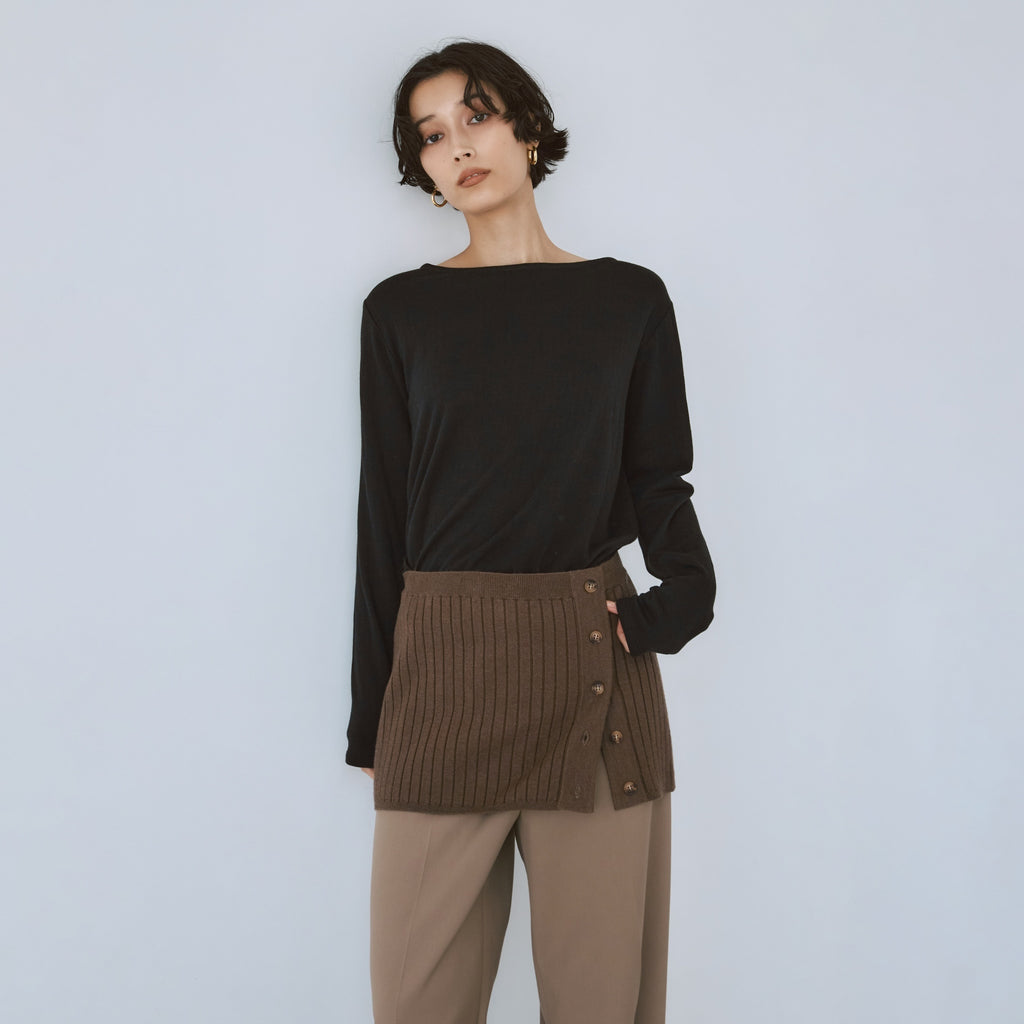 すっきりシンプルなルックスに、首元は女性らしい抜け感のあるボートネックを採用。リブやフライスをあえて付けず、ミニマルに仕上げることで着回しやすさをプラス。