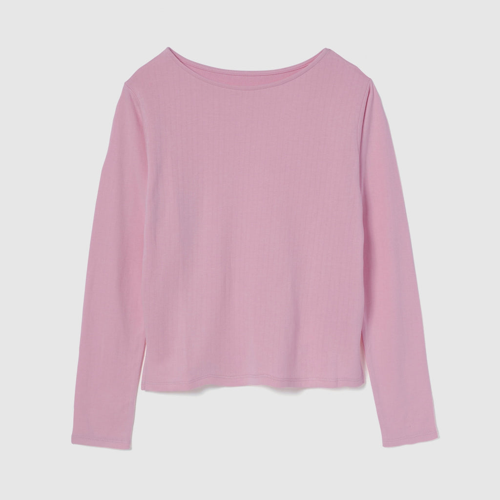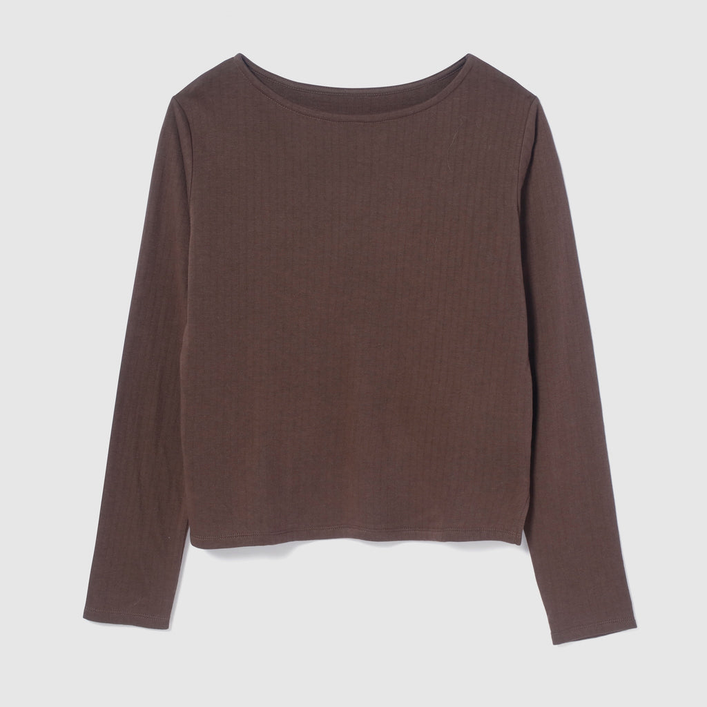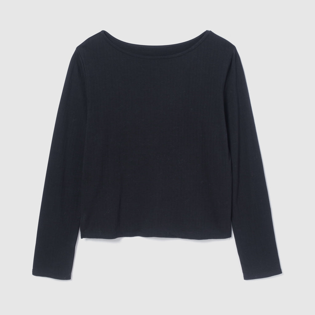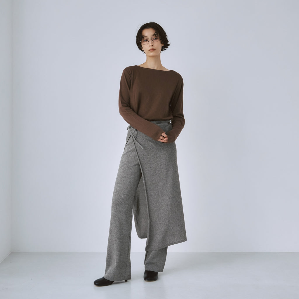 すっきりシンプルなルックスに、首元は女性らしい抜け感のあるボートネックを採用。リブやフライスをあえて付けず、ミニマルに仕上げることで着回しやすさをプラス。