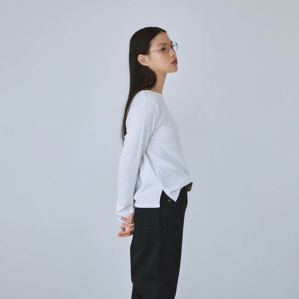ややタイト寄りのストレートライン。重ね着しても着膨れせず、1枚で着てもサマになるベーシックなシルエットで、日常使いにちょうど良いバランス感に仕上げました。袖丈はやや長めの設定のためレイヤードスタイルにも最適です。