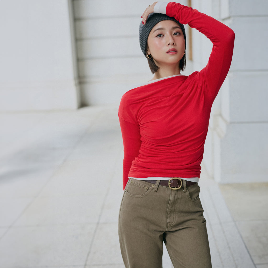 体にフィットするタイトシルエット。2枚を重ねてももたつかないよう、バスト脇にタックを入れて立体感をプラスしました。