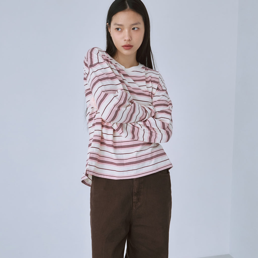 柔らかなコットン生地にマルチボーダーを配したルーズな形状のロンT。抜け感のあるゆったりシルエットと落ち着いた配色が秋冬にぴったり。ラフに着ても大人っぽく決まります。