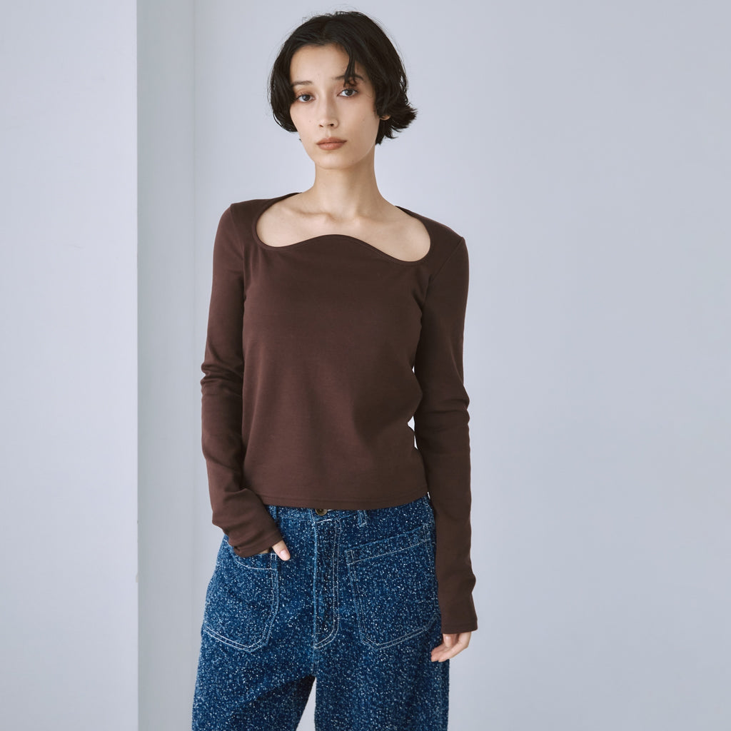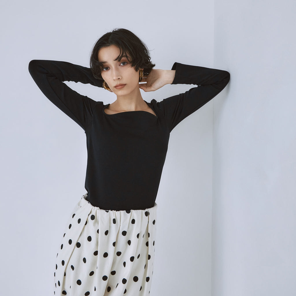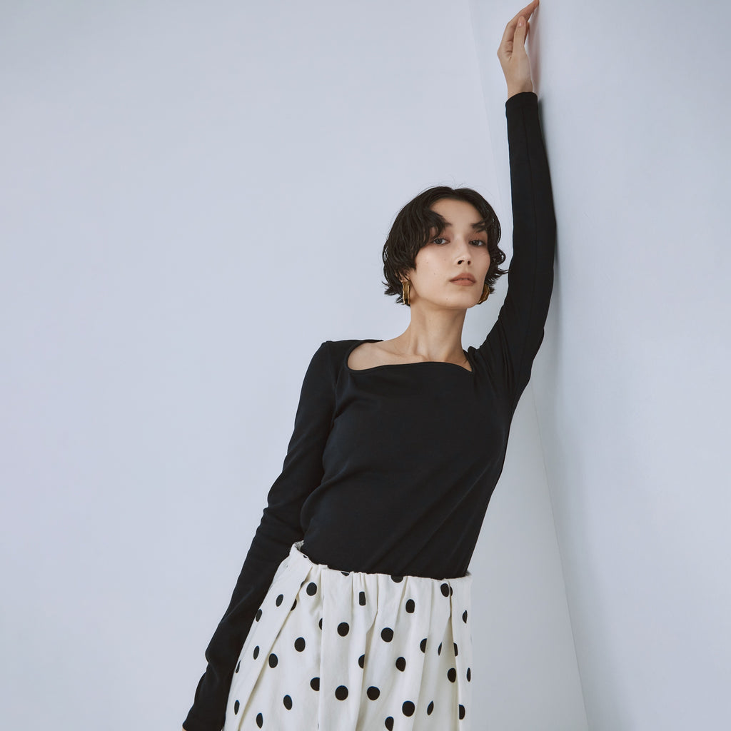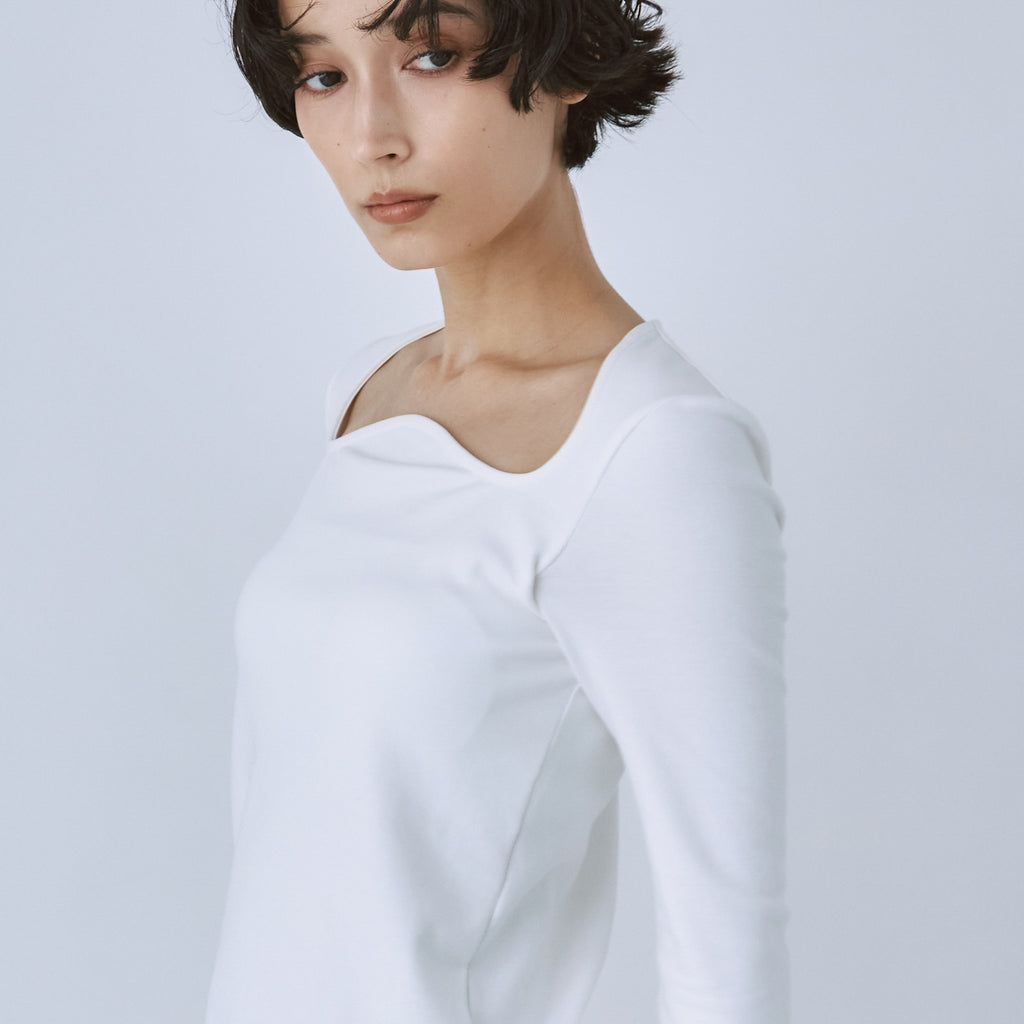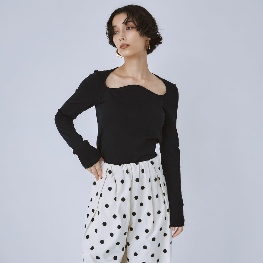 ネックラインを波状にカーブさせ、デコルテから肩にかけて美しく見せるトップス。首を長く、スッキリ見せるためにカーブの形状には細部までこだわりました。