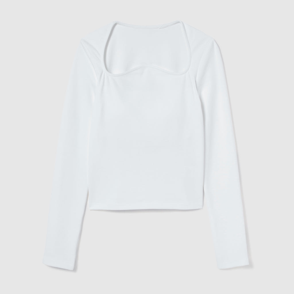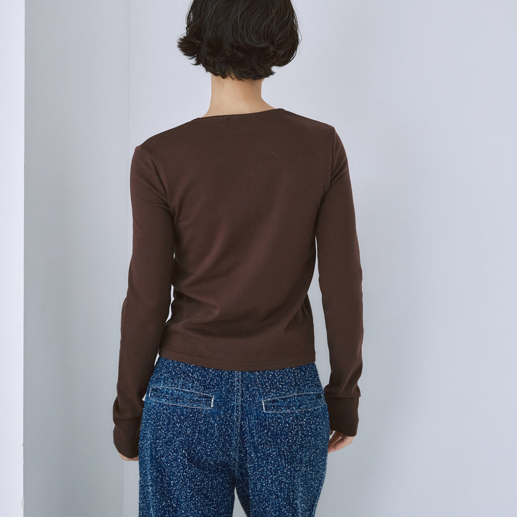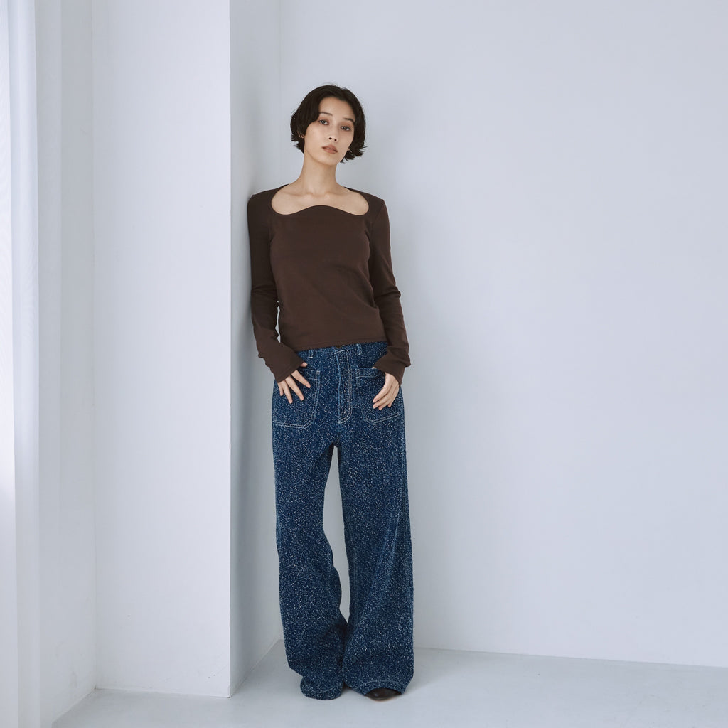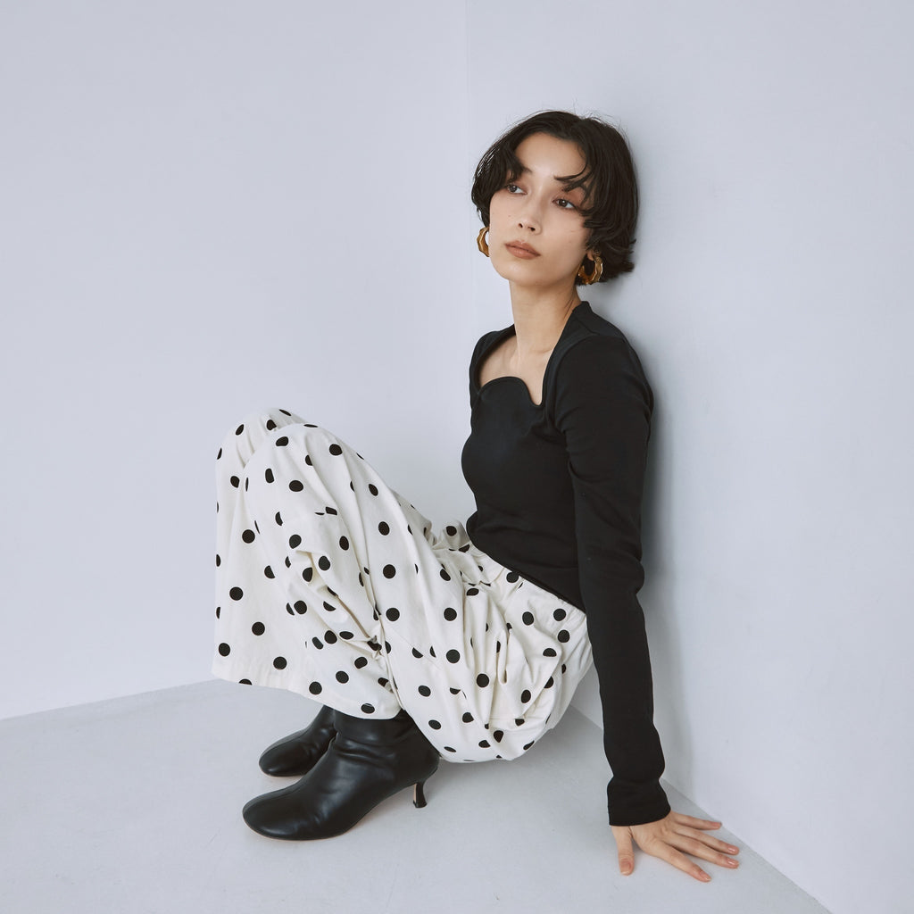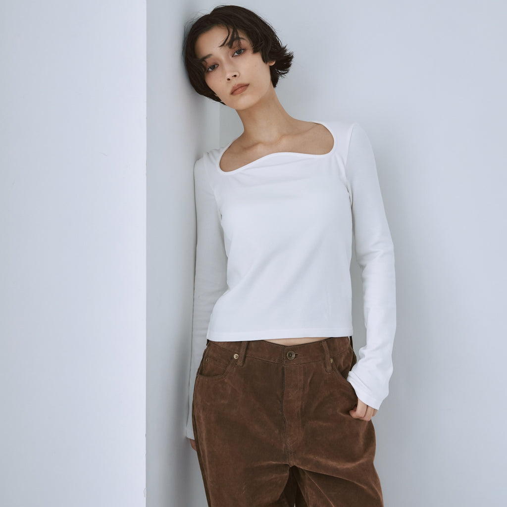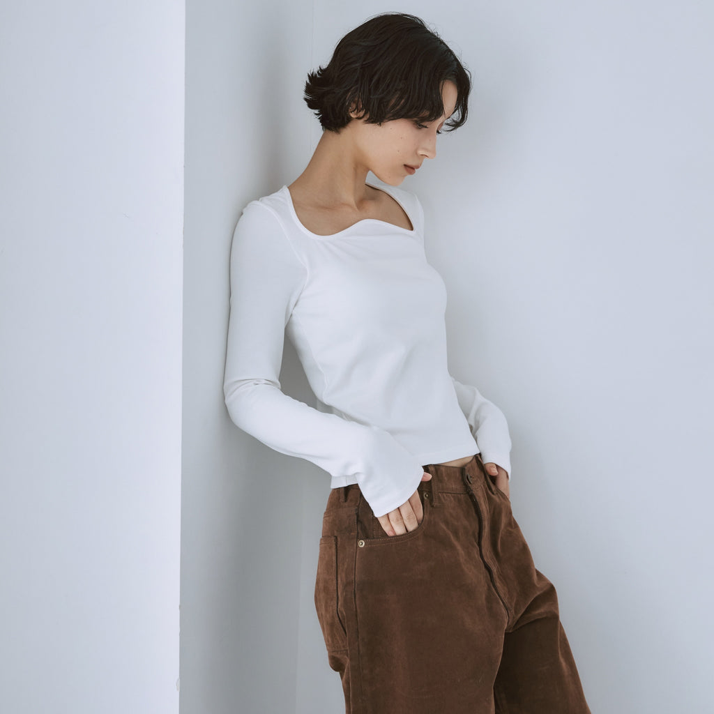 ネックラインを波状にカーブさせ、デコルテから肩にかけて美しく見せるトップス。首を長く、スッキリ見せるためにカーブの形状には細部までこだわりました。