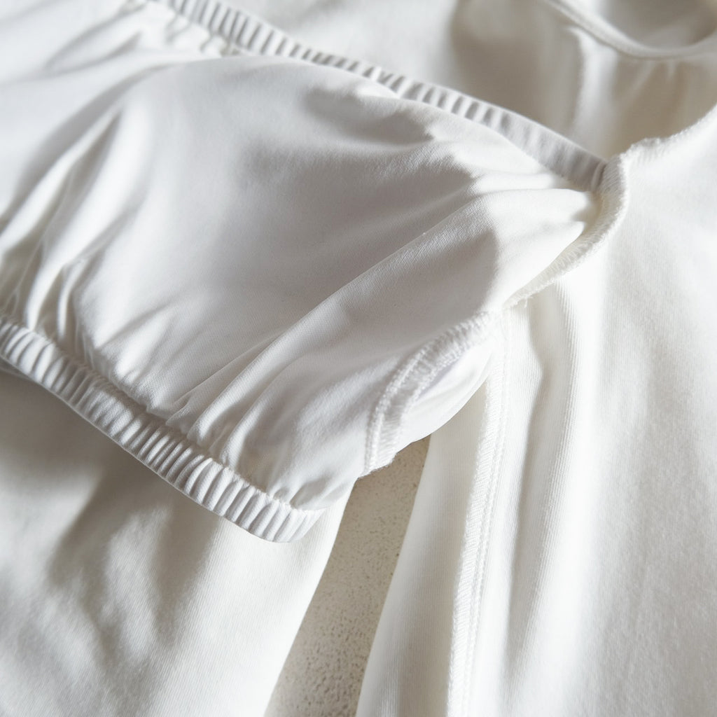 取り外し可能なパッド付きで、インナーを気にせず1枚で着用可能。バストをしっかりホールドするベア型のパッド袋を採用し、かがんだ際にも安心感もキープします。