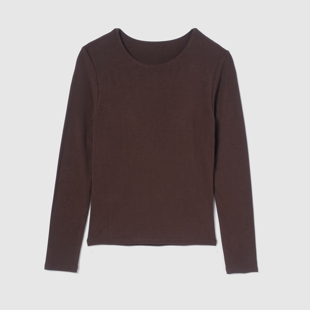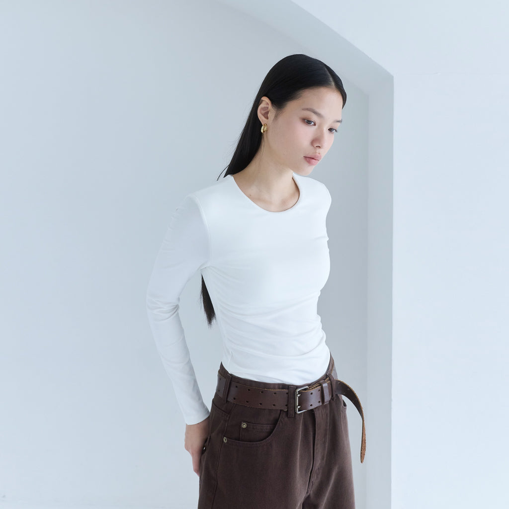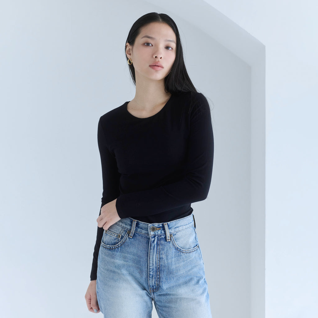 程良く開いたフロントのネックラインが、鎖骨を綺麗に、首元をスッキリと長く見せてくれます。バックネックも浅めに設定しているので、ベーシックに着られて重ね着にも対応。