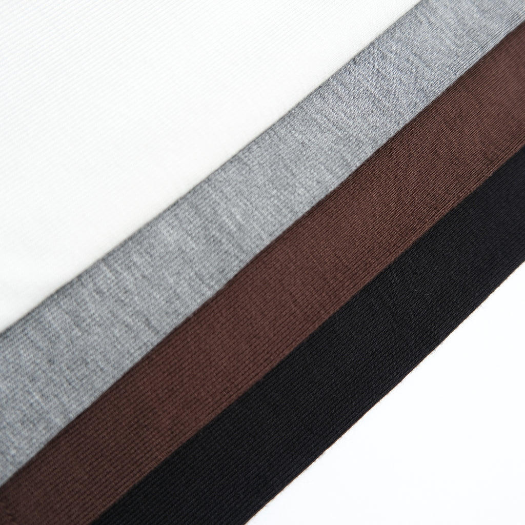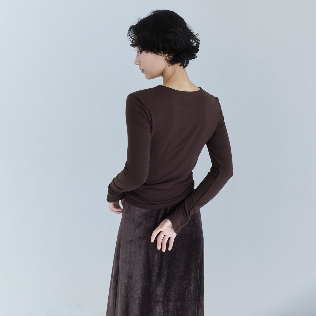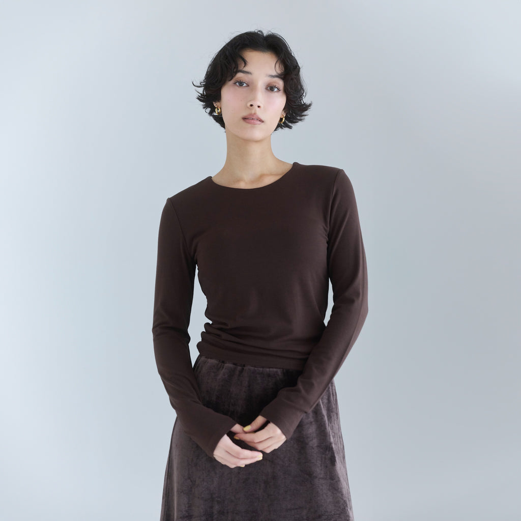 とろみのある天竺(てんじく)生地を使用。凹凸のないフラットな表面感で、上品な印象に仕上げています。伸縮性にも優れており、着心地が良くインナー使いもしやすい素材をセレクトしました。