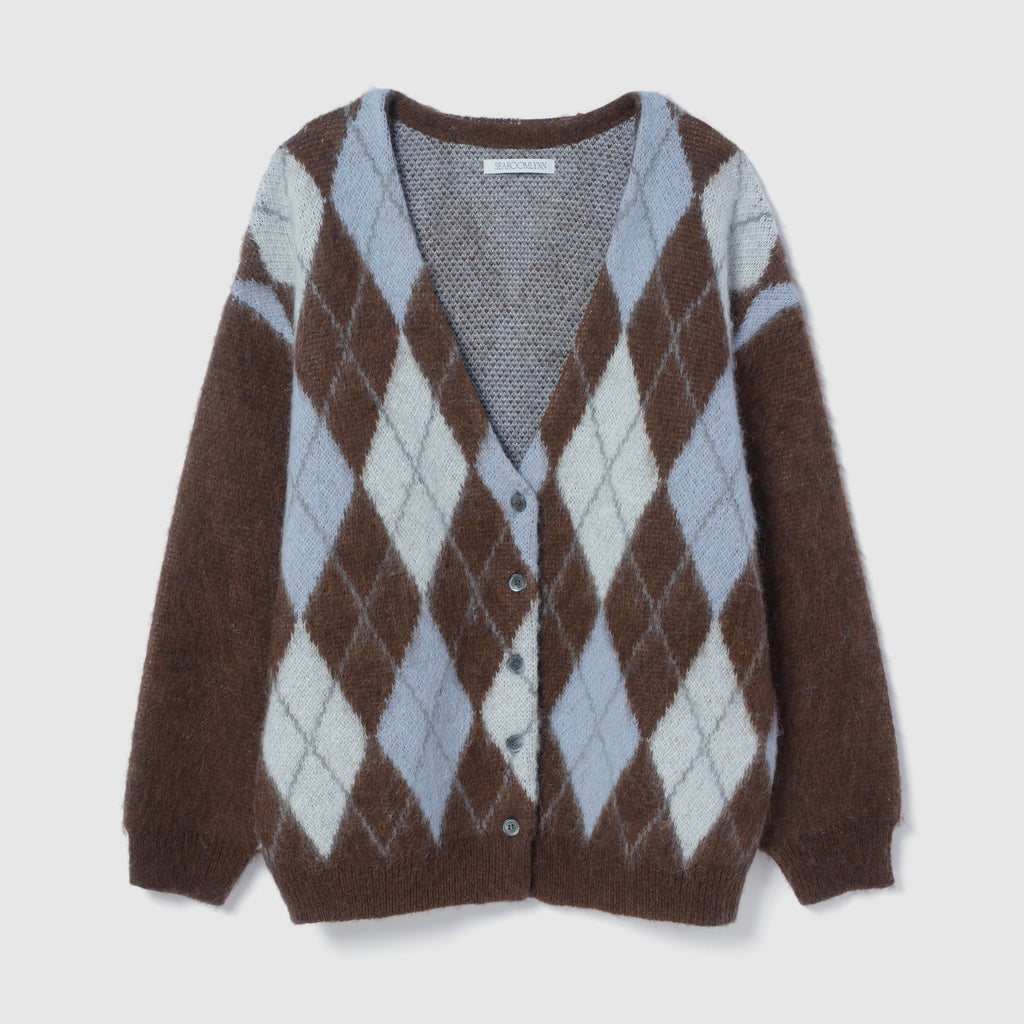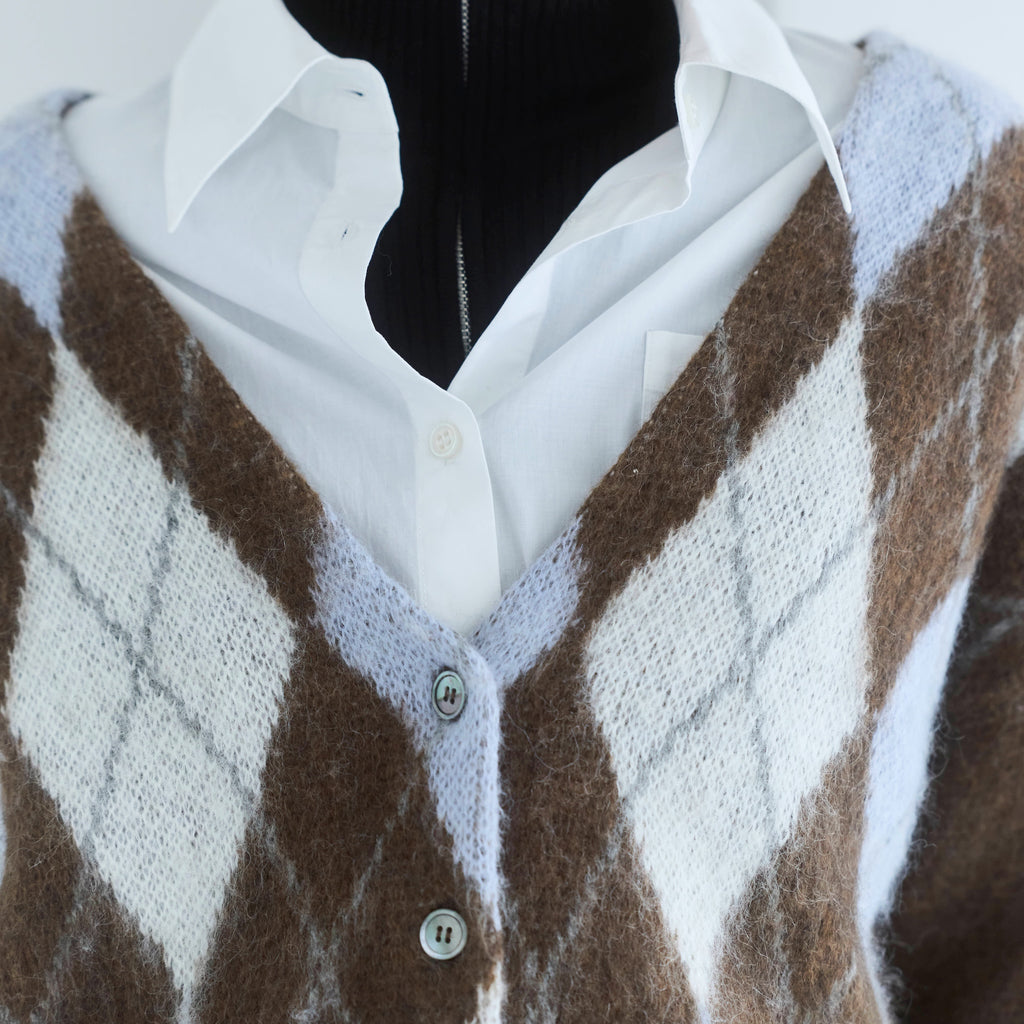 Vネックのベーシックなカーディガンデザイン。無地タイプに加え、優しい配色のアーガイル柄を展開。前立ては表に出さずシームレスな仕様に。