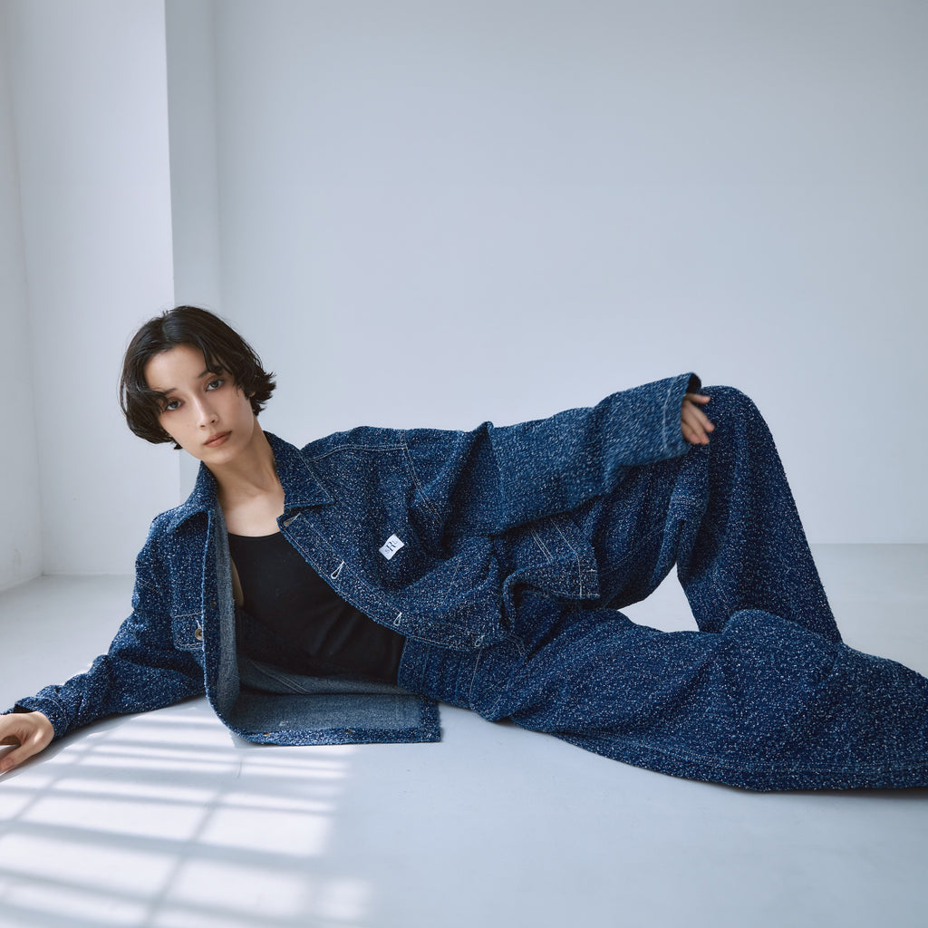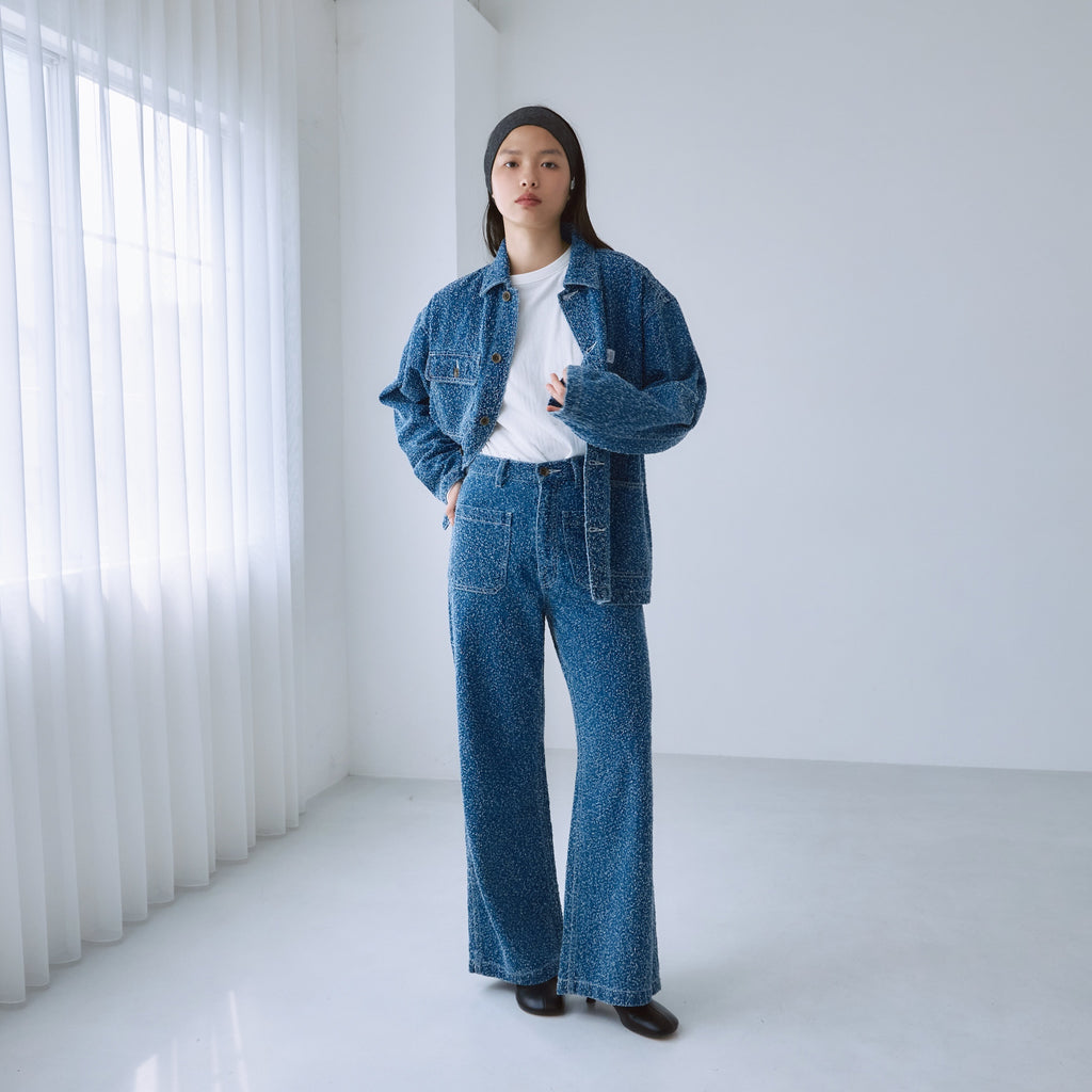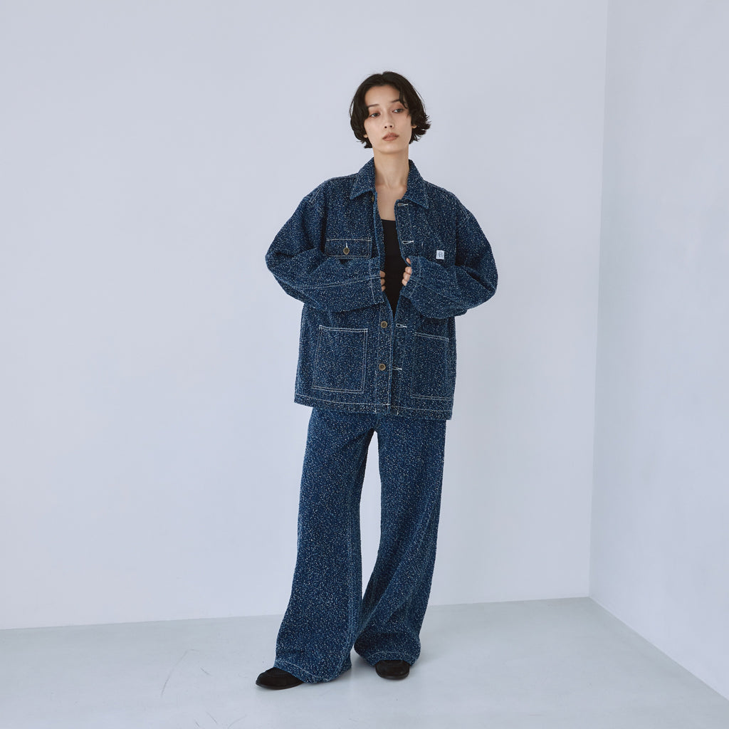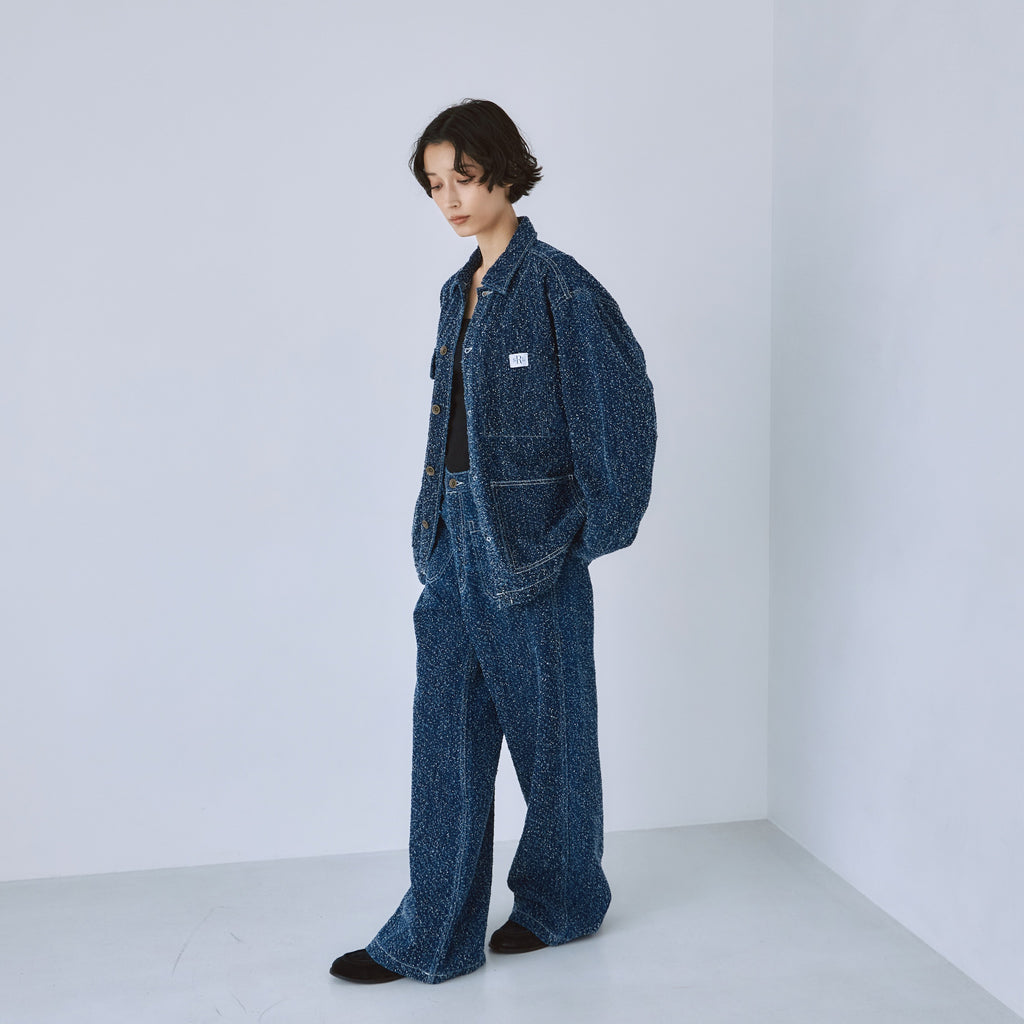 同素材の〈Needle punch materialカバーオール〉とのセットアップが一押し。ジャケットやTシャツ、スウェットとのコンビネーションでも決まります。いつものデニムと同じ感覚でご着用ください。