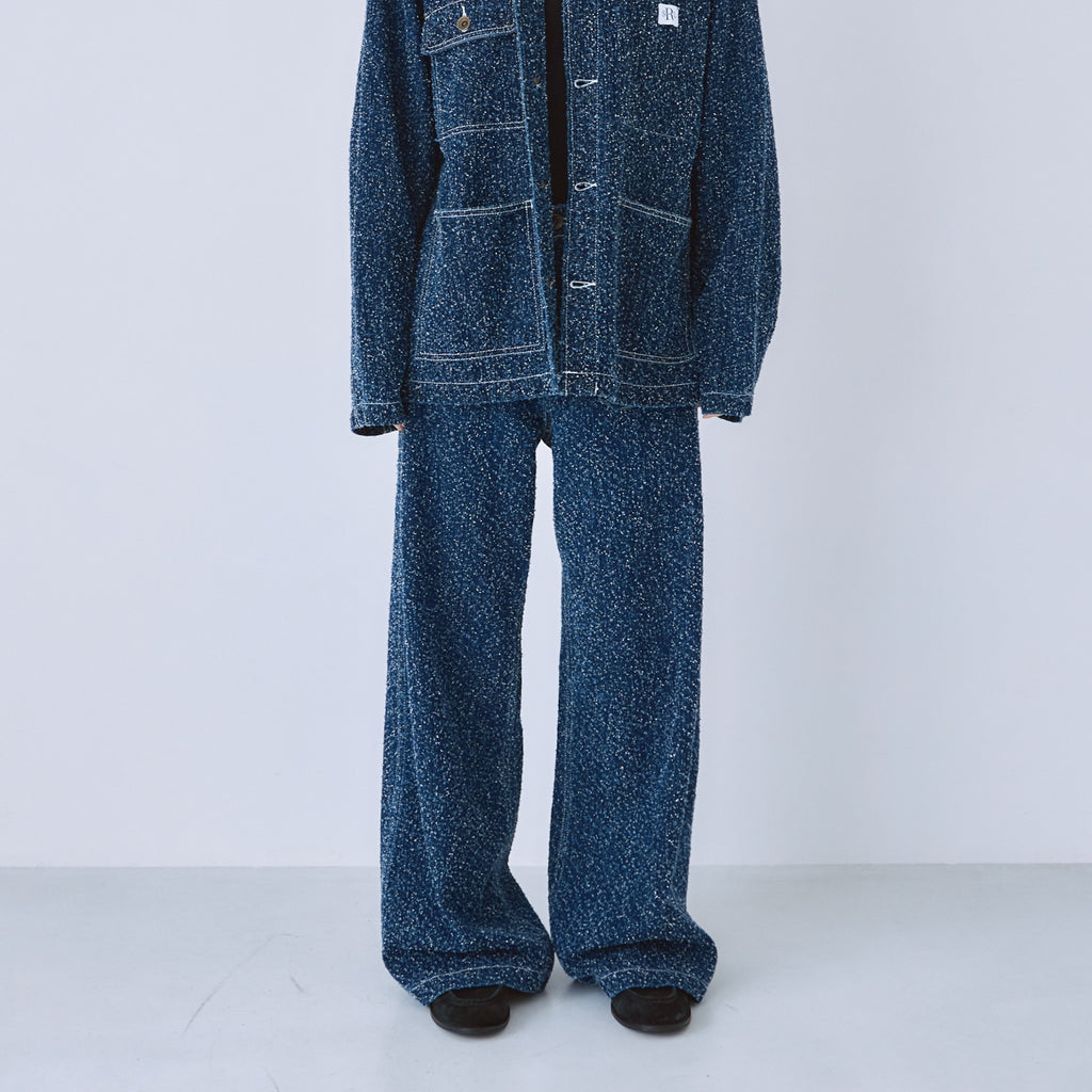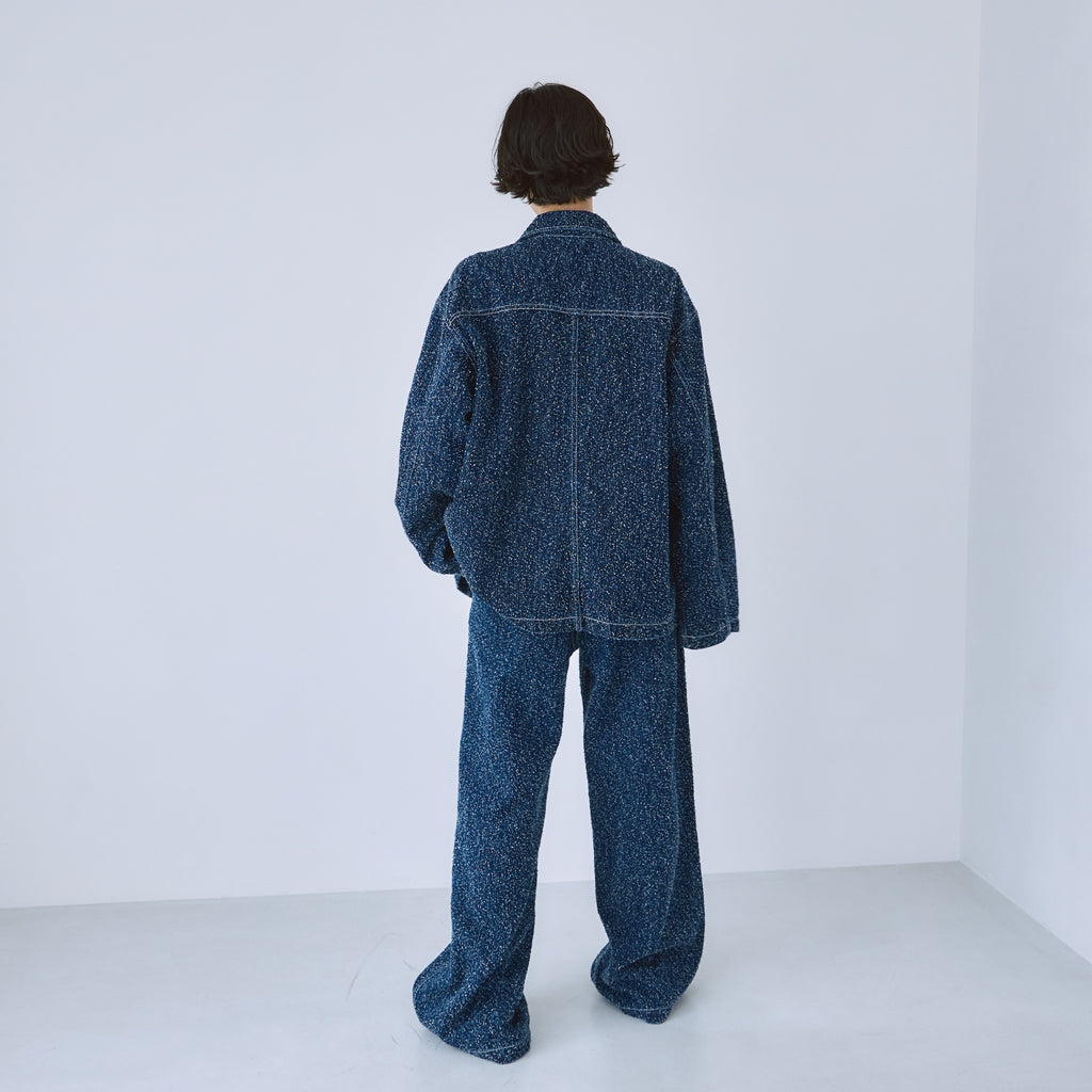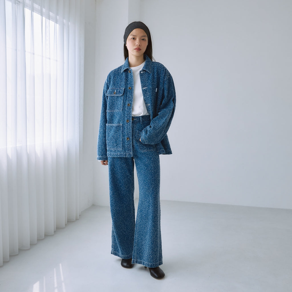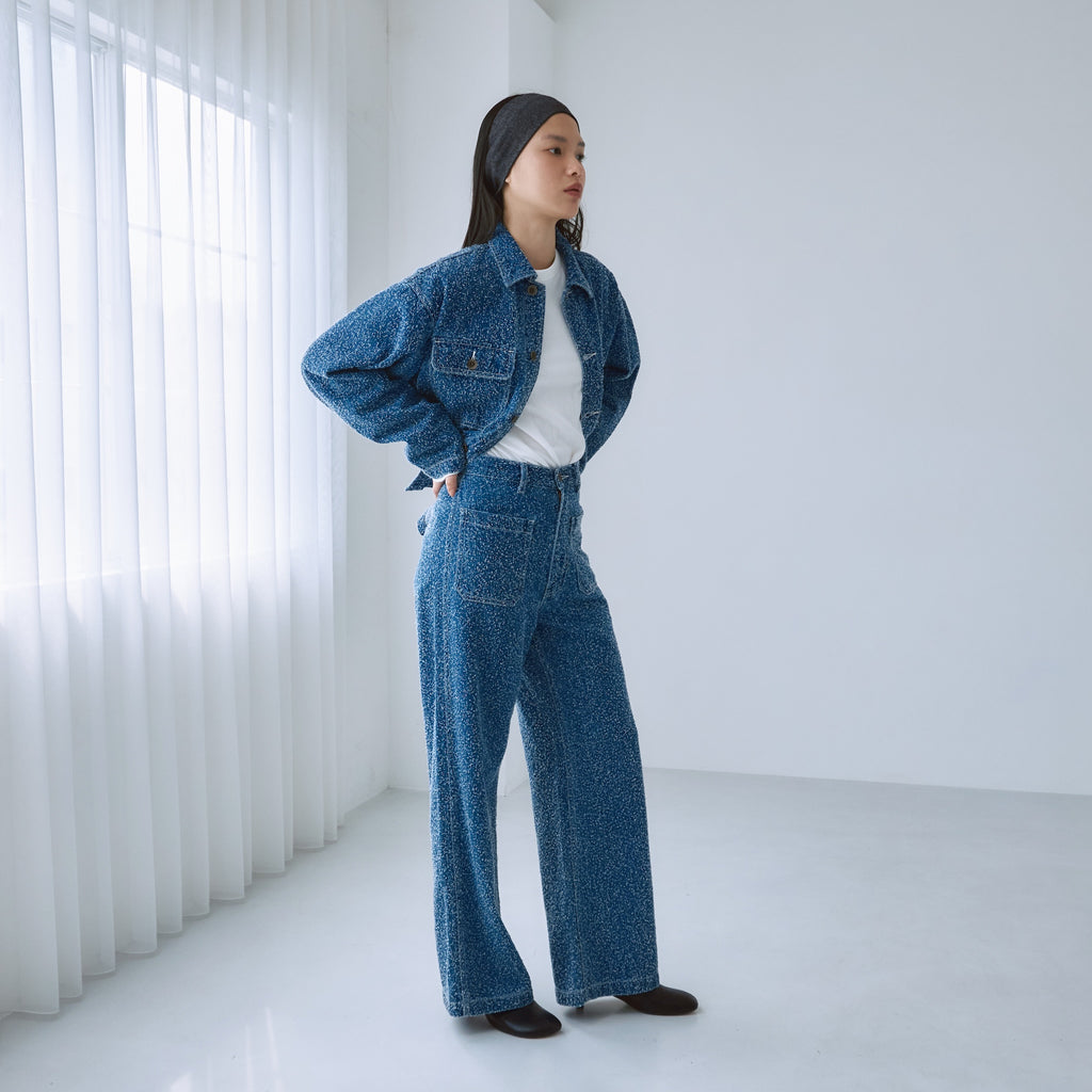 同素材の〈Needle punch materialカバーオール〉とのセットアップが一押し。ジャケットやTシャツ、スウェットとのコンビネーションでも決まります。いつものデニムと同じ感覚でご着用ください。