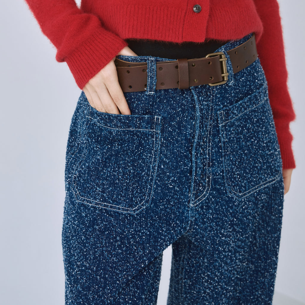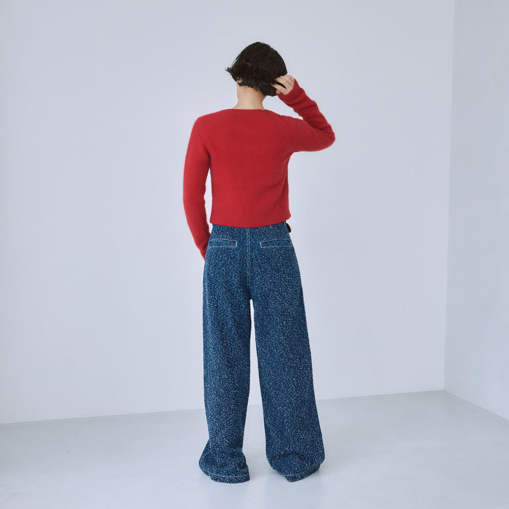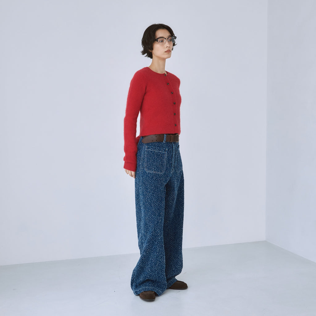 12.5oz(オンス)のデニム生地に“ニードルパンチ”加工を施しました。専用の針により繊維が引き出され、立体感や起毛感が出る手法。表面に動きが加わり、ヴィンテージ感やクラフト感が増すのが特徴です。ふんわりと柔らかな手触りもポイントに。