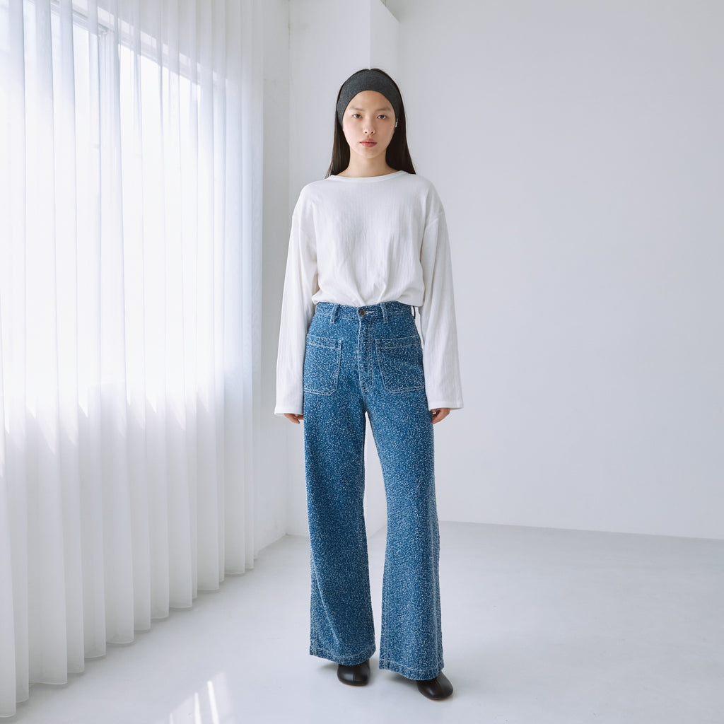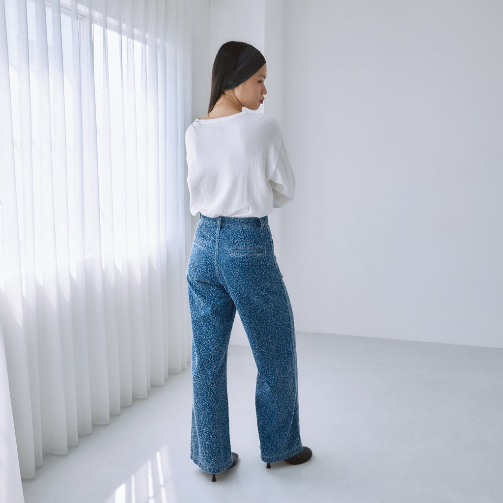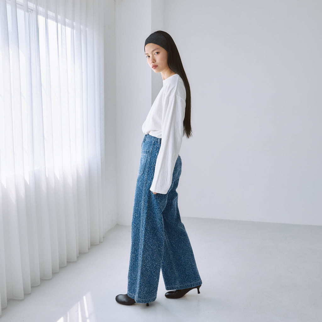 表情豊かで丈夫なニードルパンチデニムを採用した、新作のバギーパンツ。生地を活かしたシンプルなデザインに、90年代ベルボトムからインスパイアされたゆとりのあるフレアシルエット。脚長効果も抜群な1本です。