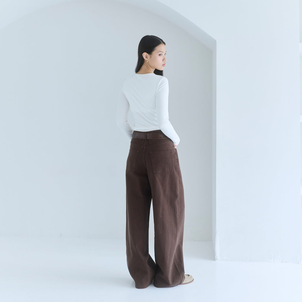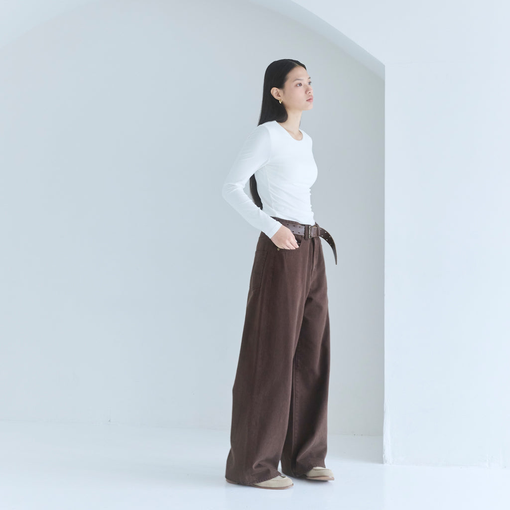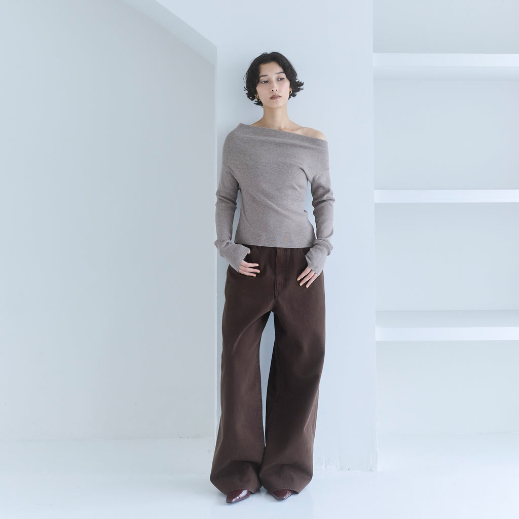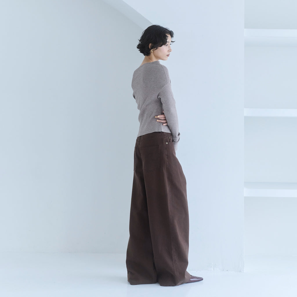 ワイドラインの美しさはそのままに、腰の位置が下がることで脚が自然に長く見えるだけでなく、ラフな感覚もプラスしています。