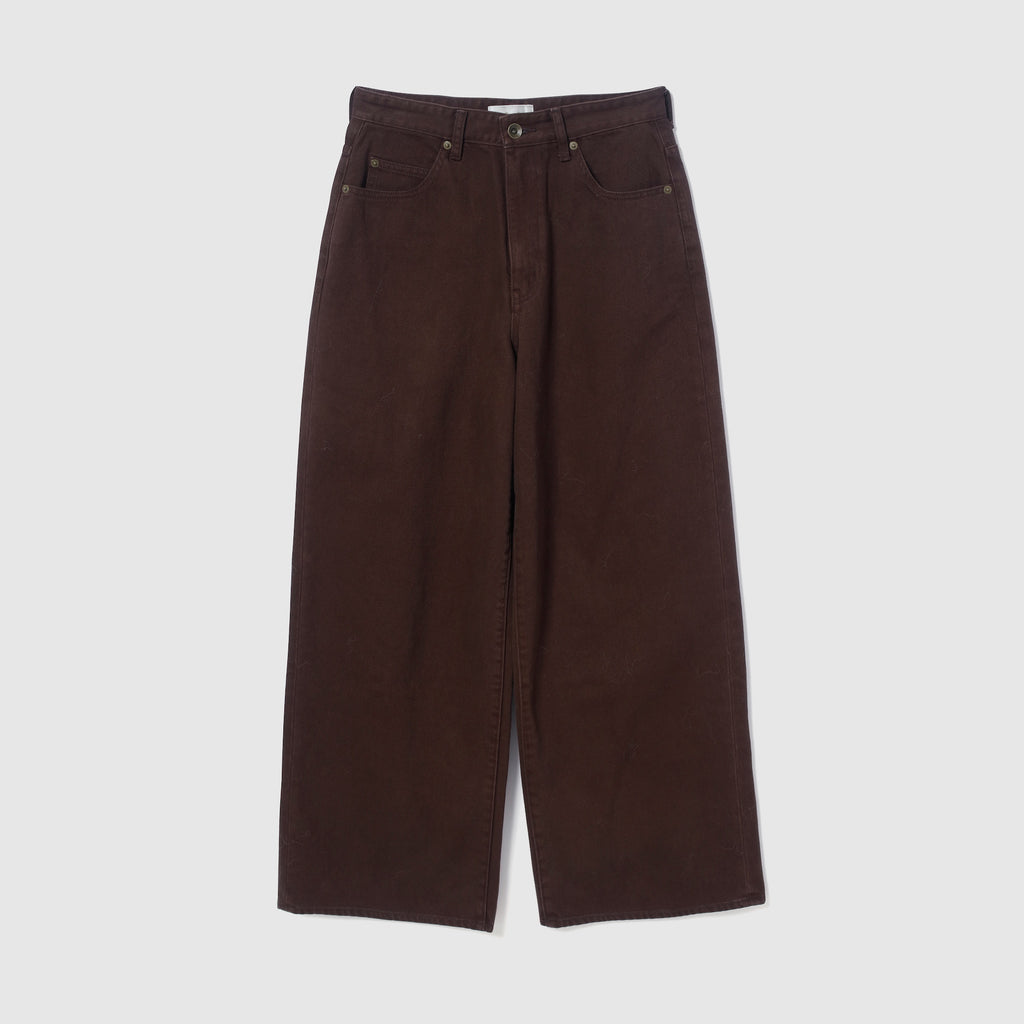 「ブラウン」は12ozのホワイトデニムをベースに染めを施し、ウォッシュ加工で自然なアタリを出した、独特のニュアンスカラーに。色落ちはほとんどなく、着るほどに味が出ていくのもポイントです。デニム特有のハリと柔らかさを併せ持った素材感が、ヴィンテージライクなムードを引き立てます。