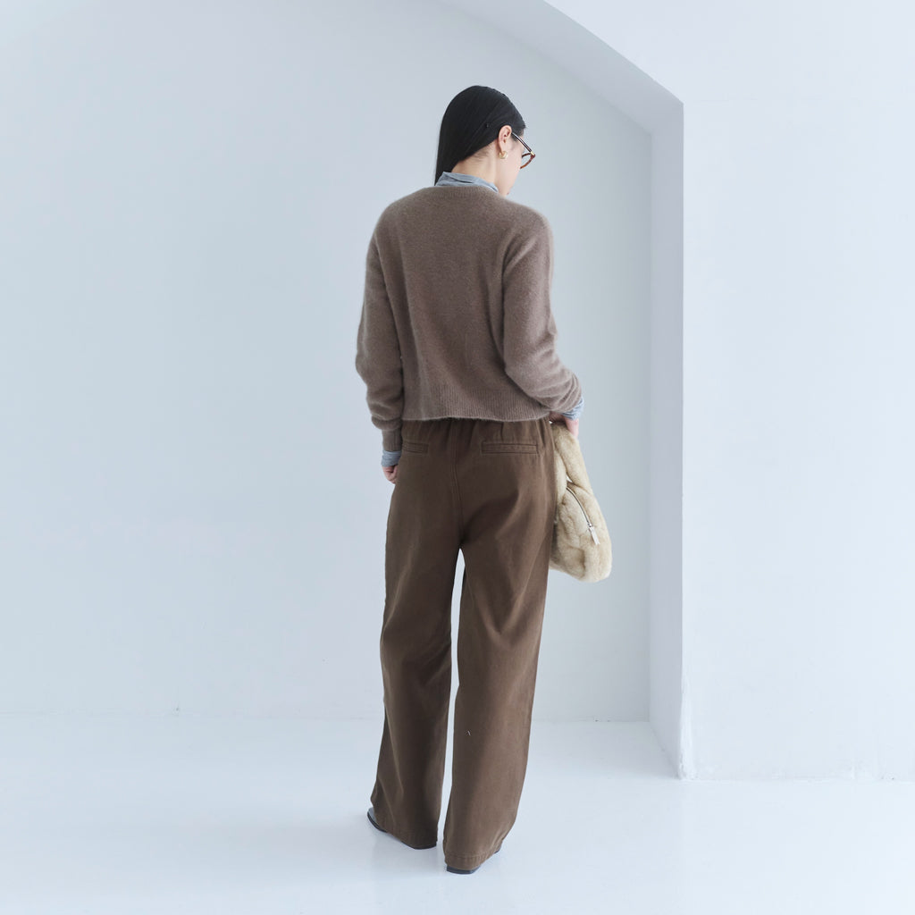 大好評の〈ウエストギャザーCANVASタックパンツ〉をベースに、よりスッキリと履けるストレートラインへアップデート。タックを1本に減らし、ヒップからワタリのボリュームを抑えることで、縦長の美しいラインを強調。股下も+1.5cm長くして、バランス良く見せています。