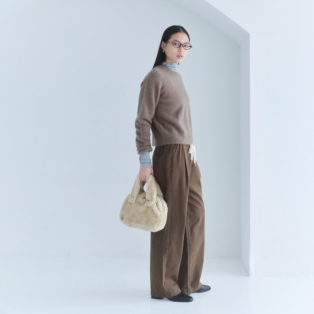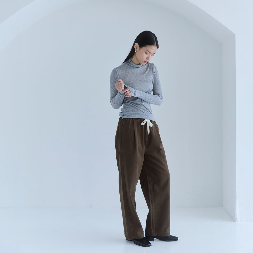 ウエストは1周ゴム仕様で、外側のコットン紐によりサイズ調整も可能。しっかりとギャザーを寄せながらタックを入れることで、カジュアルさの中に立体的なボリュームと上品さをプラス。キレイ見えもしながら、リラックスした着用感が嬉しいポイントに。