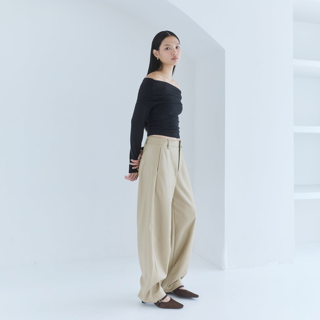 柔らかな風合いのニットやショート丈トップスとの相性抜群。ボリュームのあるパンツのシルエットを活かして、コンパクトなトップスを合わせるとスタイルアップが叶います。
