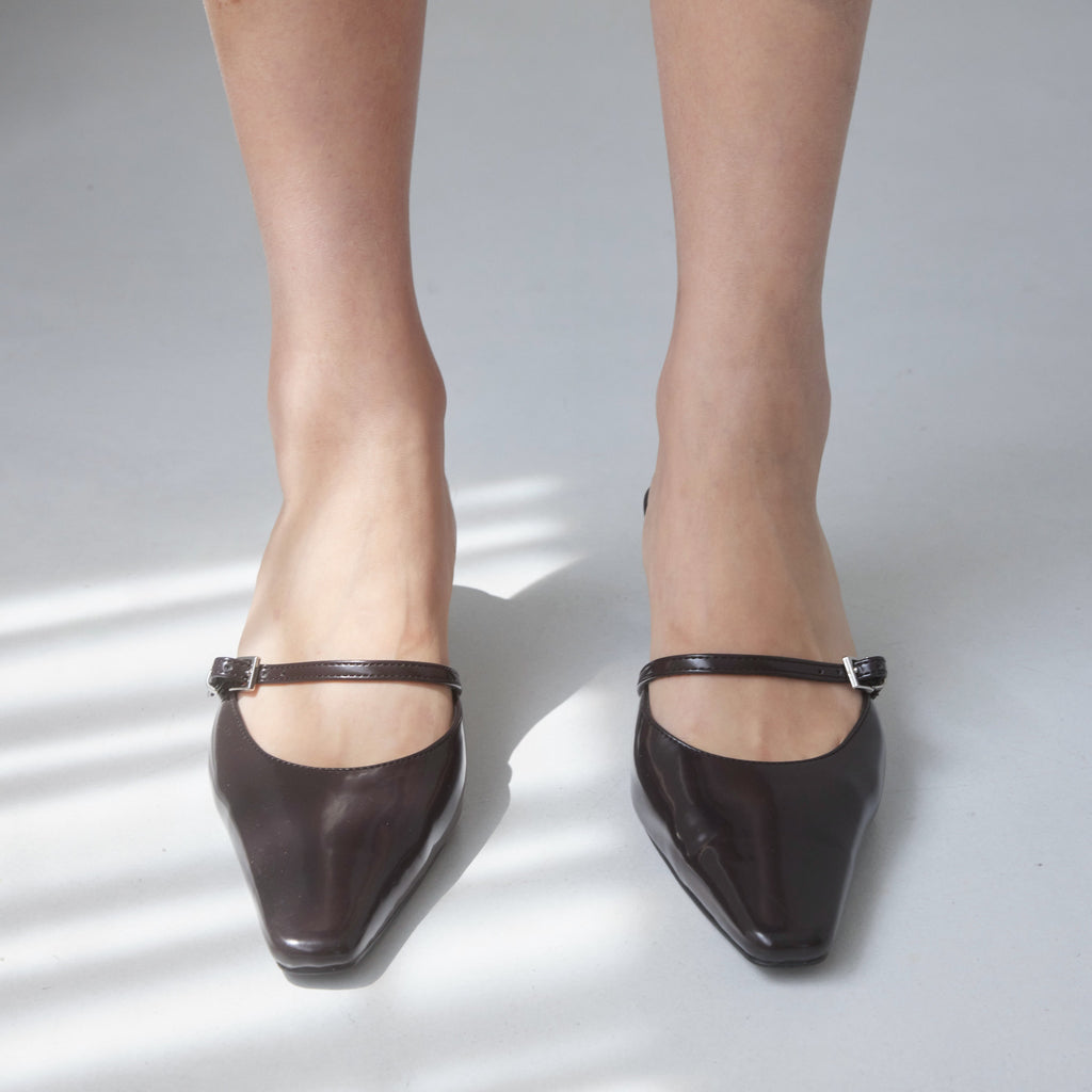 やや長めのスクエアトゥでシャープな印象。細長いフォルムが足元をスッキリとスタイリッシュに見せてくれるデザインです。