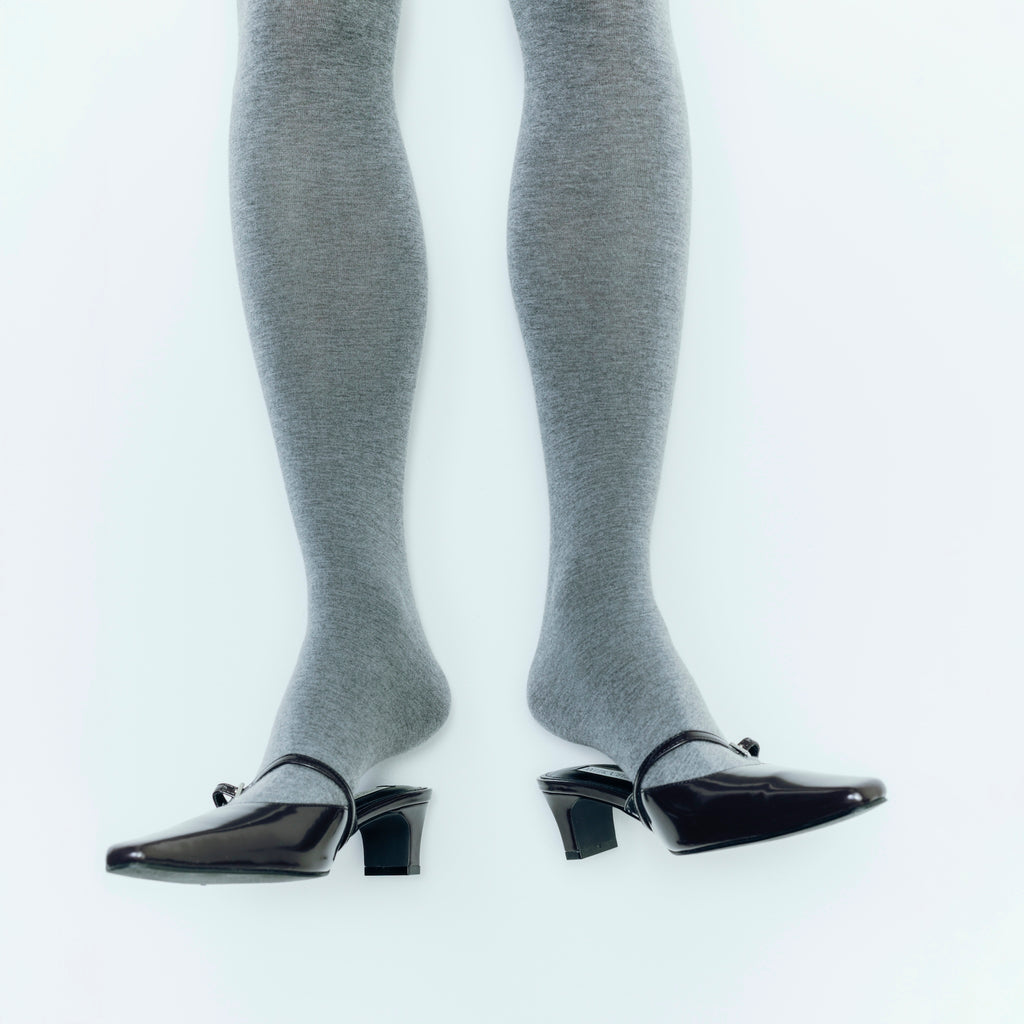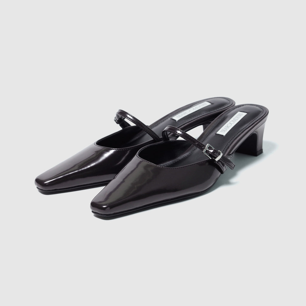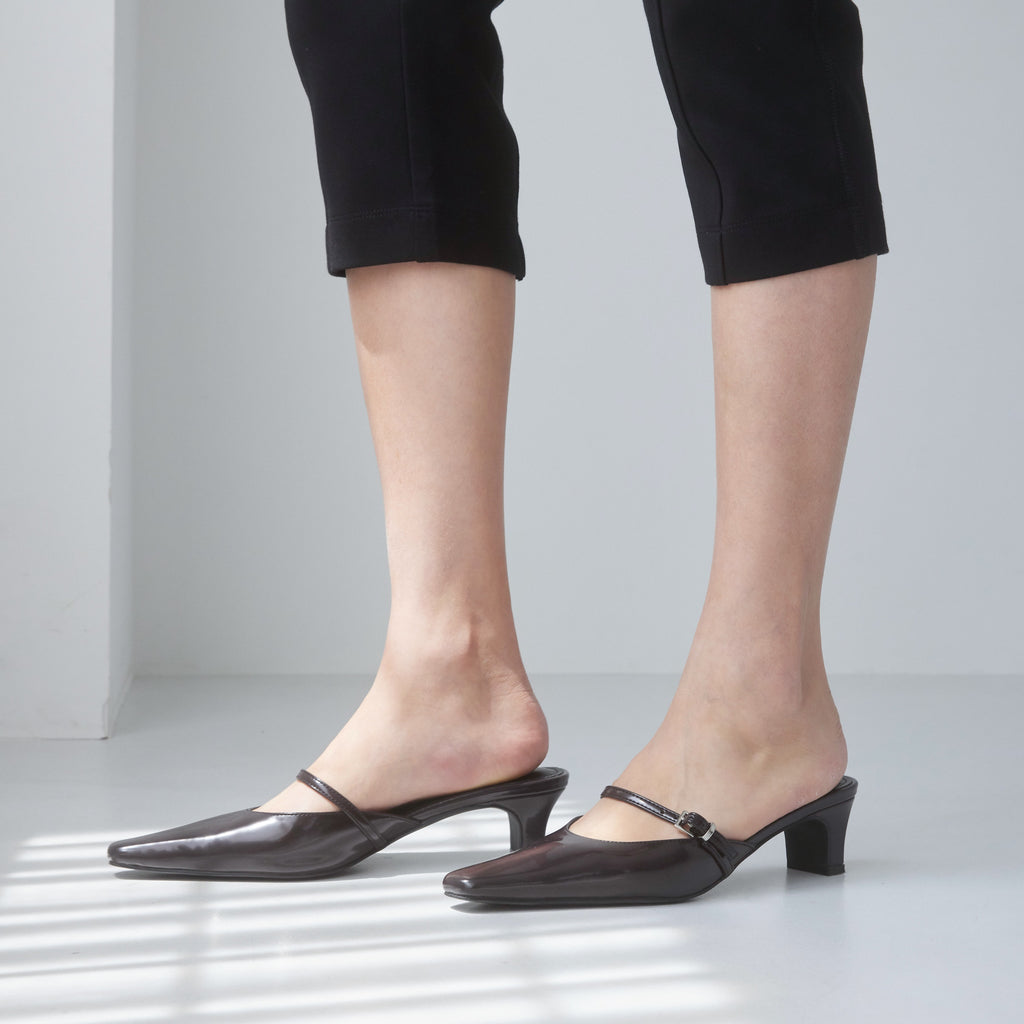 ラフに履けて上品さも叶えてくれるバックレスのミュールシューズ。上品な光沢感のあるエコレザーを使用することで、足元から季節感を演出しています。