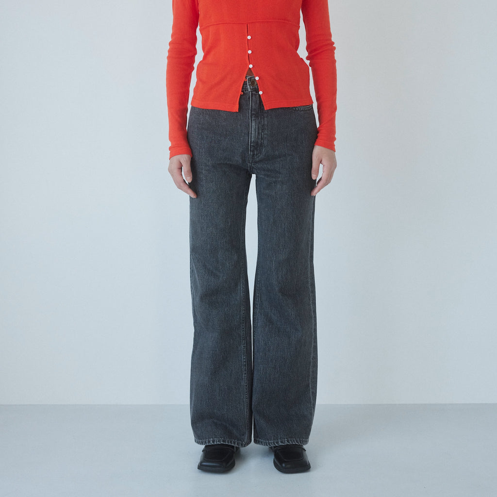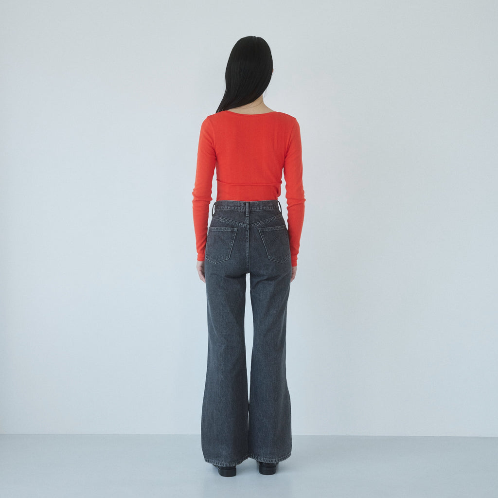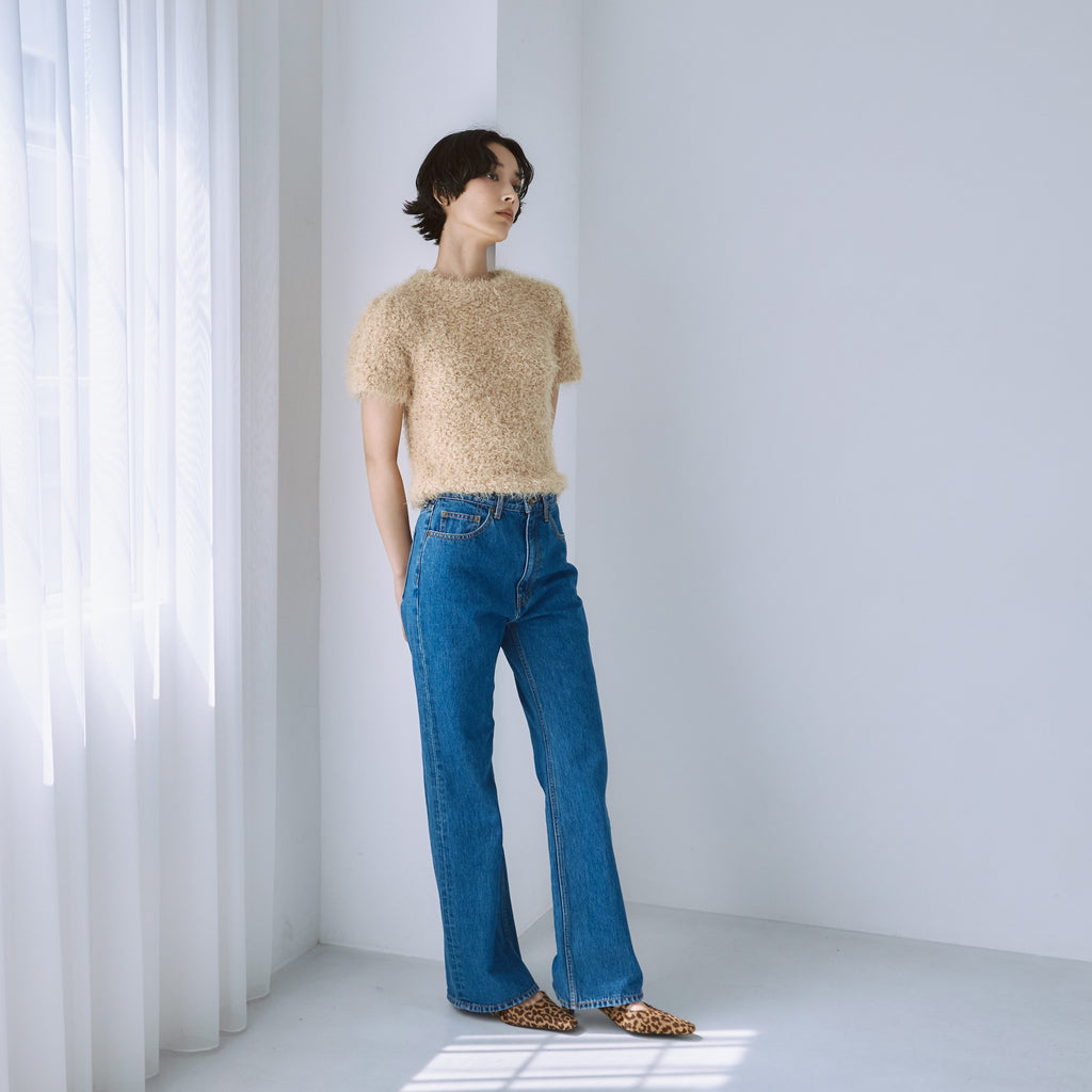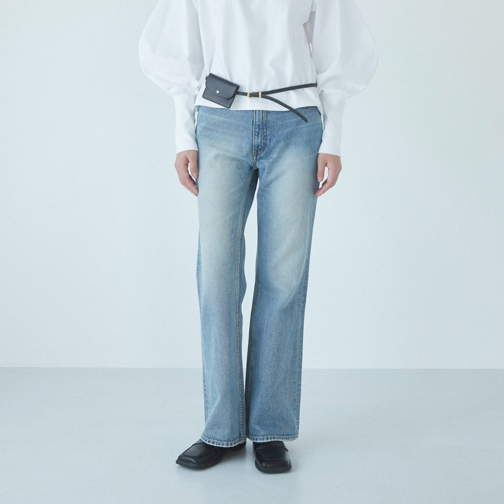 定番フレアデニムよりも股下をやや長めに設定することで、低めのヒールを履いても美脚に。