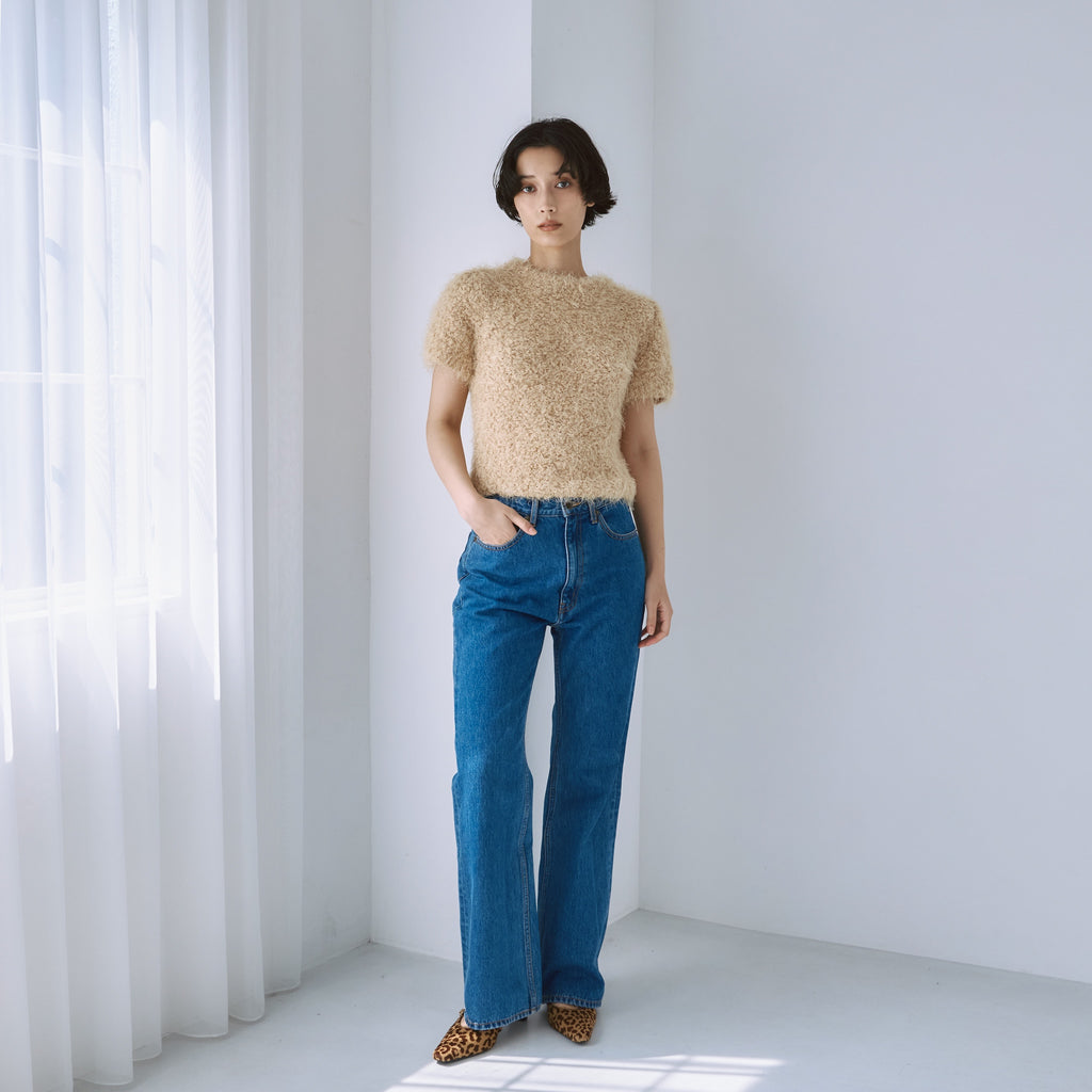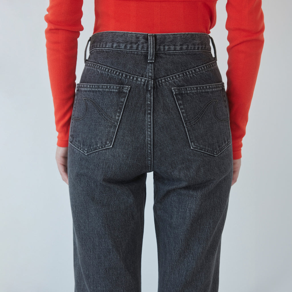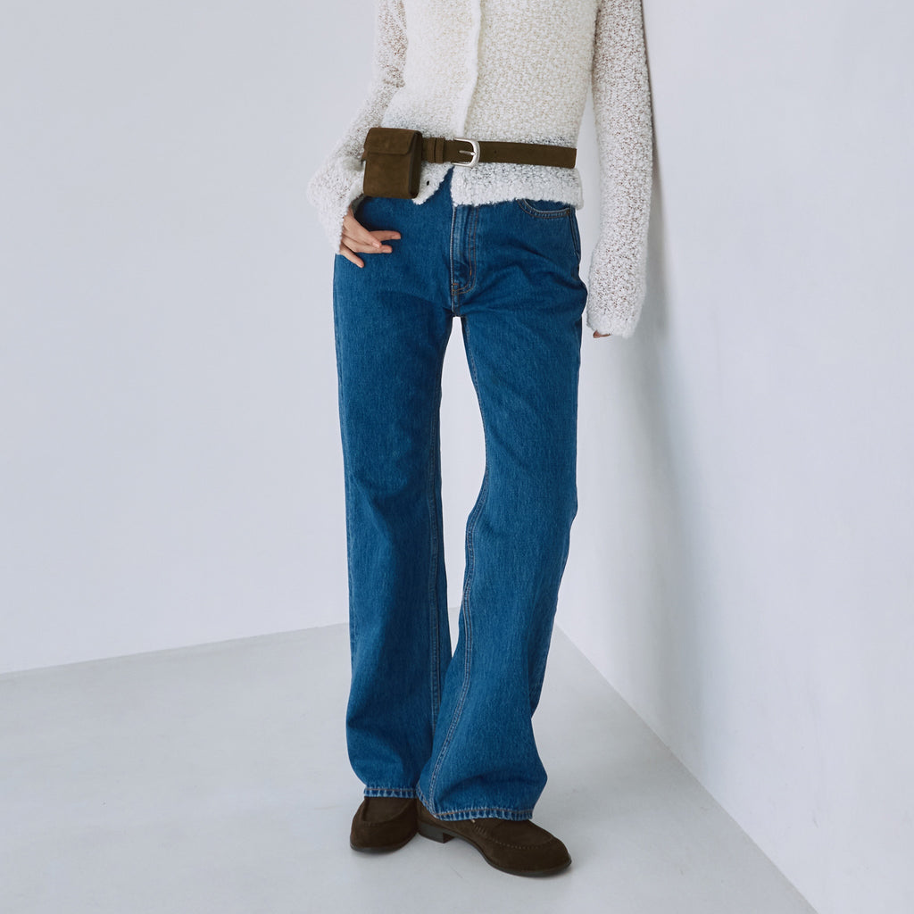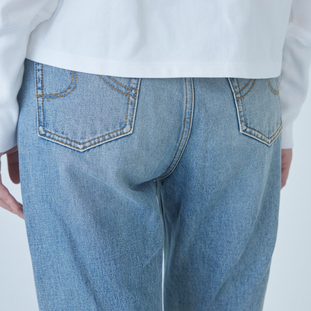 SRLのピタッとスリムなフレアデニムと定番のストレートラインを混ぜたような、程良いフィットバランス。