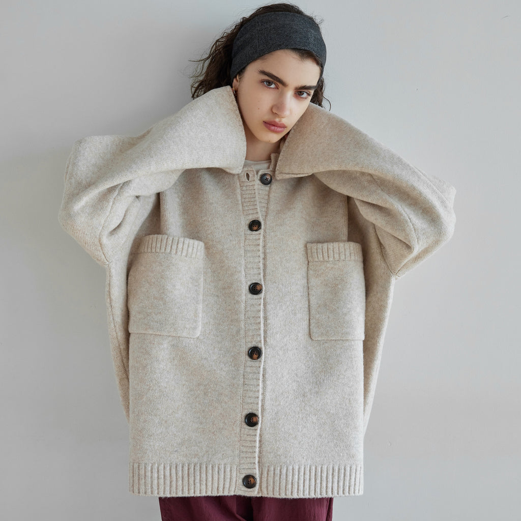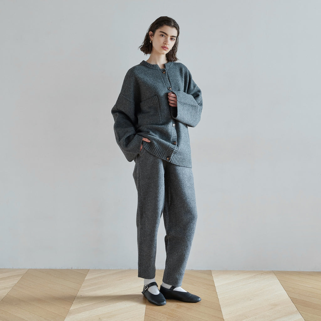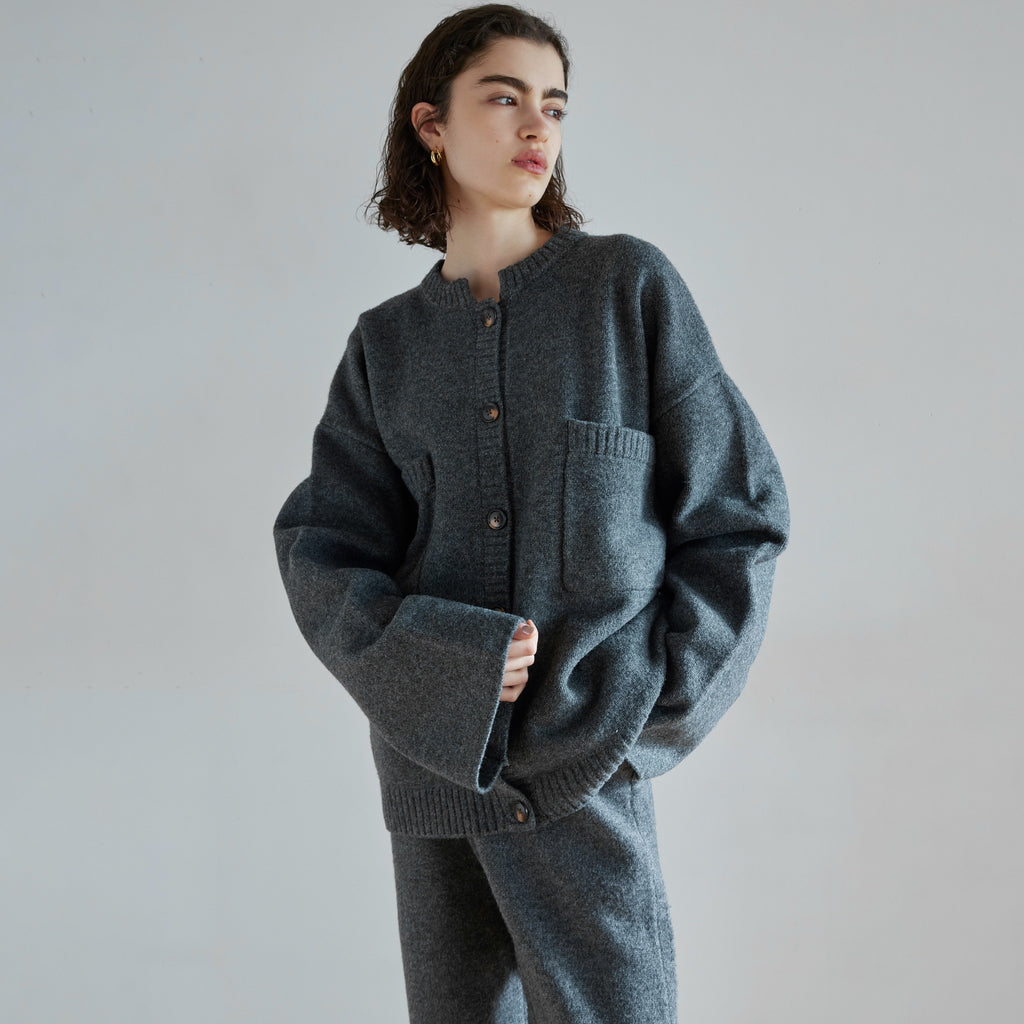 同素材の〈ウールmix Relaxソフトニットパンツ〉とのセットアップスタイルや、お手持ちのボトムに合わせてお使いください。インナーにハイネックを合わせればさらに防寒に。