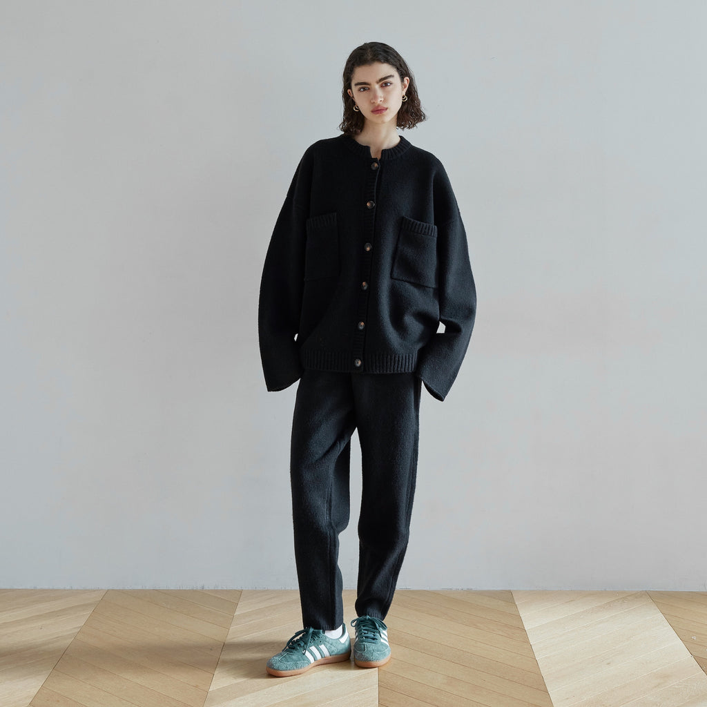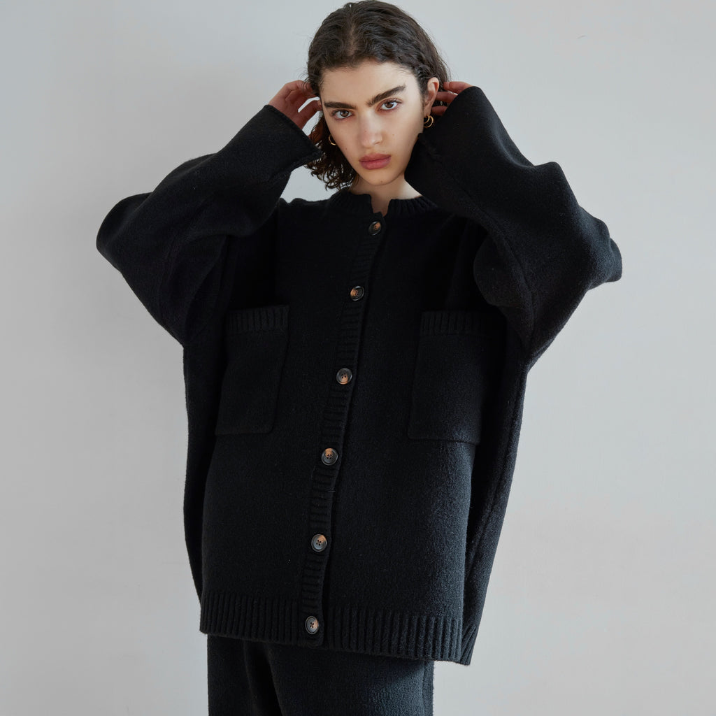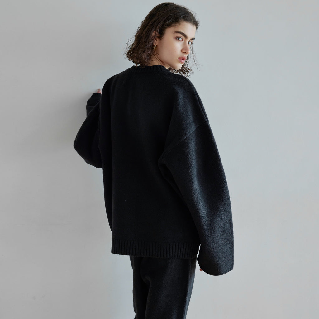 同素材の〈ウールmix Relaxソフトニットパンツ〉とのセットアップスタイルや、お手持ちのボトムに合わせてお使いください。インナーにハイネックを合わせればさらに防寒に。