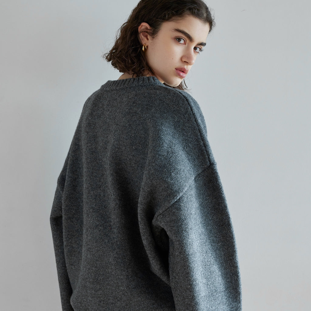 首元は隙間を開けて抜けを作ったクルーネック。各所のリブ編み立てでデザイン性をON。