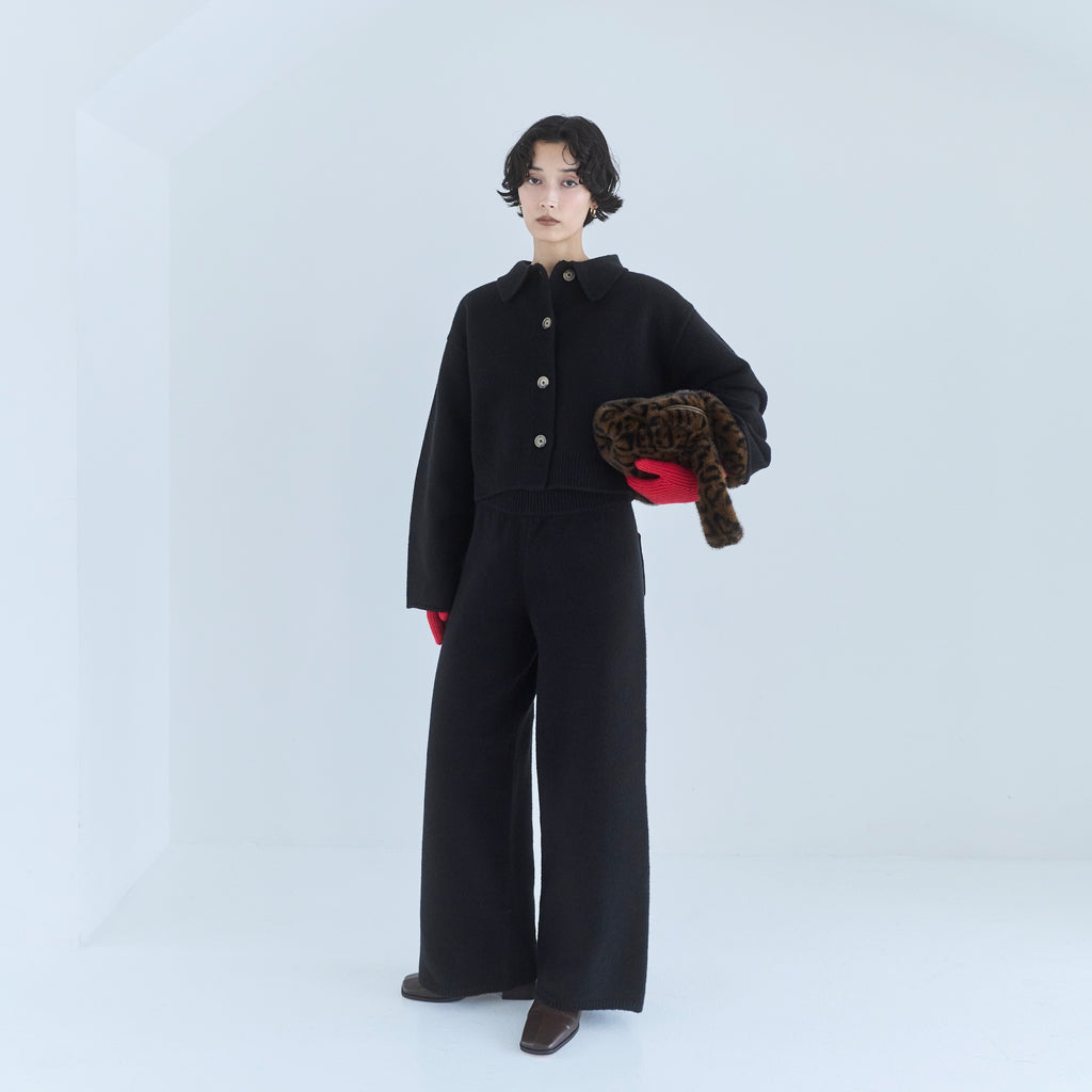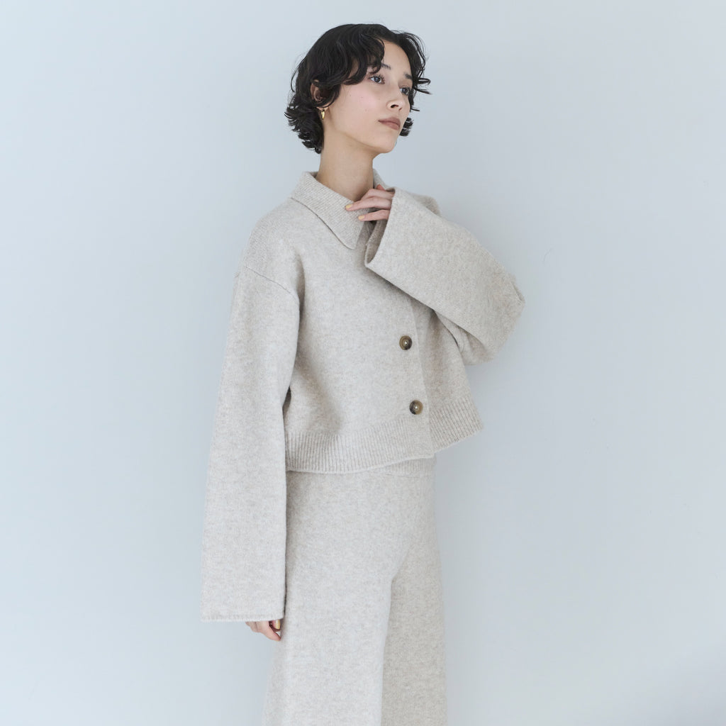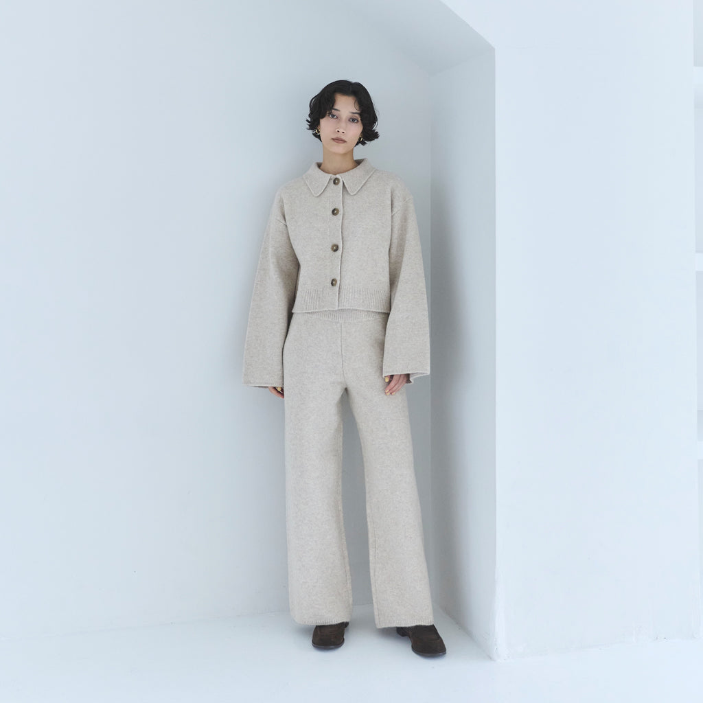 同素材の 〈ウールmix ルーズストレートニットパンツ〉と合わせたセットアップスタイルがおすすめ。コンパクト丈なので小柄な方でも合わせやすく、ハイウエストボトムとも相性◎。足元はフラットでもブーツでもバランス良くまとまり、デイリーからワンマイルまで幅広いシーンで着用可能です。
