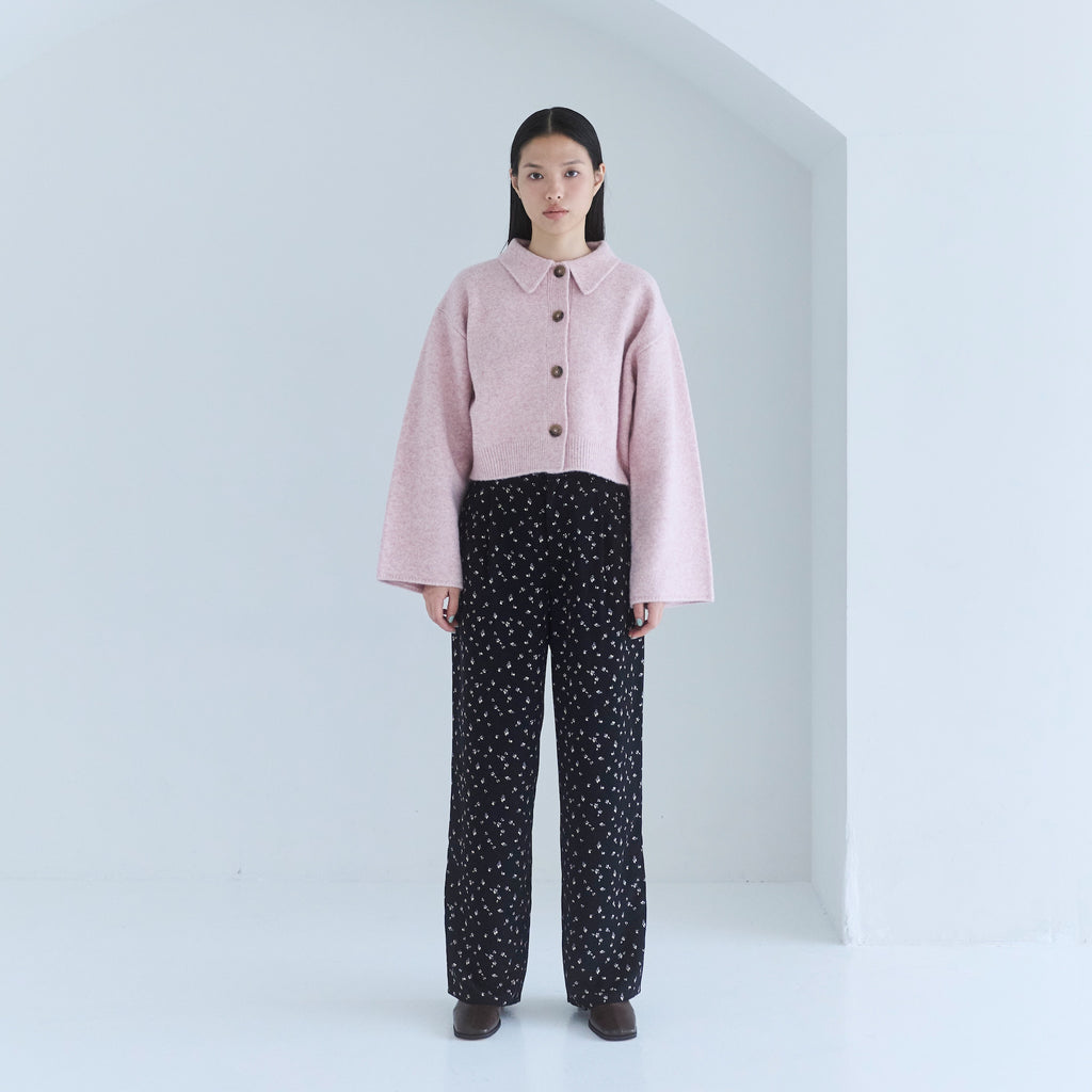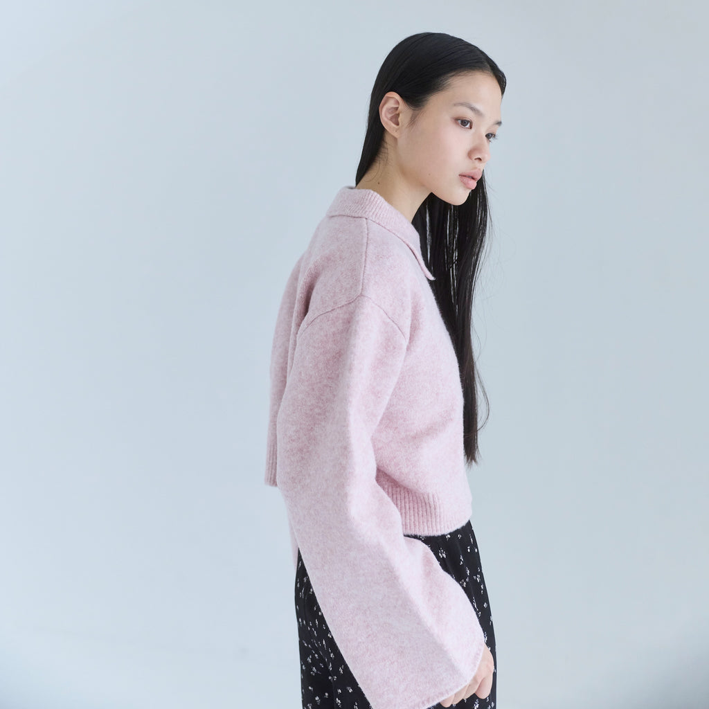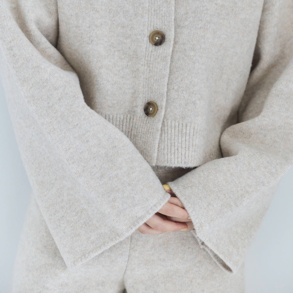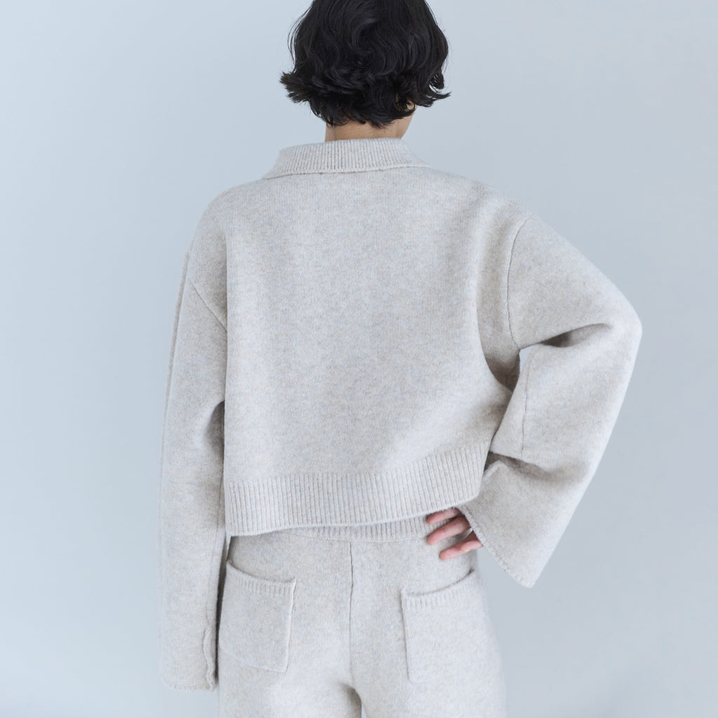 同素材の 〈ウールmix ルーズストレートニットパンツ〉と合わせたセットアップスタイルがおすすめ。コンパクト丈なので小柄な方でも合わせやすく、ハイウエストボトムとも相性◎。足元はフラットでもブーツでもバランス良くまとまり、デイリーからワンマイルまで幅広いシーンで着用可能です。