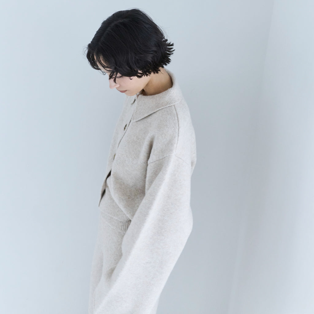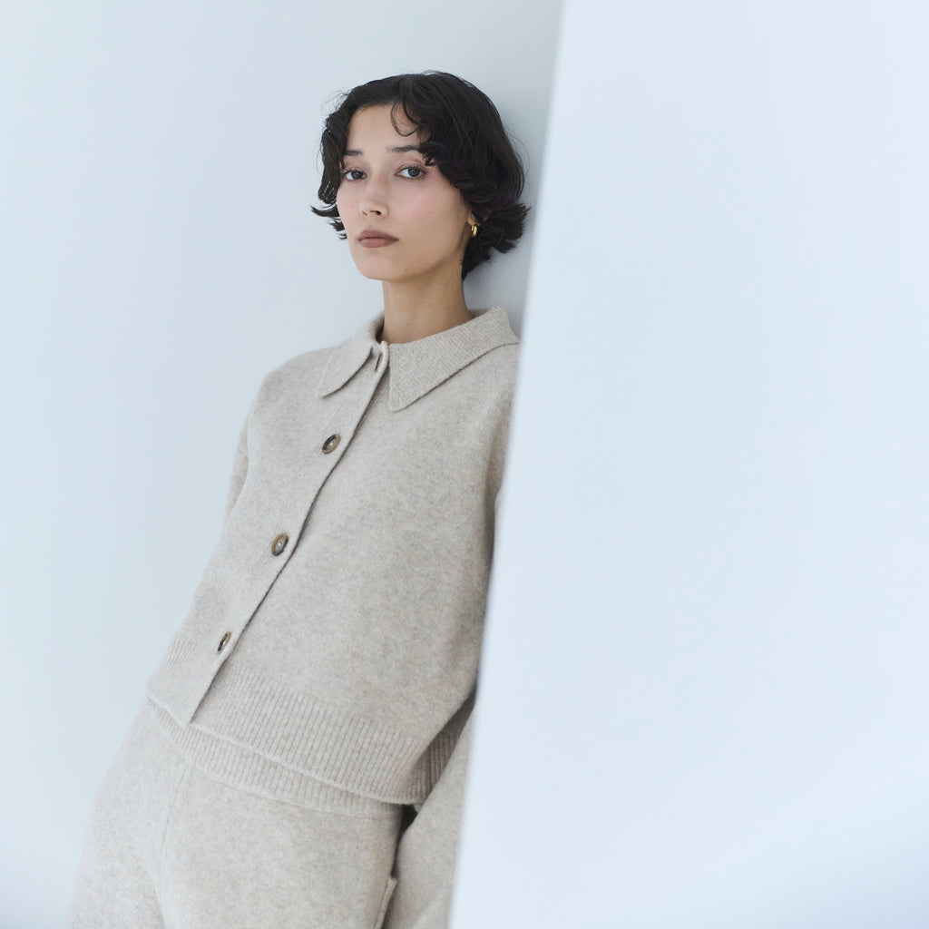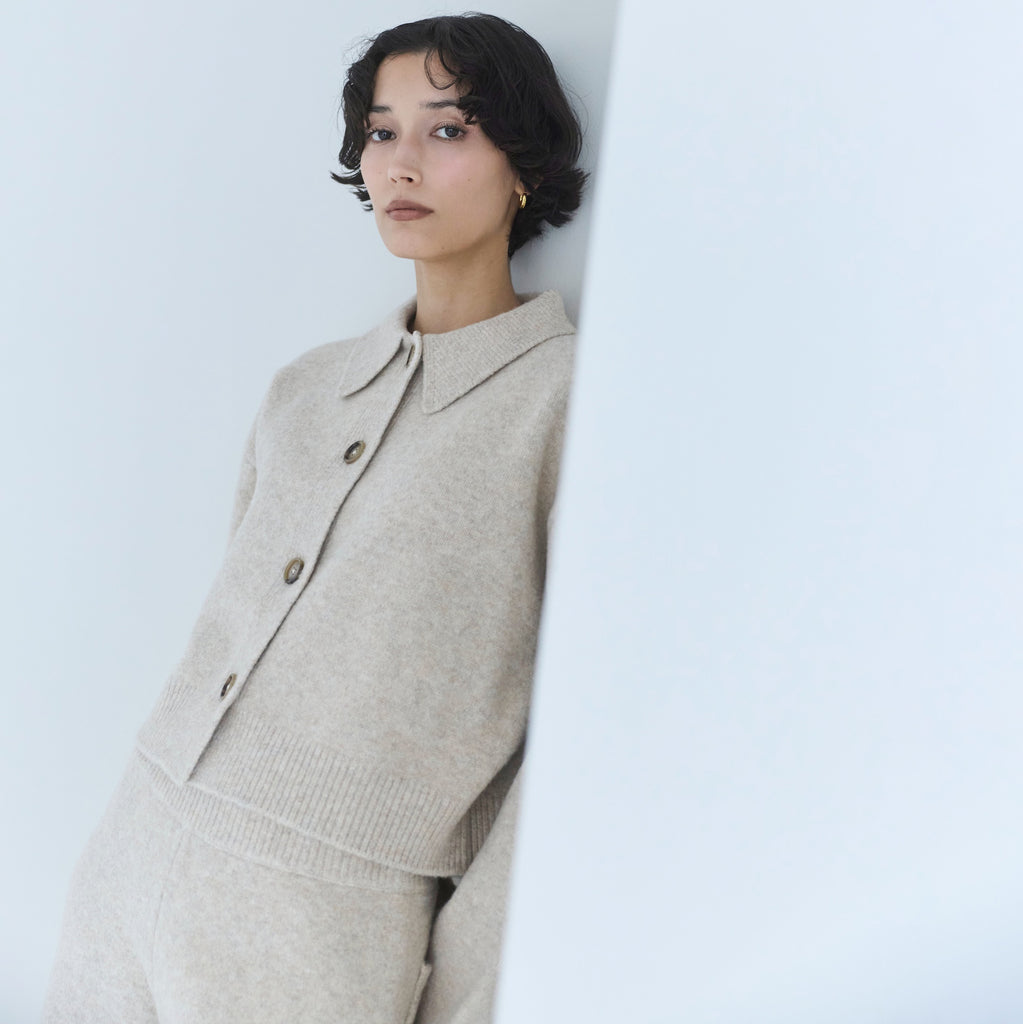 毎年大人気の暖かな〈ウールmix〉シリーズから新型が登場。コンパクトなボックスシルエットに、シャツ襟を組み合わせたデザインで、セットアップから1枚使いまで幅広くお使いいただけます。