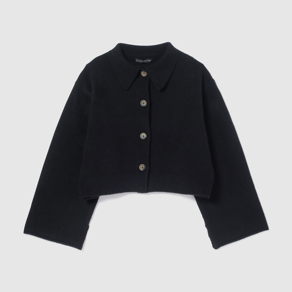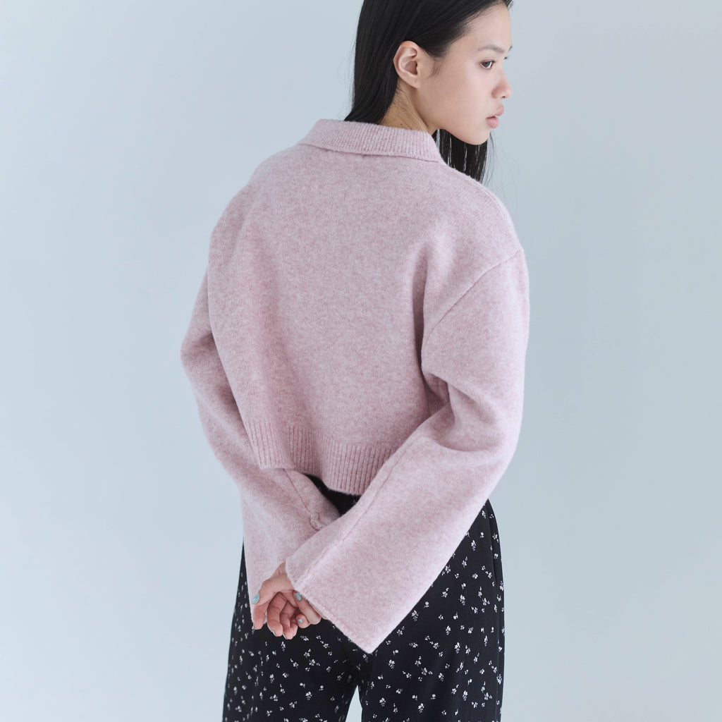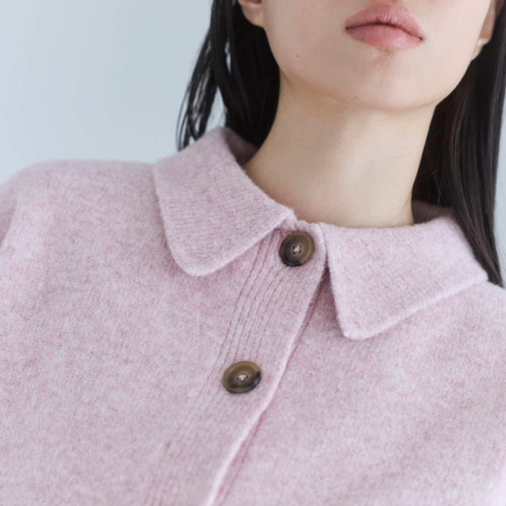 シャツのように着られる襟付きデザインと、折り返しても可愛い袖口のアレンジが魅力。フロントには大ぶりのマットマーブルボタンを採用し、シンプルな中に上品なアクセントをプラス。背面の編み立てロゴネームがさりげないポイントとなり、縦ラインを強調する視覚効果でスタイルアップも叶えてくれます。