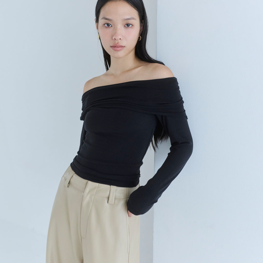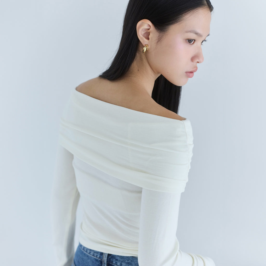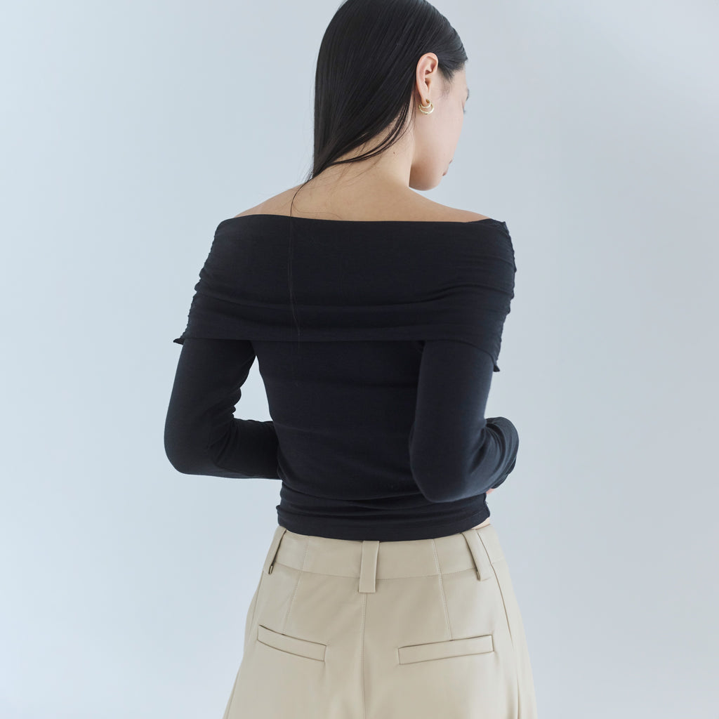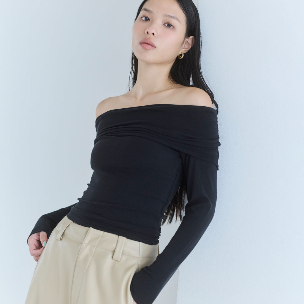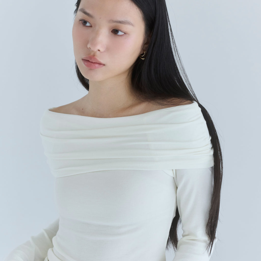 鎖骨から肩にかけての直線ラインが女性らしさを引き立てます。オフショル部分は2枚仕立てにし、軽くギャザーを寄せることで、気になる腕周りをカバーしつつ華奢見え効果もプラス。