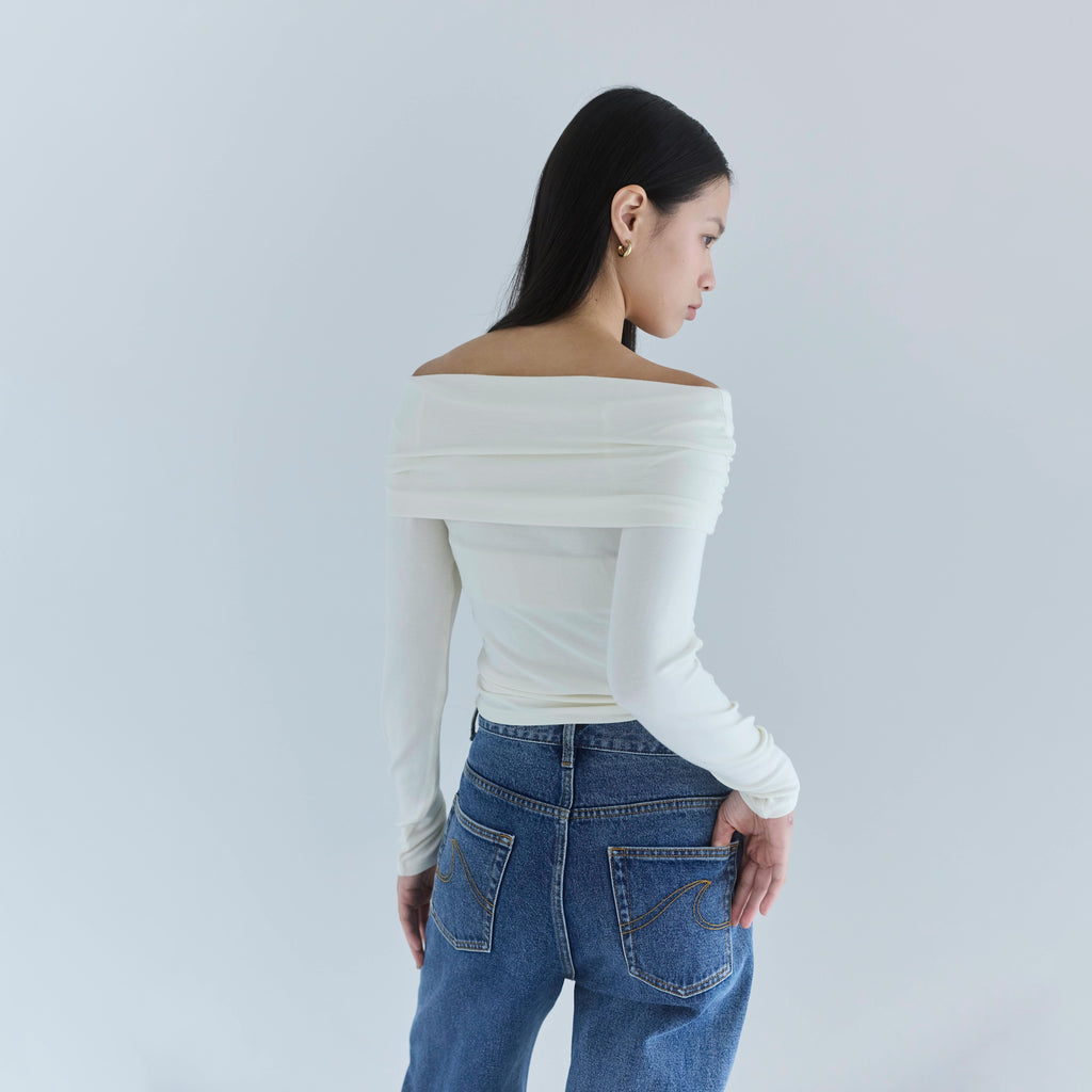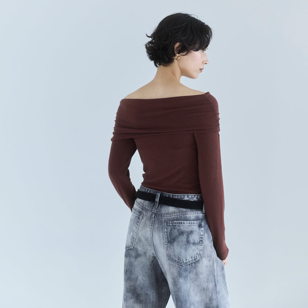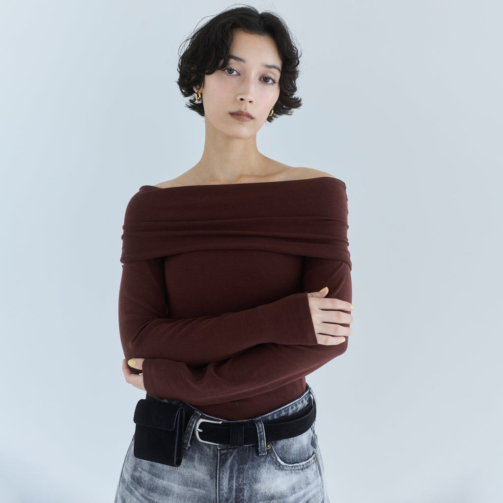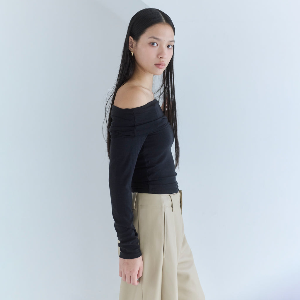 鎖骨から肩にかけての直線ラインが女性らしさを引き立てます。オフショル部分は2枚仕立てにし、軽くギャザーを寄せることで、気になる腕周りをカバーしつつ華奢見え効果もプラス。