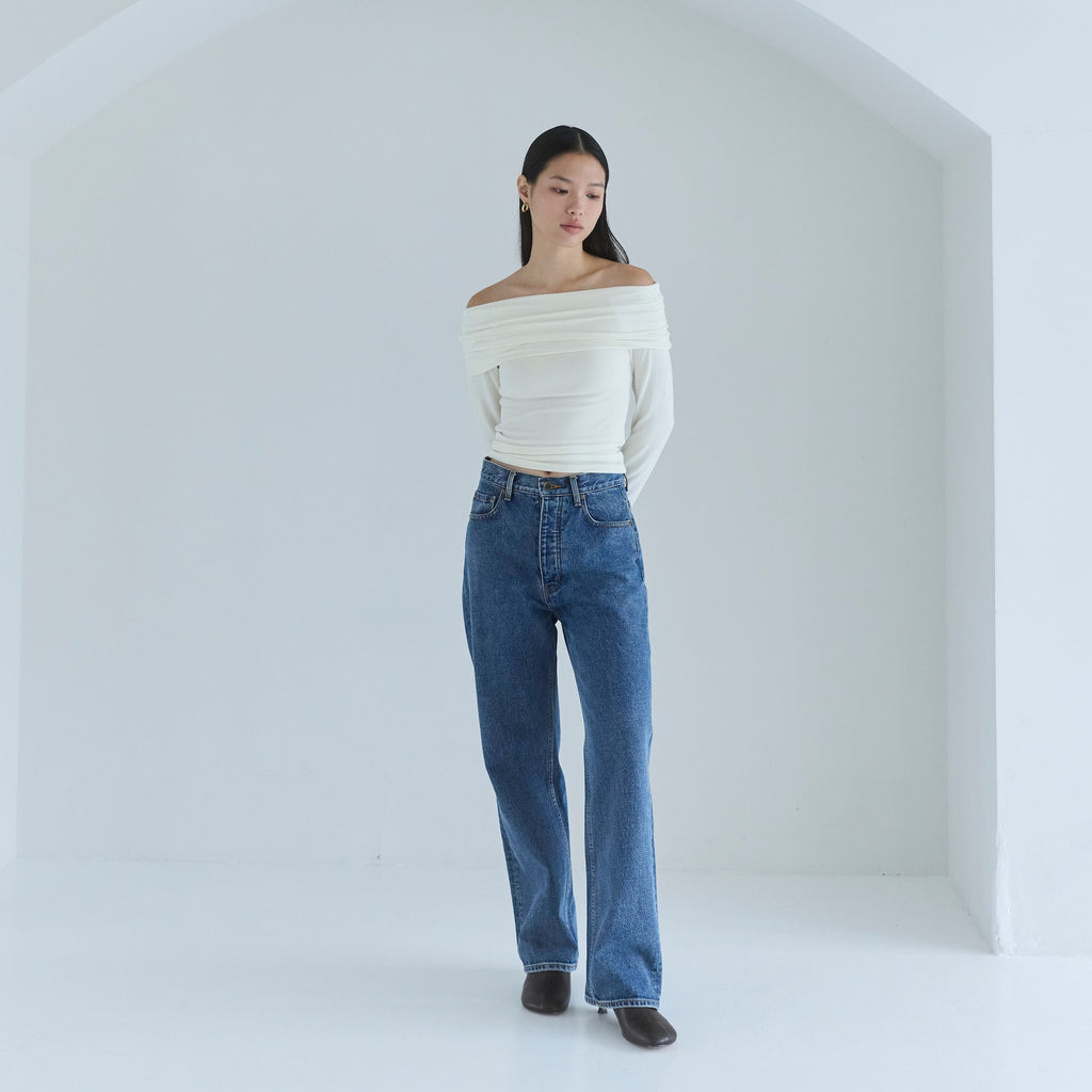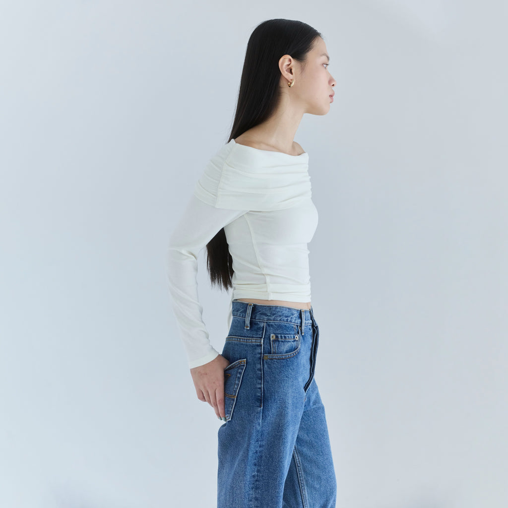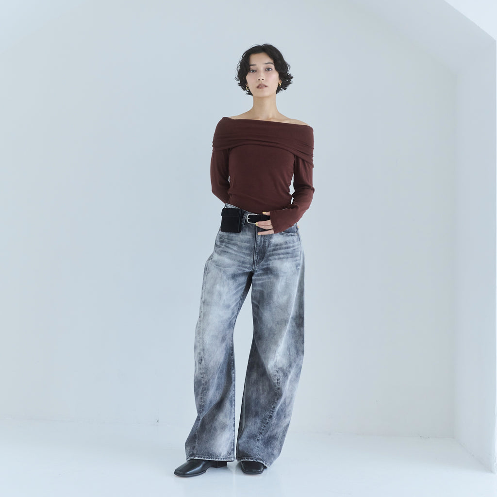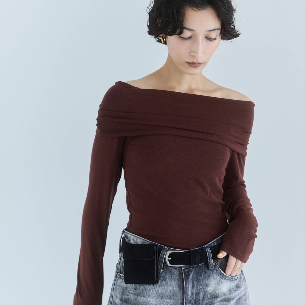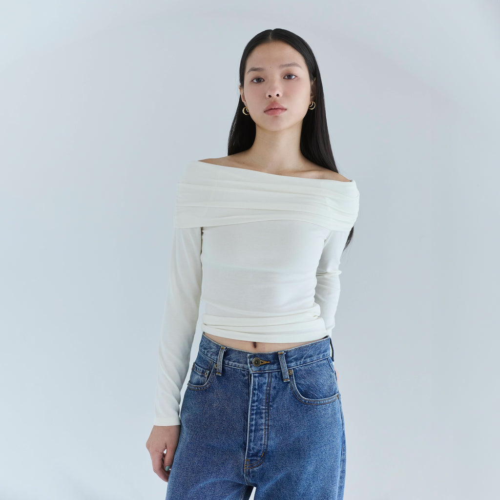 鎖骨から肩にかけての直線ラインが女性らしさを引き立てます。オフショル部分は2枚仕立てにし、軽くギャザーを寄せることで、気になる腕周りをカバーしつつ華奢見え効果もプラス。