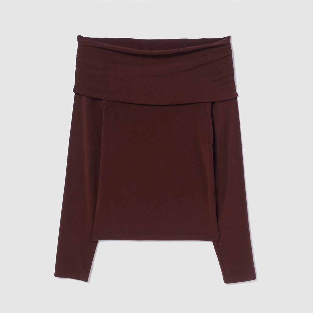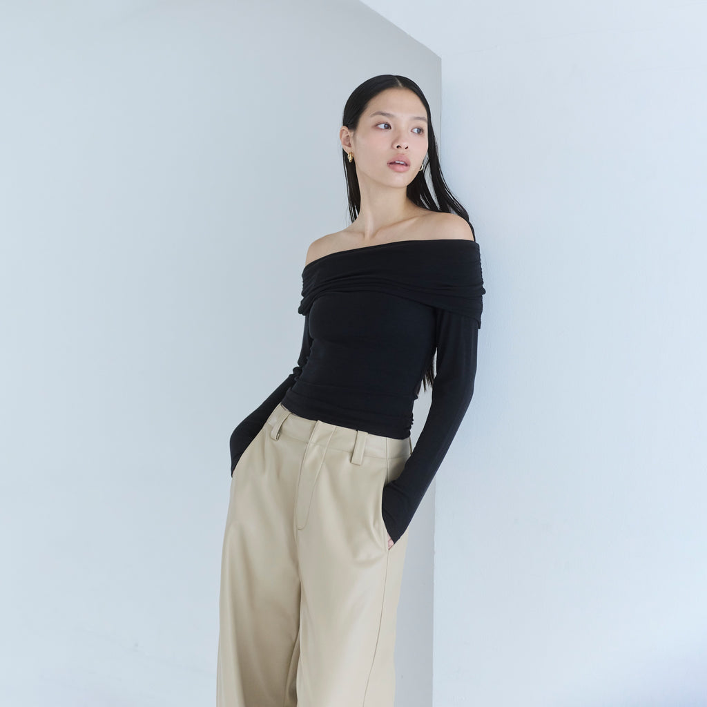 トレンドのオフショルダーを上品かつ日常に馴染むようデザインしたトップス。レーヨン混素材のなめらかな落ち感と、ボディラインを美しく見せるシルエットが魅力です。