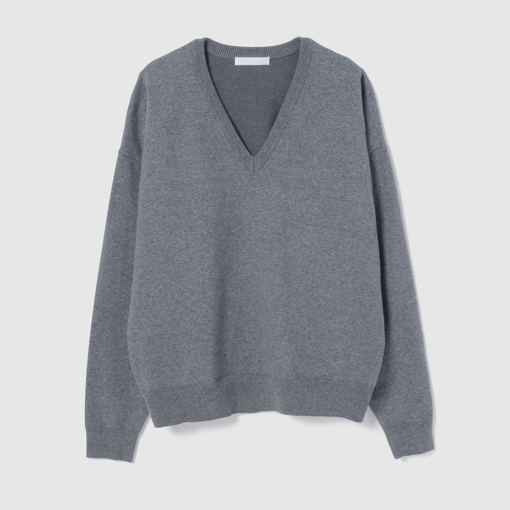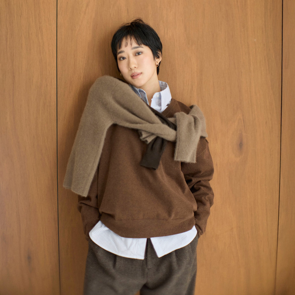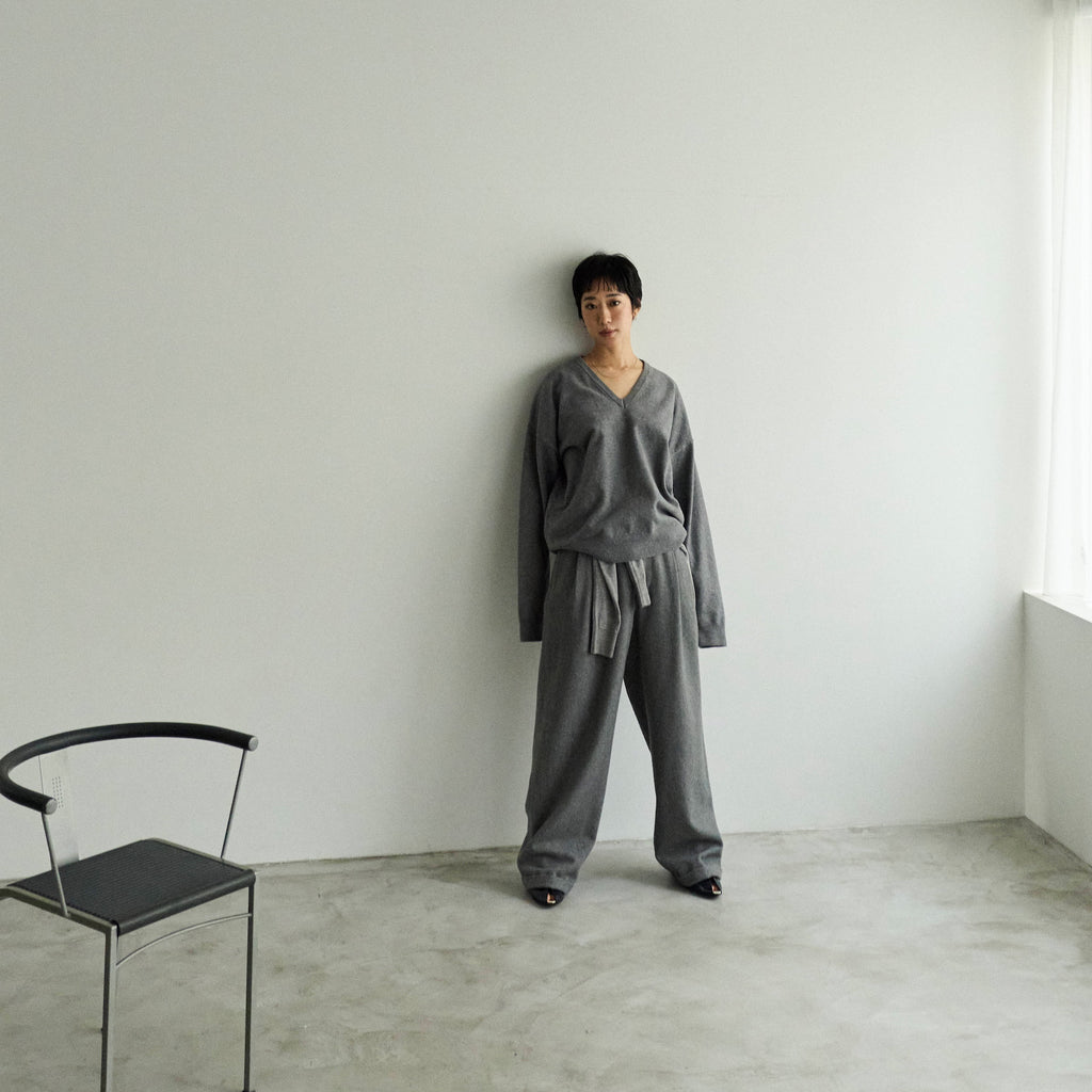 女性らしい抜け感を楽しめるVネックニット。スウェットの様なハリ感と柔らかさを両立した素材で、ラフさの中に上品さを感じる1枚です。シンプルながらも計算された深めのVラインと緩やかなシルエットが、日常のスタイルを自然にアップデートしてくれます。
