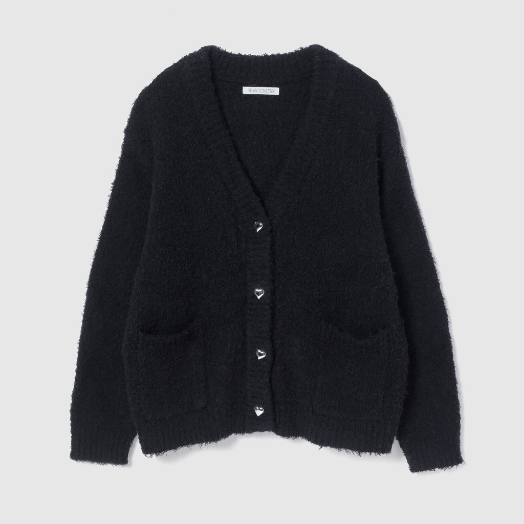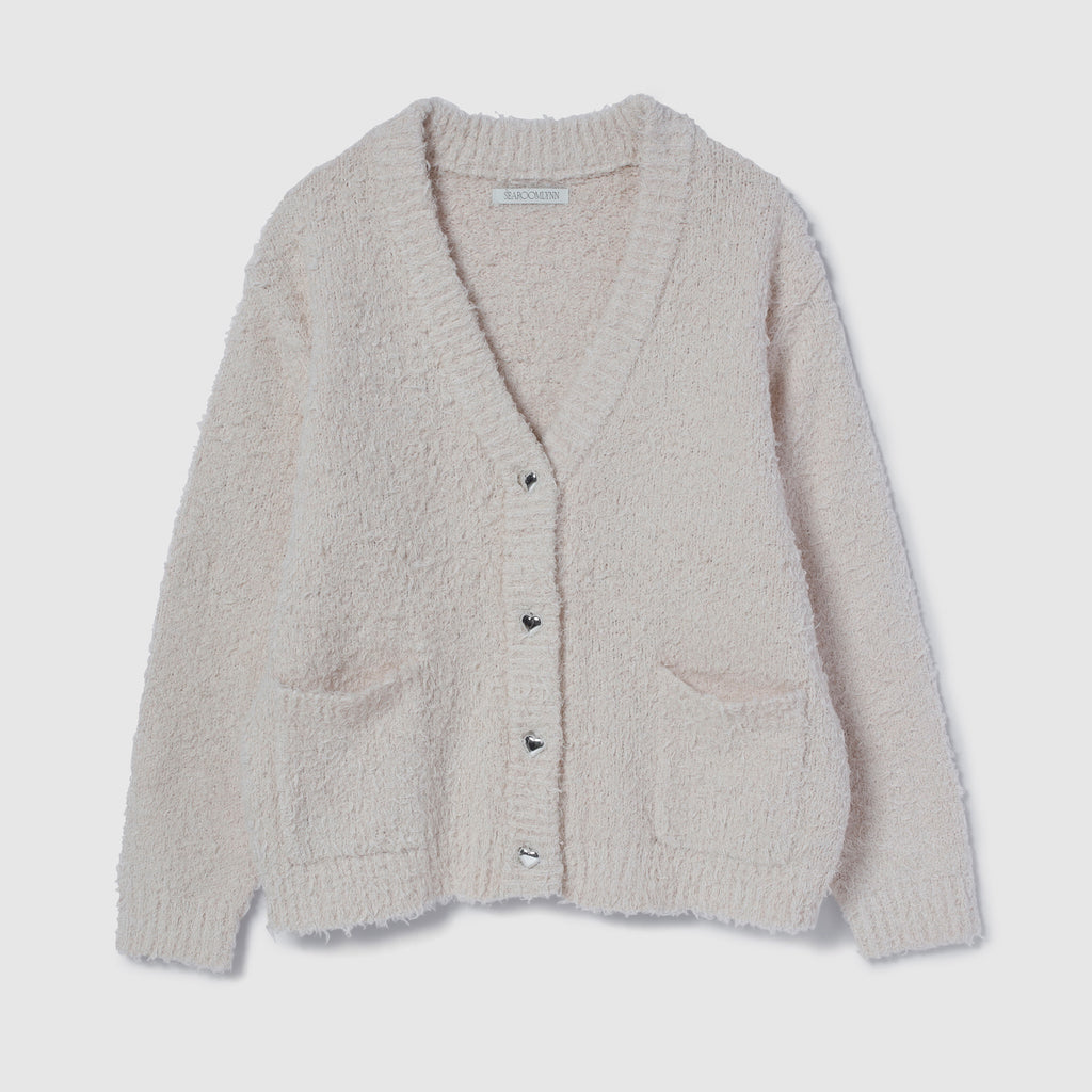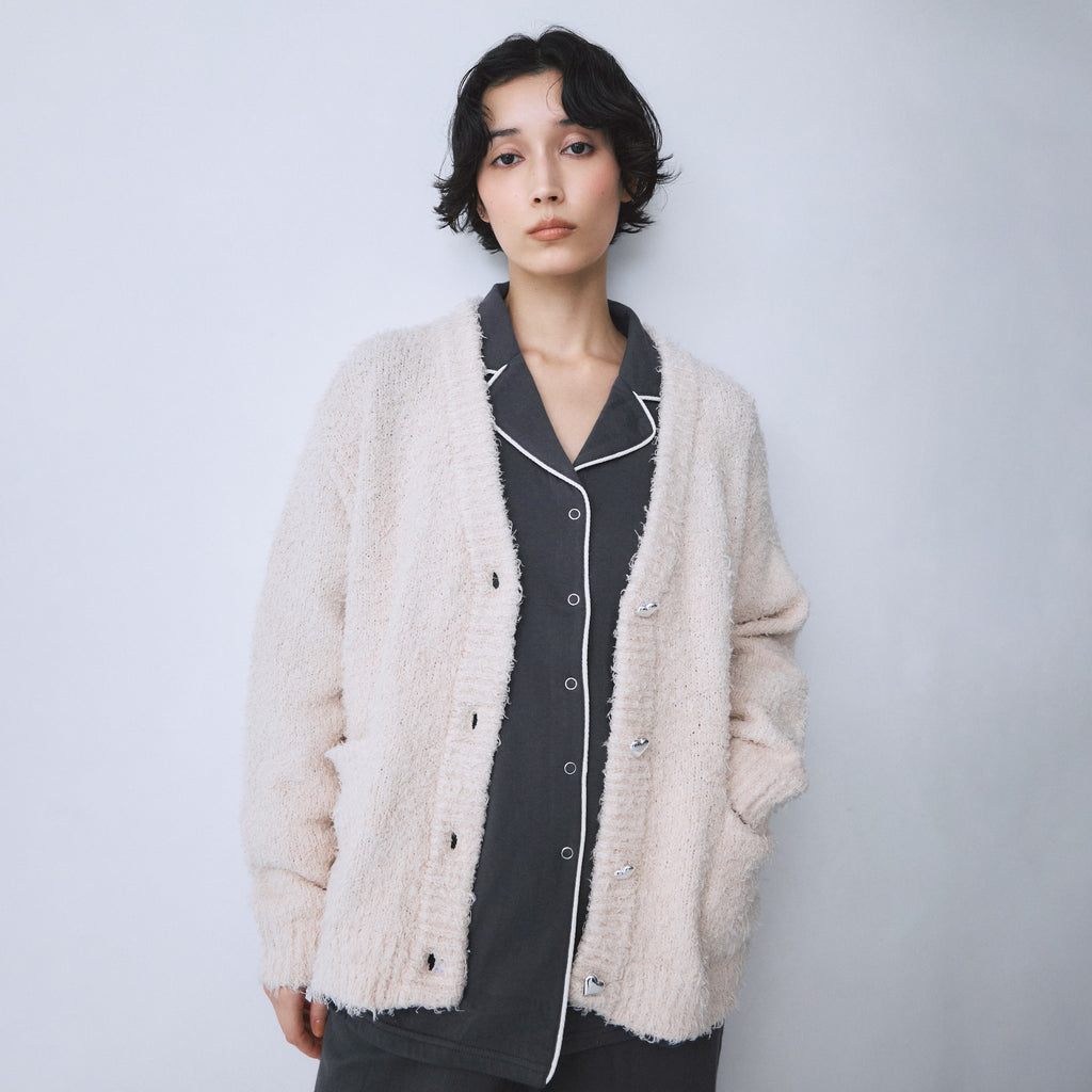 “Cozy(コージー)”という名前のとおり、体を包み込むリラックス感が魅力のニットカーディガン。ところどころに毛足の表情を持たせた優しい風合いが魅力で、軽さと温かさを両立。リラックスシルエットと深すぎないVネック、シルバーのハートボタンがチャームポイントに。