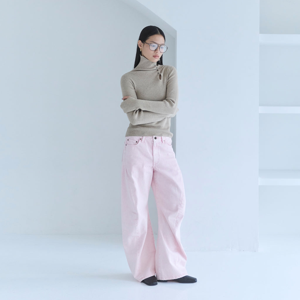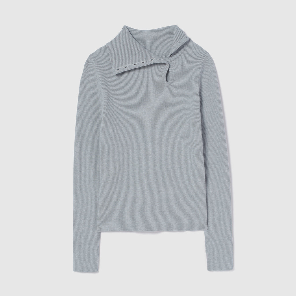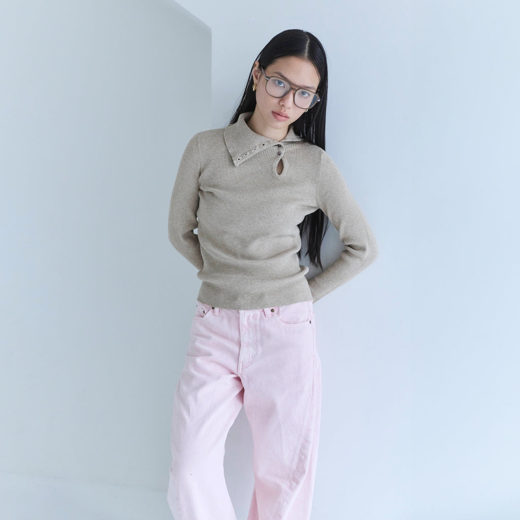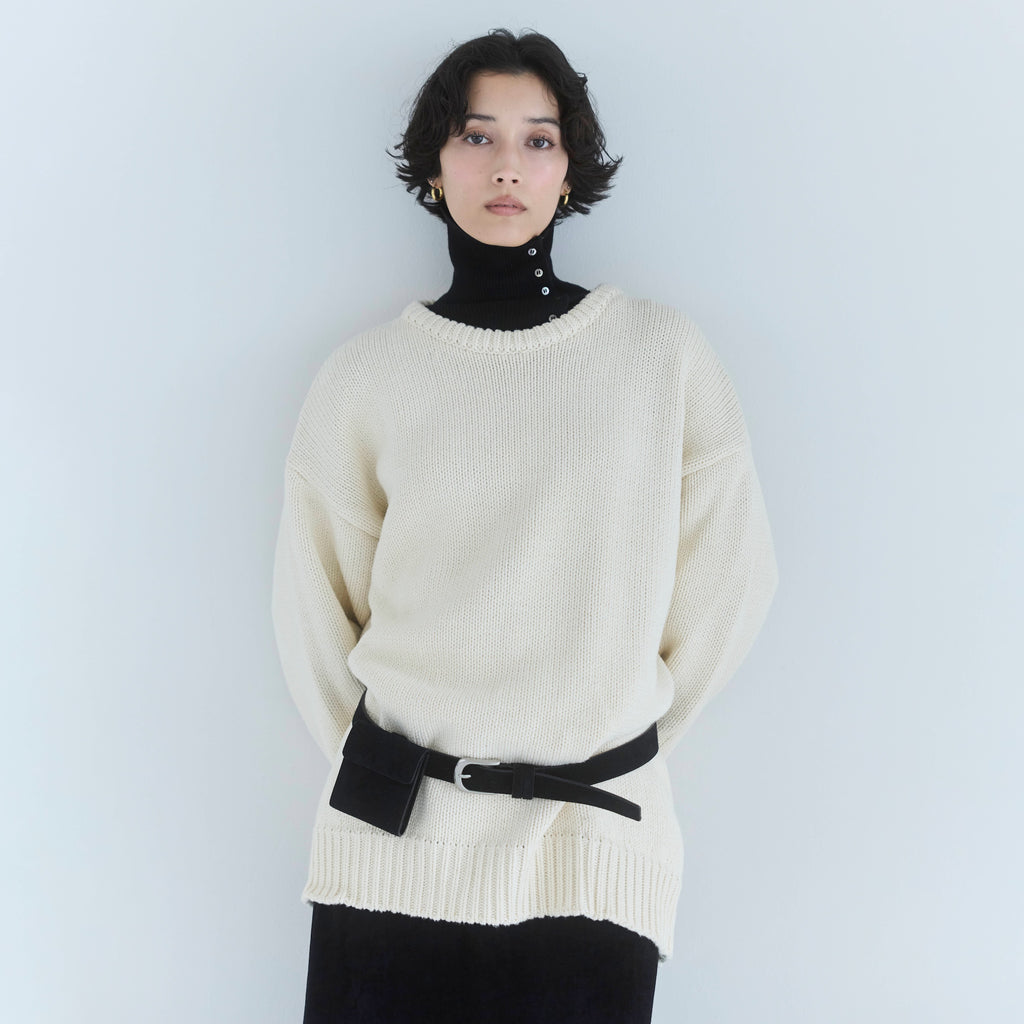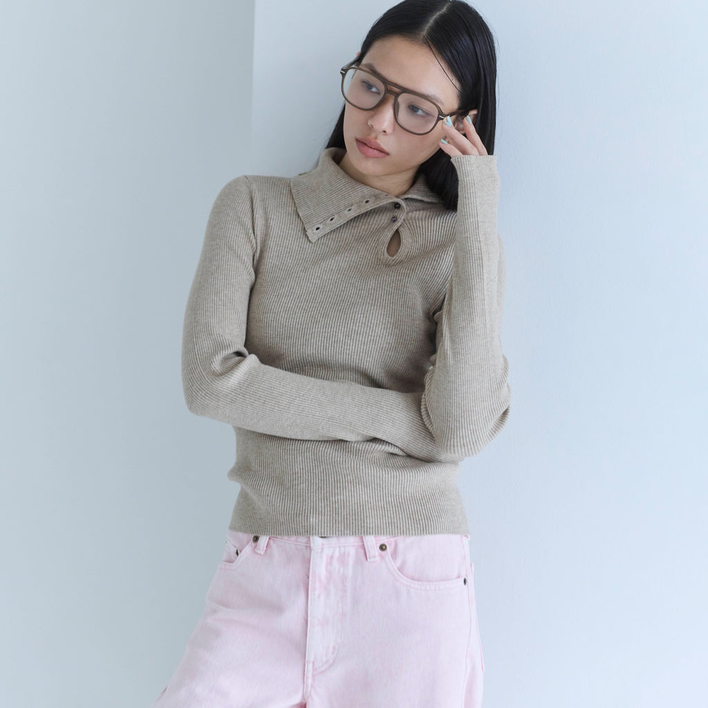 左首元に並んだ小さなシェルボタンと雫型のホールカットが上品なアクセントに。ボタンを留めればタートルネックとして、外せば襟のように開いた抜け感あるスタイルとして、2WAYで楽しめます。シンプルながらも顔周りにニュアンスを添える1枚です。