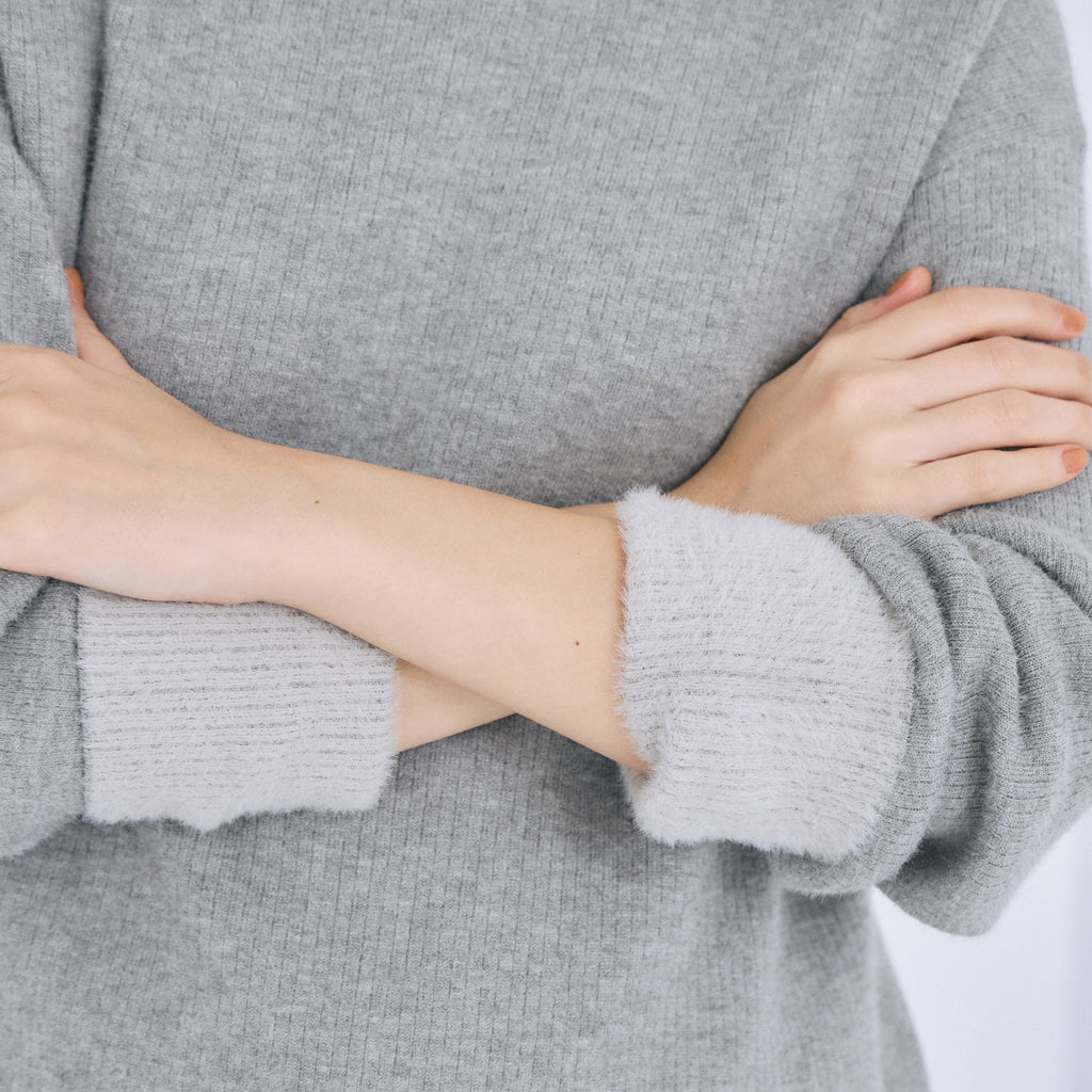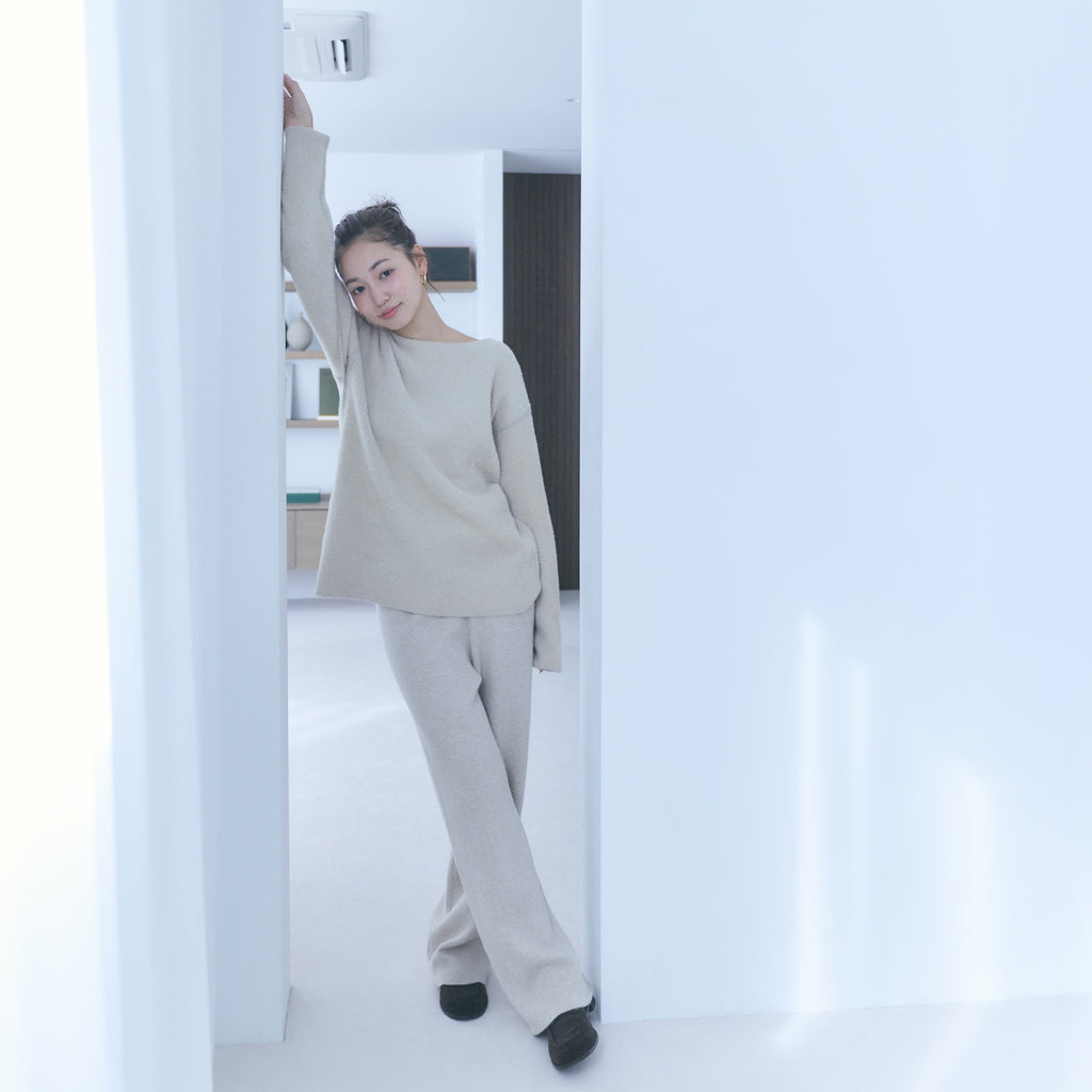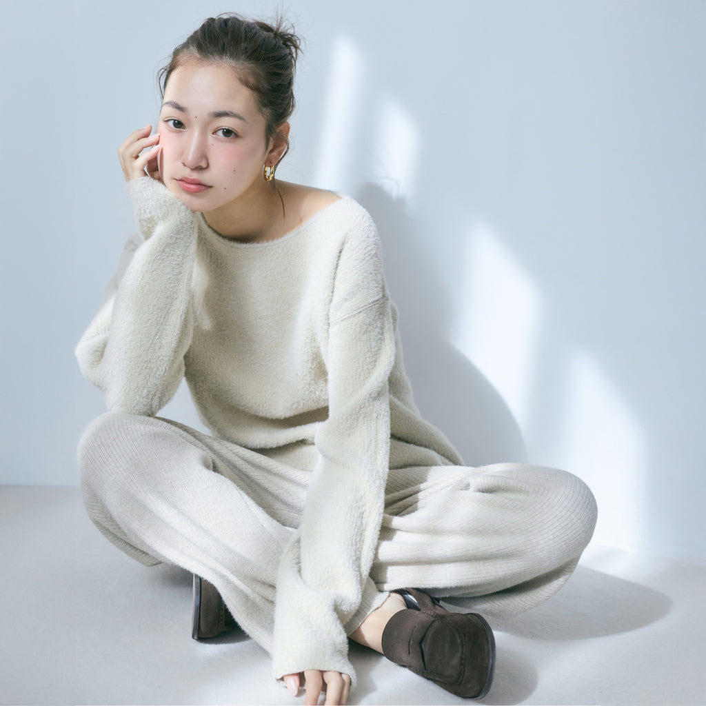 同素材の〈シャギーニットストレートパンツ〉と合わせたセットアップは統一感がありおすすめ。単品ではデニムやスラックスでカジュアルダウン、タイトスカートやレギンスと合わせてチュニック感覚の着こなしも楽しめます。